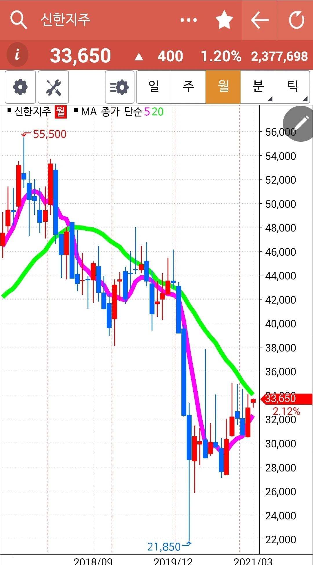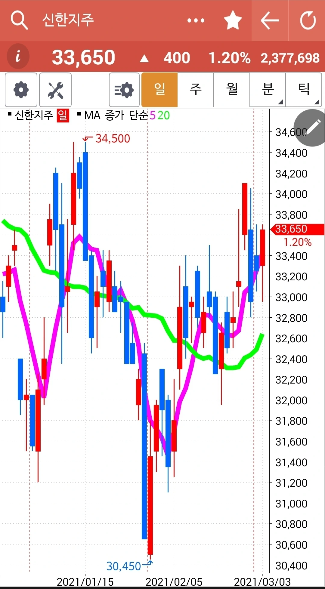 하하 크게 외치고프다. 신한지주 파이팅! 힘내라 신한지주! 5일선이 20일선 한참 위에 있으니 당분간 내가 할 일은 없을 듯싶다. 그래도 두 눈 똑바로 뜨고 행여 5일선이 20일선 아래로 슬그머니 내려가는 일은 없는가 잘 지켜봐야지. 난 아무것도 몰라요 5일선이 20일선 아래로 내려가면 매도할 뿐야요~ 그래 단단히 정신무장을 수시로 해놓아야만 해. 그래야 실천을 하지. 파이팅!