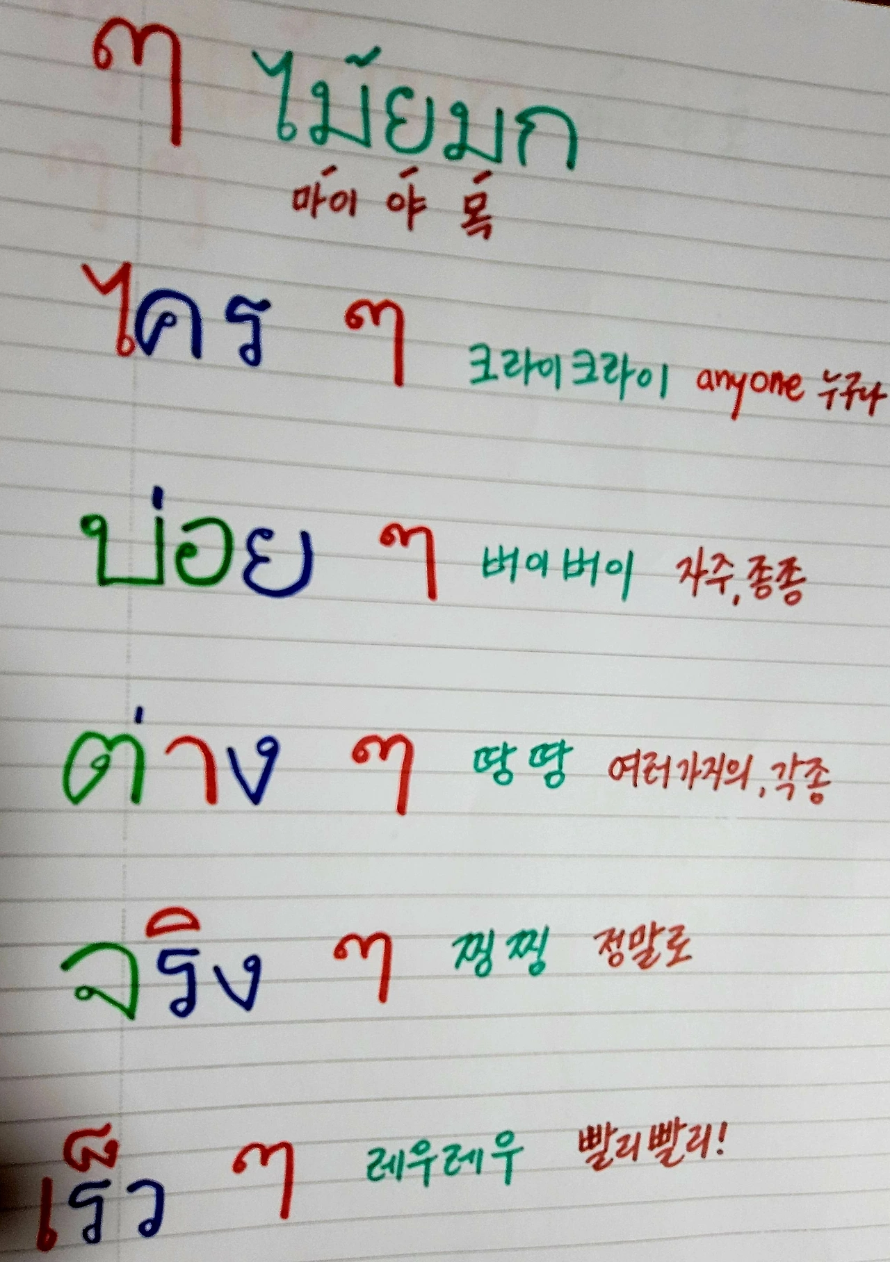 조금 요상하게 생겼지만 잘 외워두자. 빨간색 곡괭이 같은 게 마이야목이고 반복 또는 강조한다. 자, 그럼 배운 단어에 사용해볼까? 우린 크라이를 배웠다. 누구라는 뜻. 크라이를 쓰고 마이야목을 쓰면 크라이를 반복하여 크라이크라이 하게 되고 뜻은 anyone 누구나가 되는 것이다. 하는 김에 마이야목을 사용한 여러 단어를 알아본다. 땅땅 여러 가지의 찡찡 정말로 버이버이 종종 레우레우 빨리빨리!