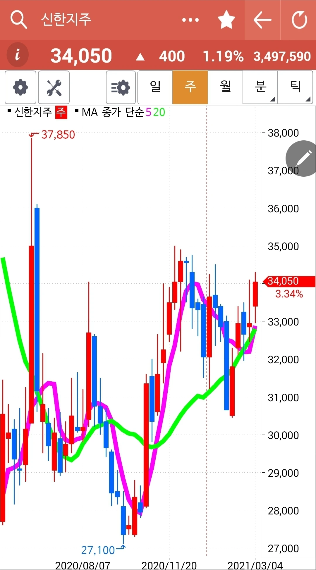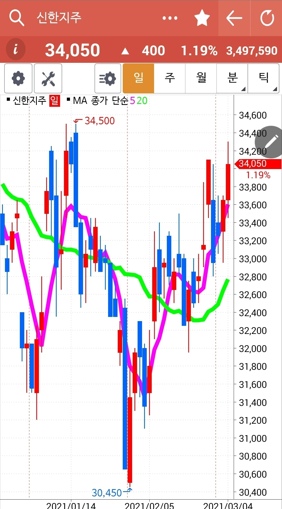 하핫 신한지주 빵! 까지는 아니다 정말. 겨우 400원 1.19프로가 올랐을 뿐이니까. 그래도 나에겐 빵! 빵빵! 빵빵빵!이다. 왜냐하면 여기서 이렇게 전고점을 뚫으며 올라가면 가능성이 있기 때문이다. 이렇게 되면 전전 고점인 34500원은 반드시 건드리게 될 테니까. 빵! 빵빵! 빵빵빵! 신한지주여 멀리멀리 가즈아~ 하하