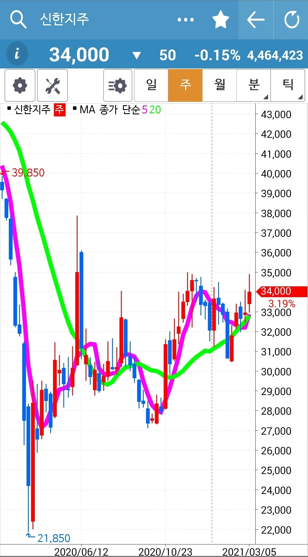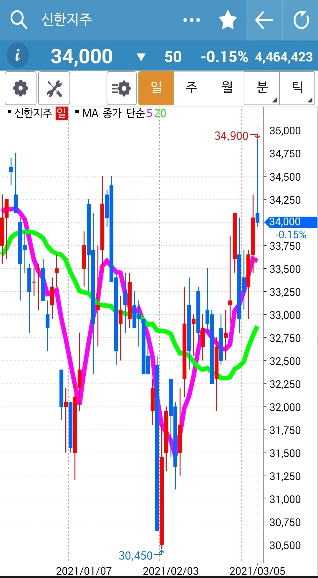 하핫 오늘도 무사히~ 푸하하하 나의 제목 쓰는 실력이라니. 그렇다. 오늘도 무사히 신한지주는 5일선이 20일선 위를 지켜주었기에 난 행동할 게 없었다는 말이다. 전 고점을 가볍게 넘긴 것 까지는 좋았으나 뒤에 많이 밀렸다. 급기야 마이너스를 기록했다. 그렇다면 전고점 근처에서 일단 수익을 취했어야 할까? 아, 복잡하게 생각하지 말자. 이런저런 걸 끼워넣기 시작하면 내가 그토록 지키려 하는 5일선이 20일선 아래로 내려가면 매도한다는 그 원칙이 어느새 흐지부지될 가능성도 있기 때문이다. 그래. 단순하게! 5일선이 20일선 위에 있으면 매수 유지! 내려가면 매도! 지극히 단순한 난 그거 하나는 지킬 수 있다. 암. 파이팅!