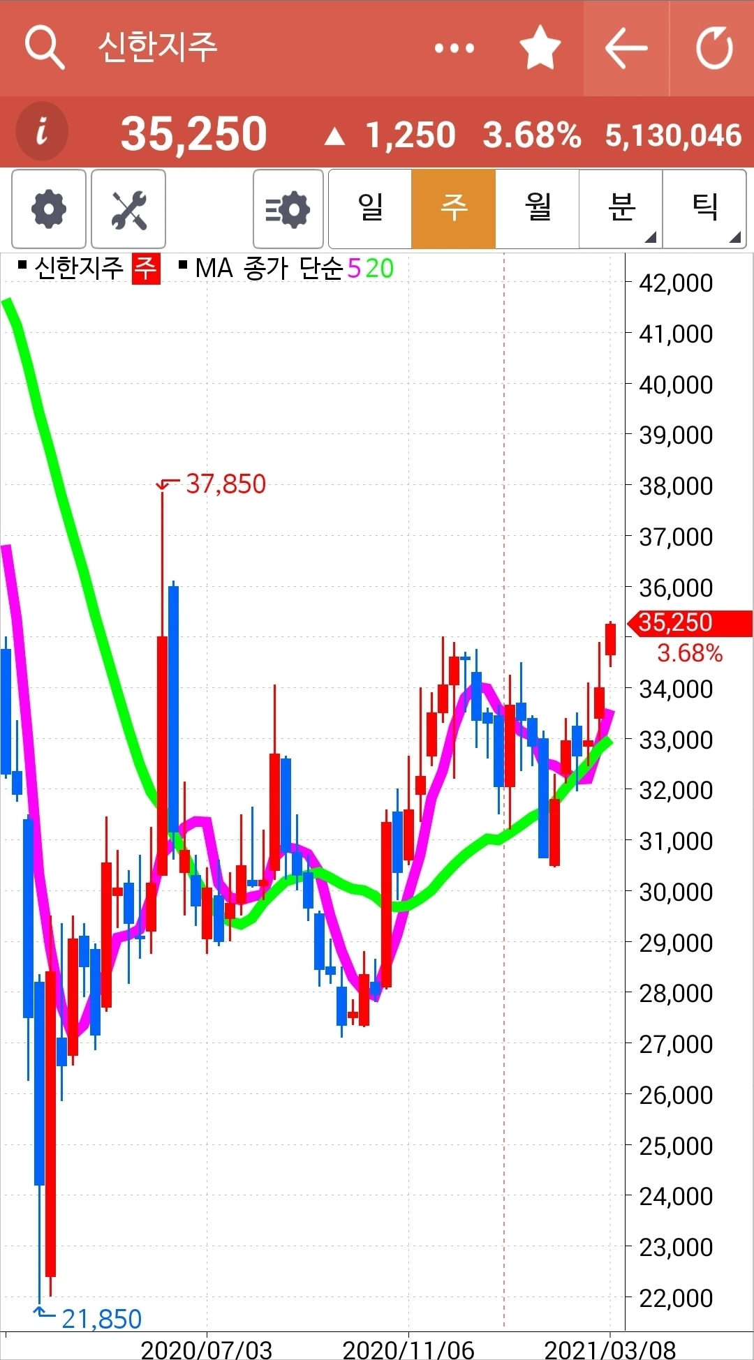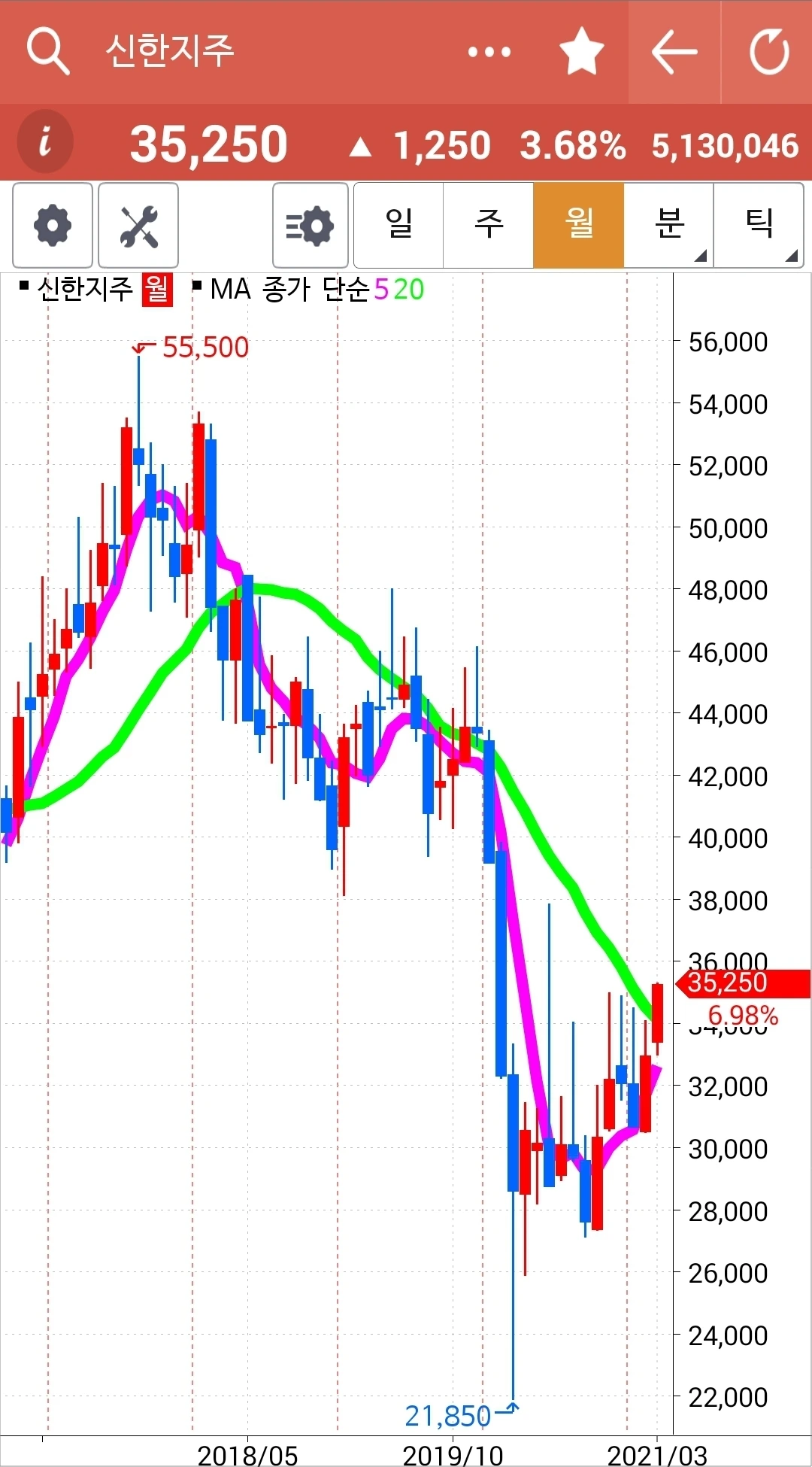 전 고점을 빵! 뚫고 올랐으니 오홋 올라갈 일만 남은 것 아닐까. 너무 가파른가? 조정이 필요할까? 주봉에서 확실하게 골든크로스가 났고 전고점을 뚫었고 불안할 이유가 없다. 다만 월봉이 아직 골든크로스가 나지 않은 상태지만 조만간 빨간 5개월선이 초록 20개월선을 뚫을 수 있겠다. 어쨌든 주가는 20개월선을 가볍게 넘기고 있다. 파이팅!!!