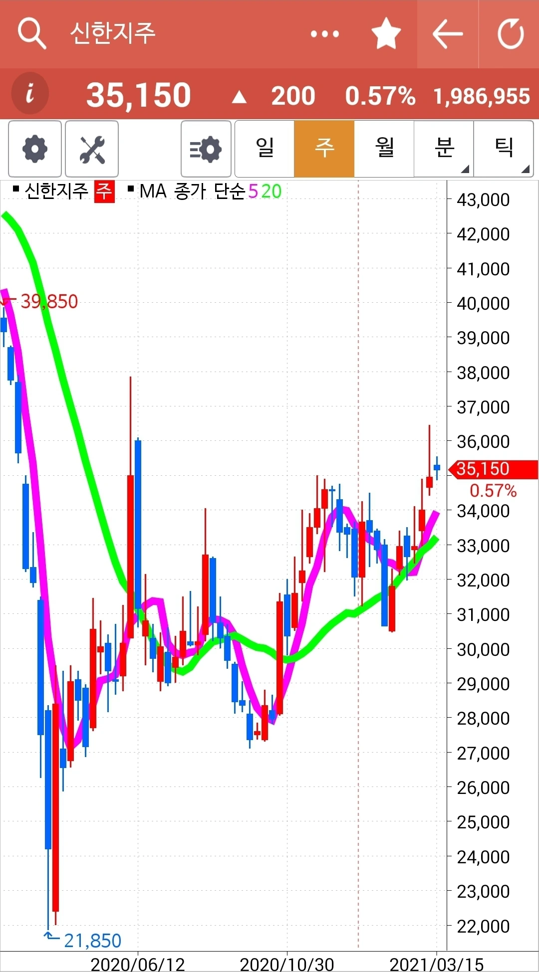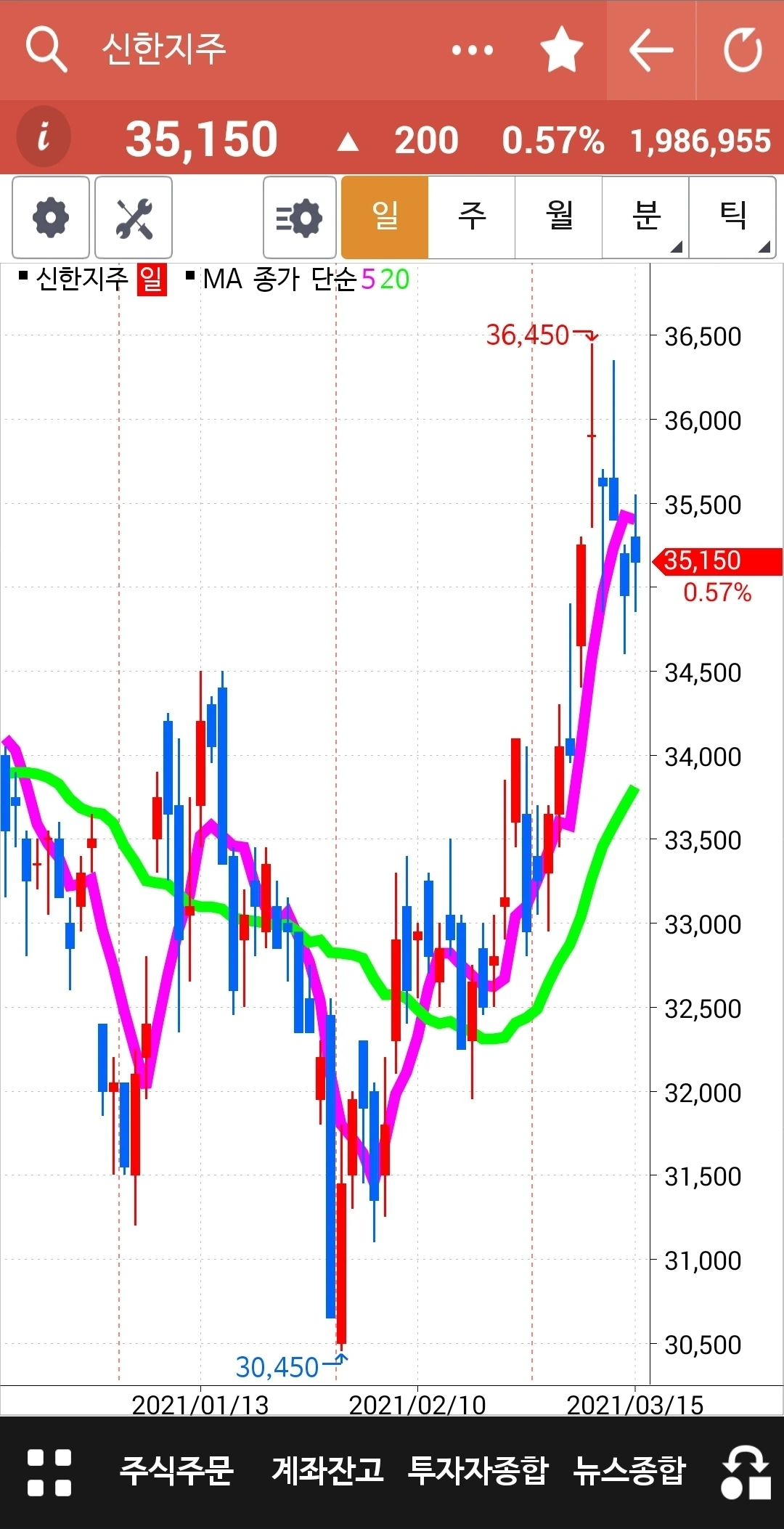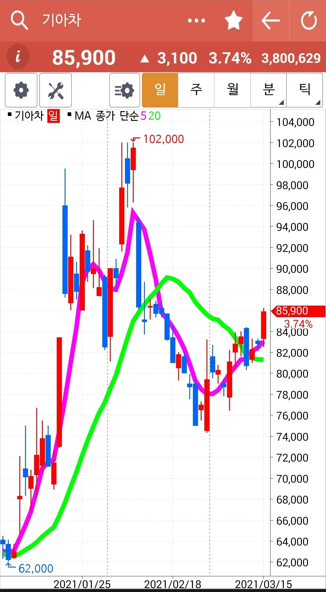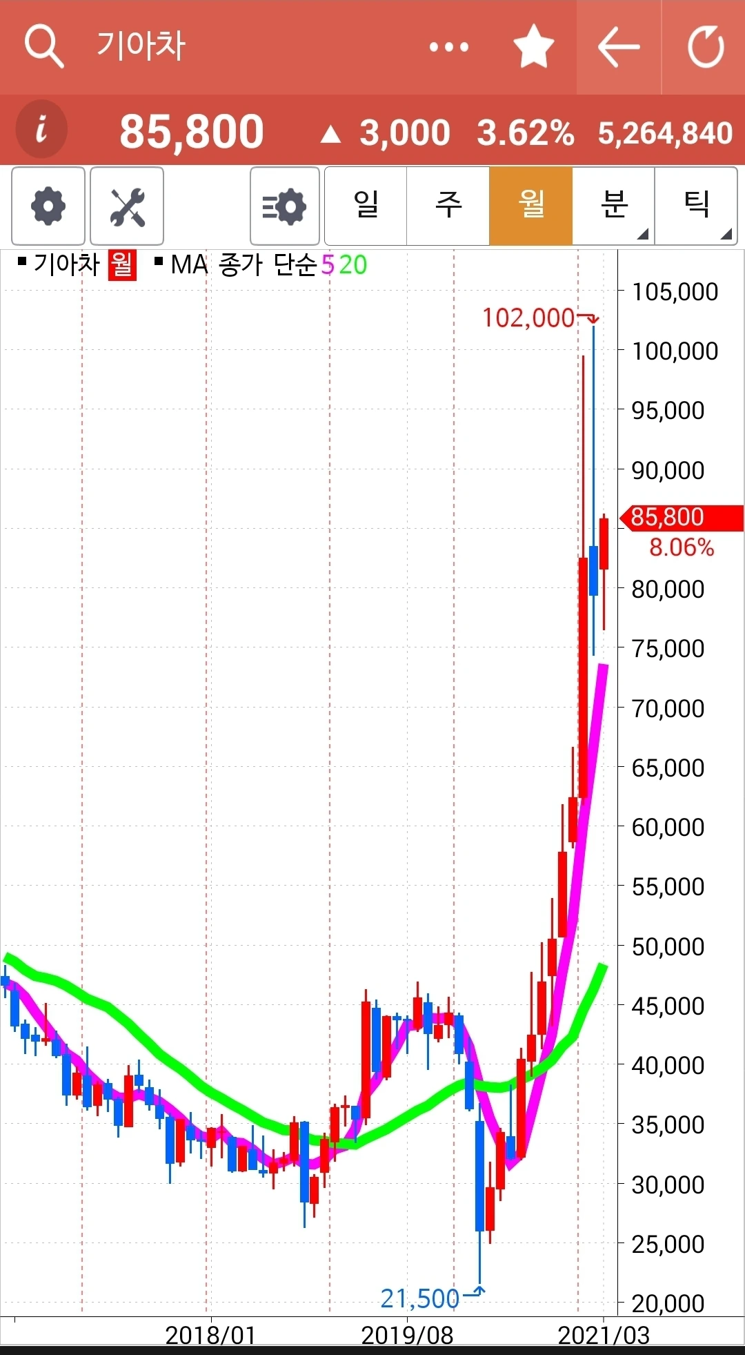아직 5일선이 20일선 위에 있으니 내가 할 일은 없다. 그냥 지켜볼 뿐. 주봉 월봉 모습이 올라가기 시작한다면 꽤 오래갈 수 있겠다 싶다. 그러나 예측은 말자. 차트 형성되는 대로 실행할 뿐이다. 내가 아는 딱 하나. '난 아무것도 몰라요~ 5일선이 20일선 아래로 내려가면 매도할 뿐야요~' 파이팅!!!