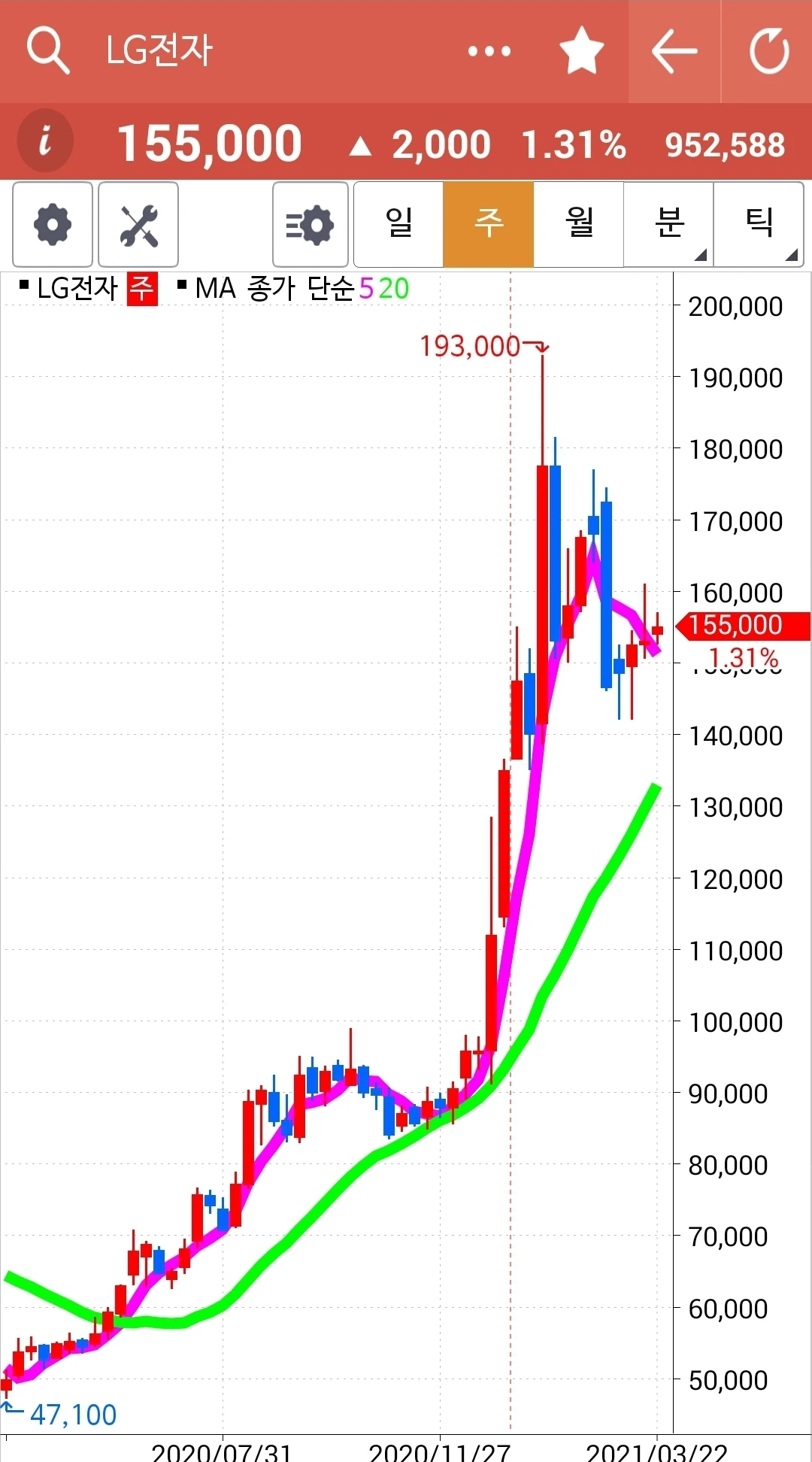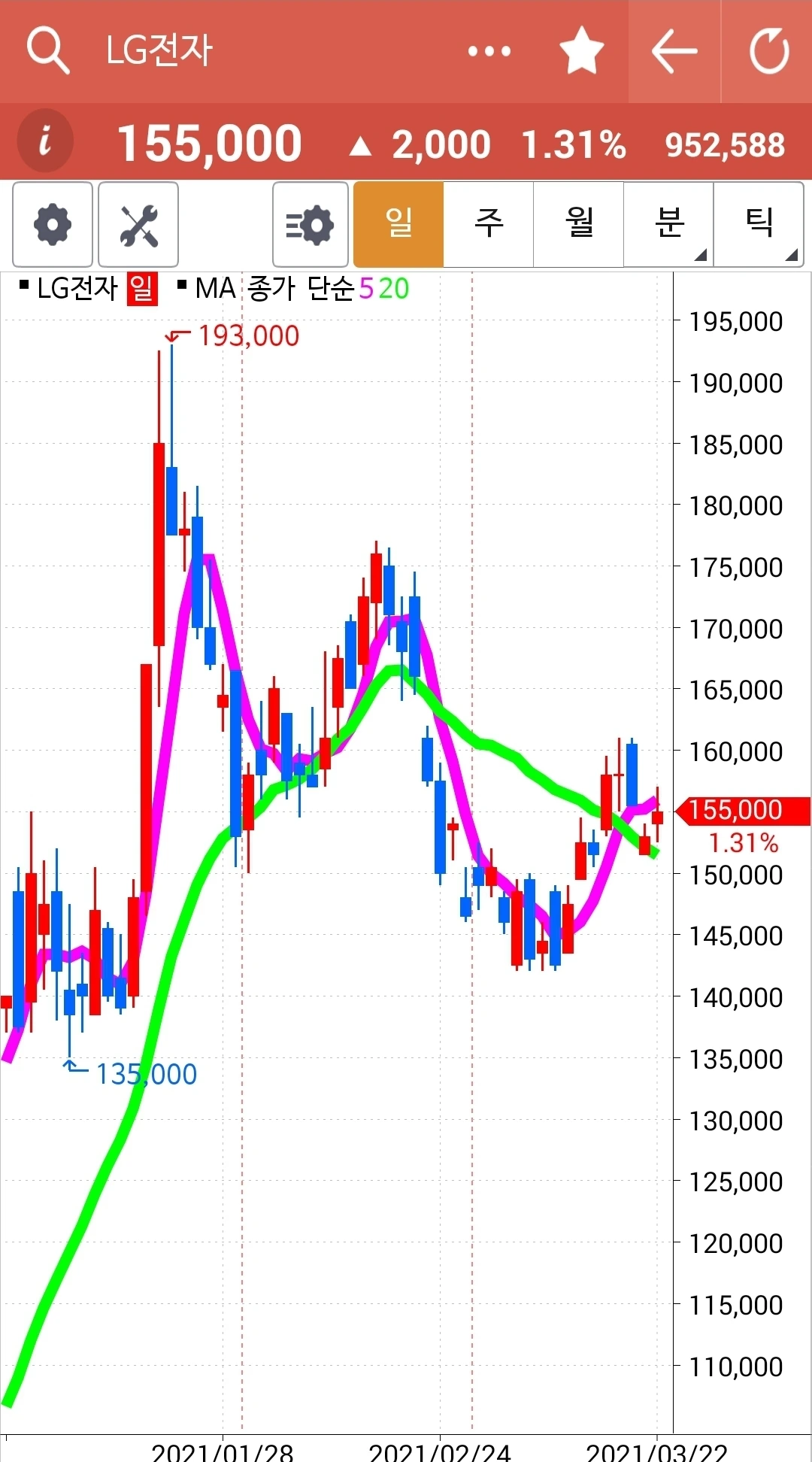 5일선이 20일선 위로 빵 올라 매수하게 하고는 그 이후 온통 고난만 주고 있다. 그래도 어쩌랴. 5일선이 20일선 위를 지키고 있느니 내가 할 일이란 아무것도 없는 걸. 그러나 두고 보시랏. 아무리 내가 LG 사랑이라도 5일선이 20일선을 내리꽂는 순간 난 냉정하게 돌아설 테니까. 그것만 할 줄 알면 살아남을 수 있다. 파이팅!