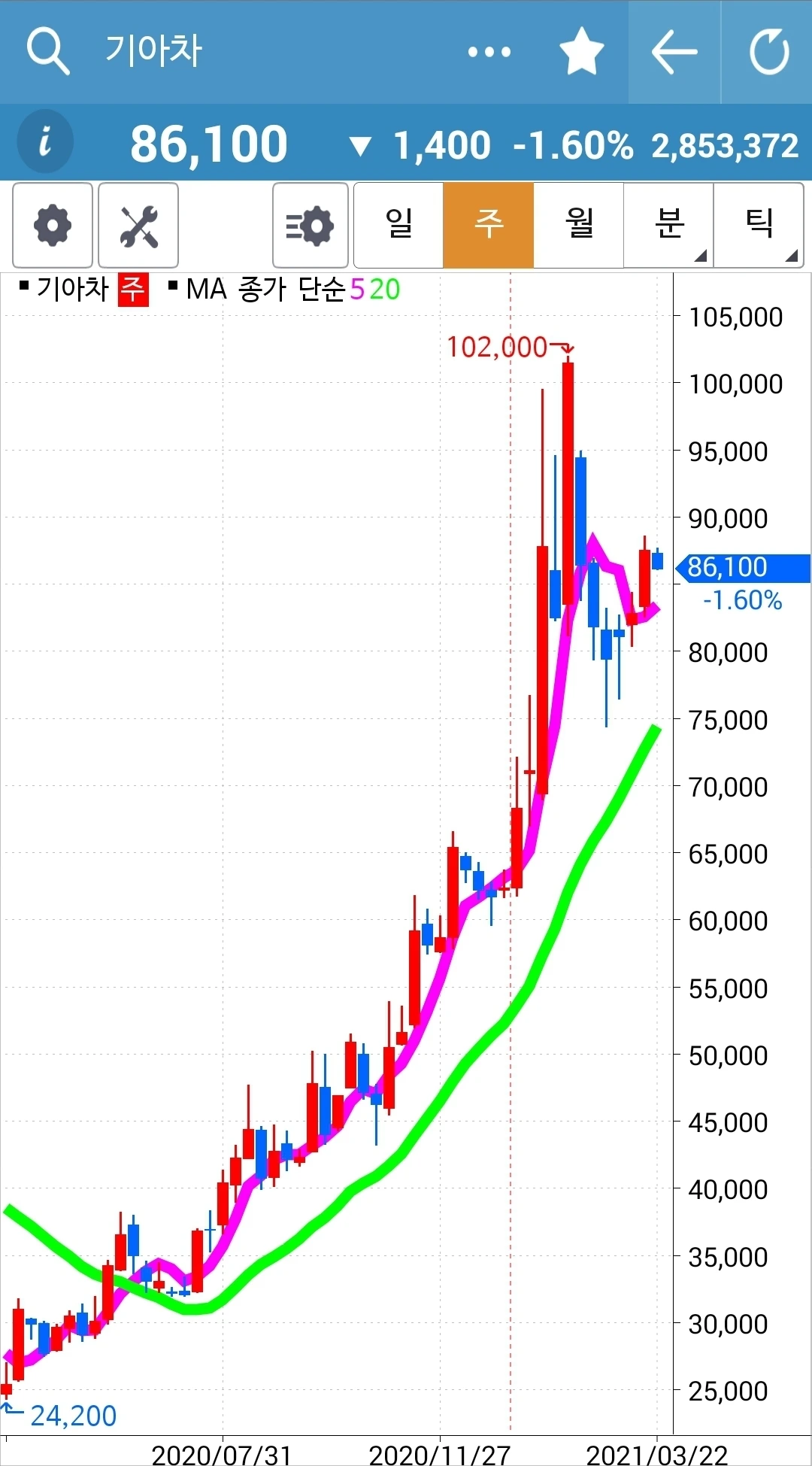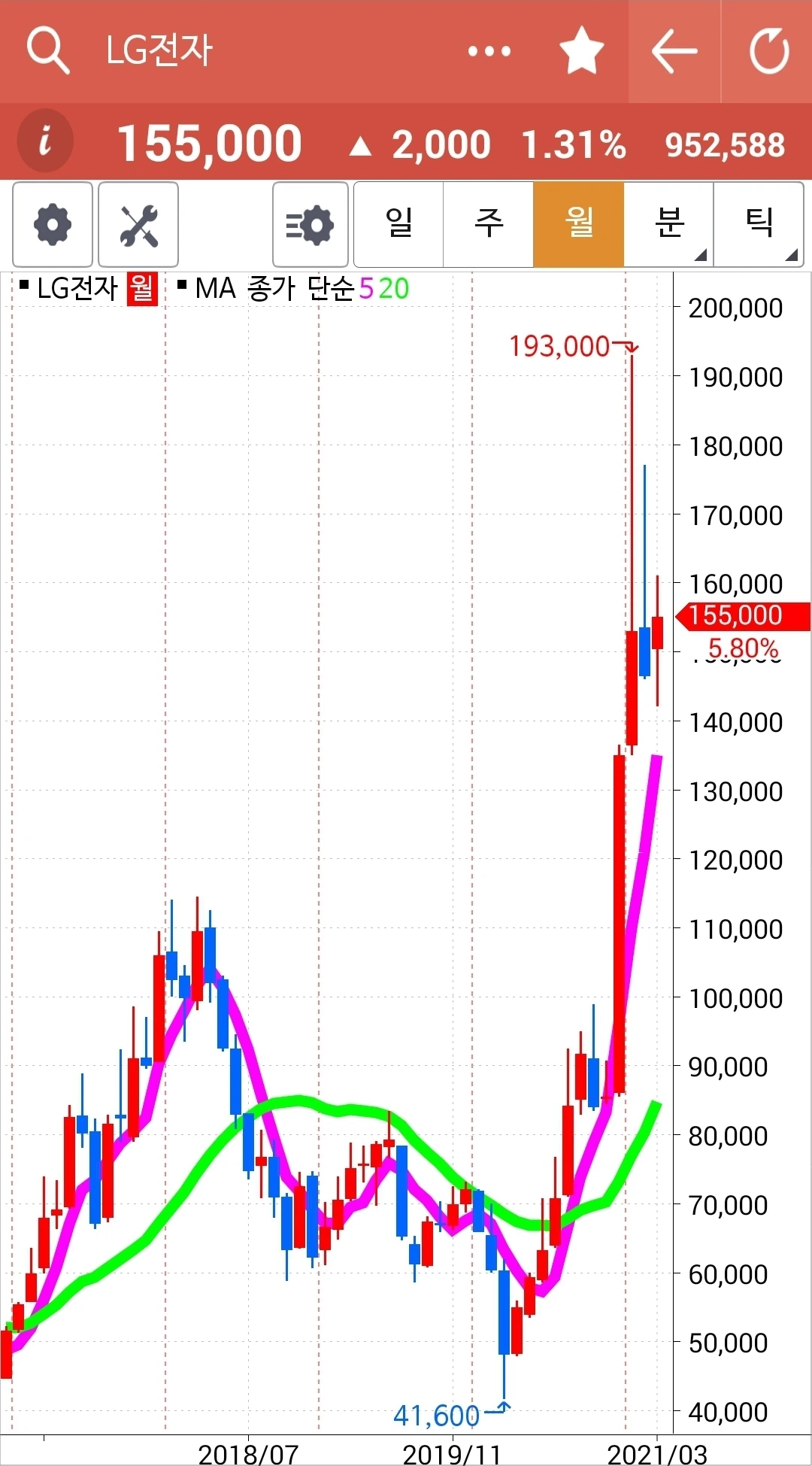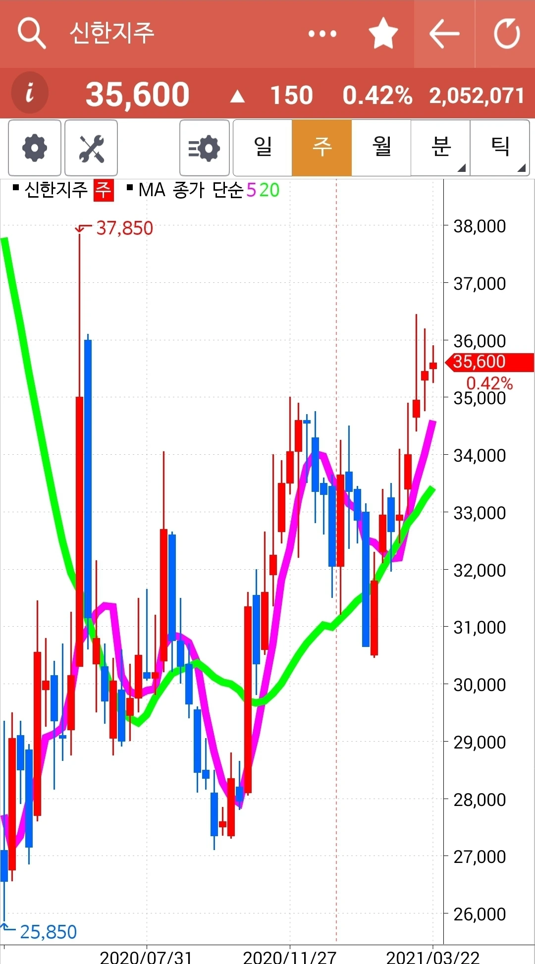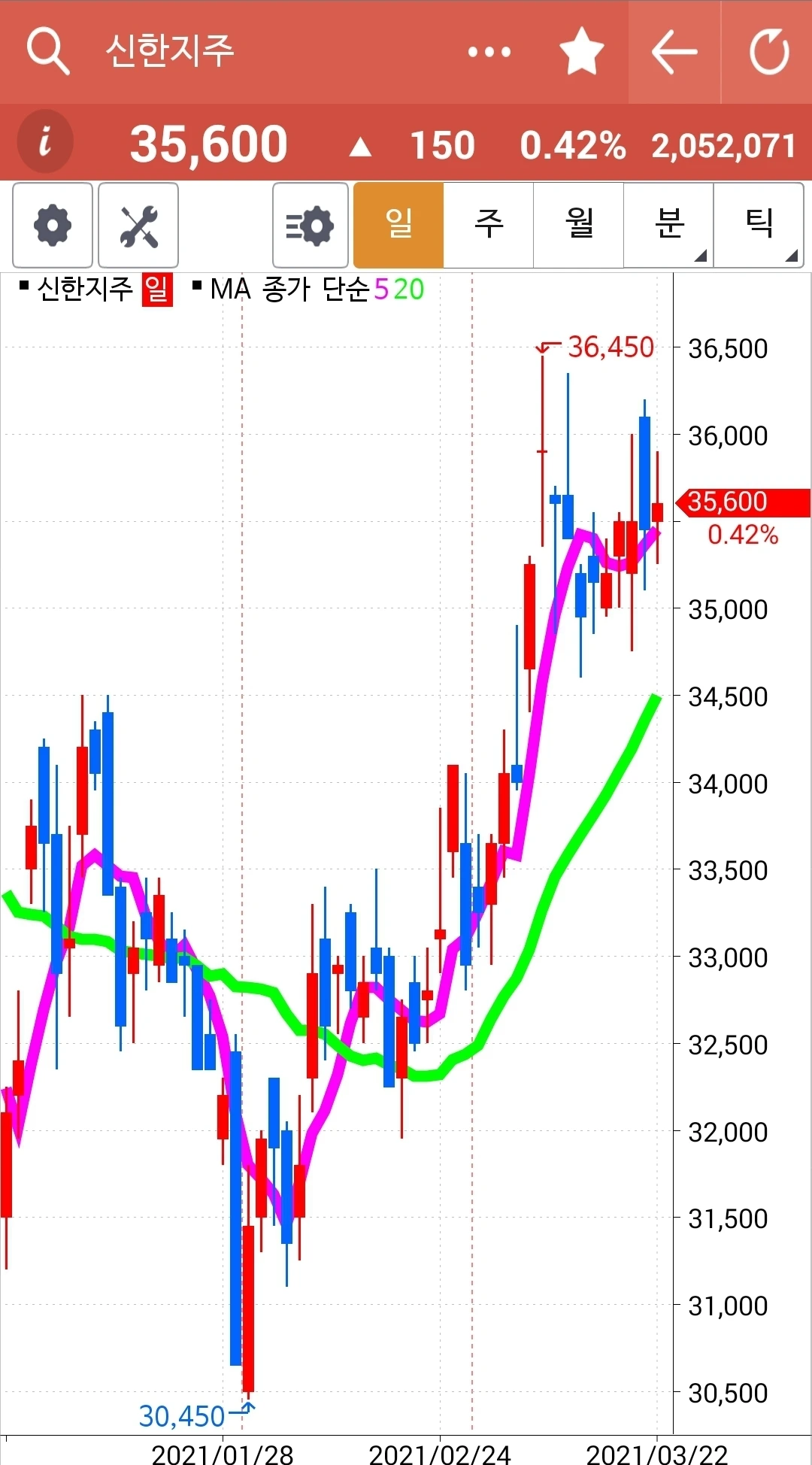 일봉 주봉 월봉 다 매력적이다. 5일선이 20일선 위를 든든히 지키고 있으니 당분간 지켜볼 뿐이다. 파이팅!