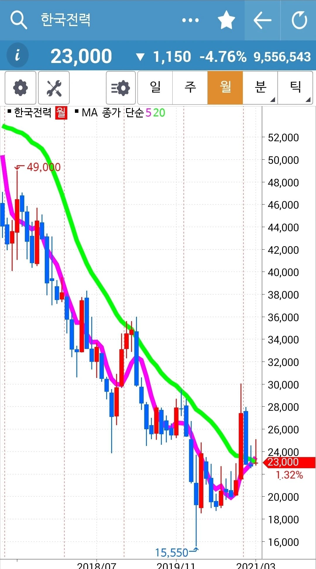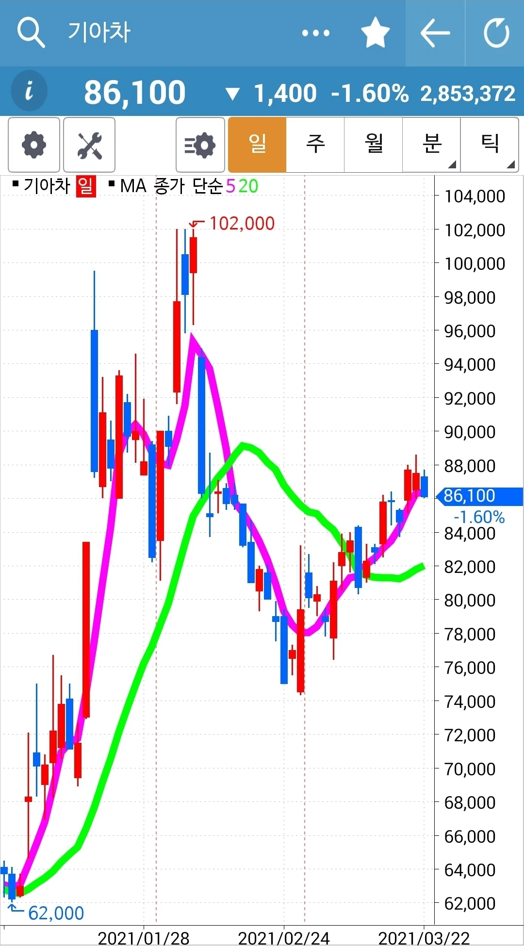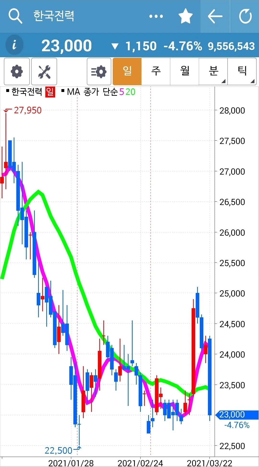 카~ 어떻게 이런 모습이 될까? 빵! 올라갔다고 꼭대기에서 들어간 나는 그야말로 고통 중에 아주 쓴 고통을 맛보는 중이다. 이렇게 힘차게 올라간 차트가 고스란히 그 수익을 반납할 수도 있는 거구나. 하염없이 내려오기만 한 하락의 힘이 아직 그치지 않은 걸까. 아, 쳐닝 현상인가? 바닥이고 꼭지고 가까웠을 때 주가가 오르락내리락 그야말로 요동치며 춤추는 것. 어떻게 진행되는가 잘 지켜보자. 파이팅!