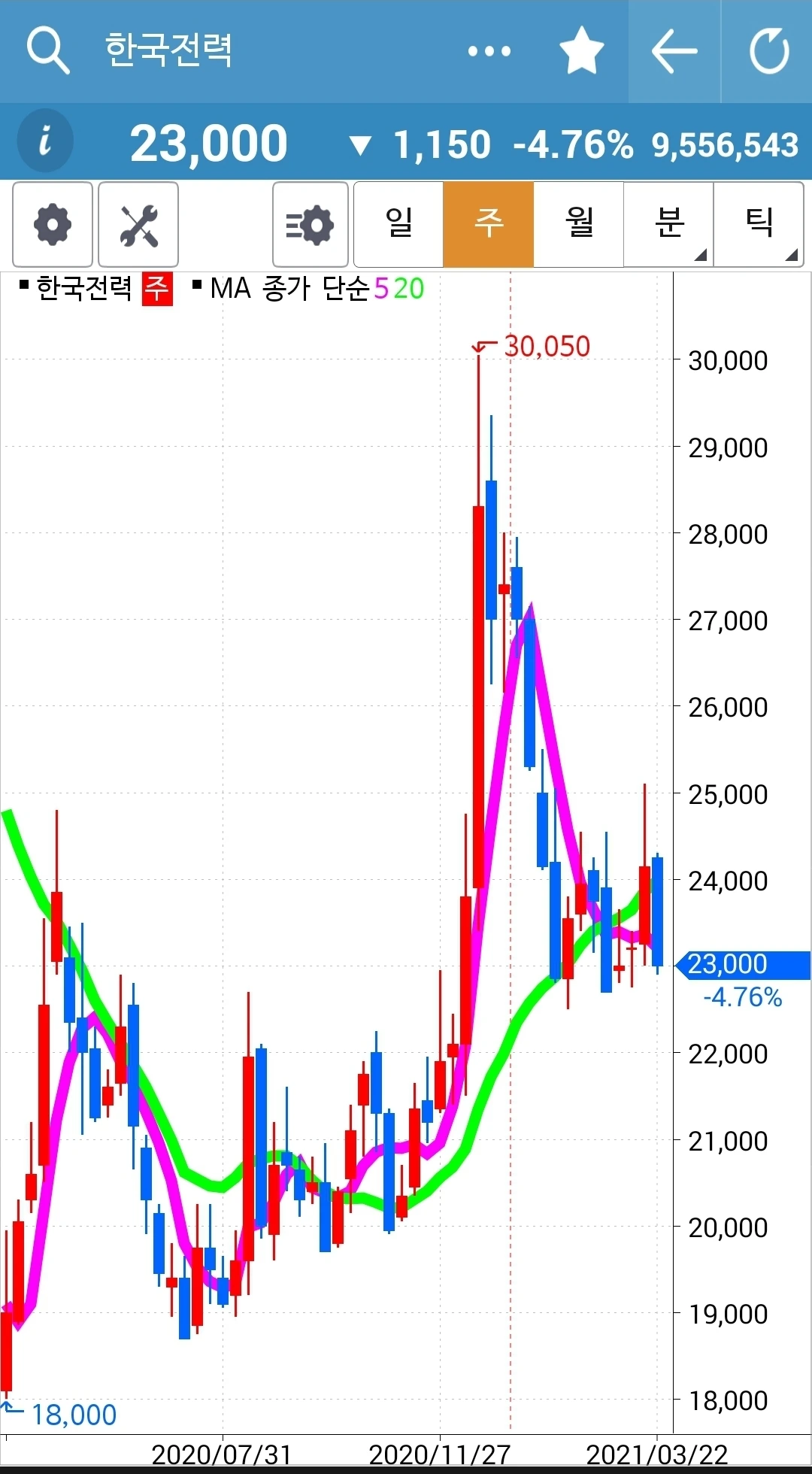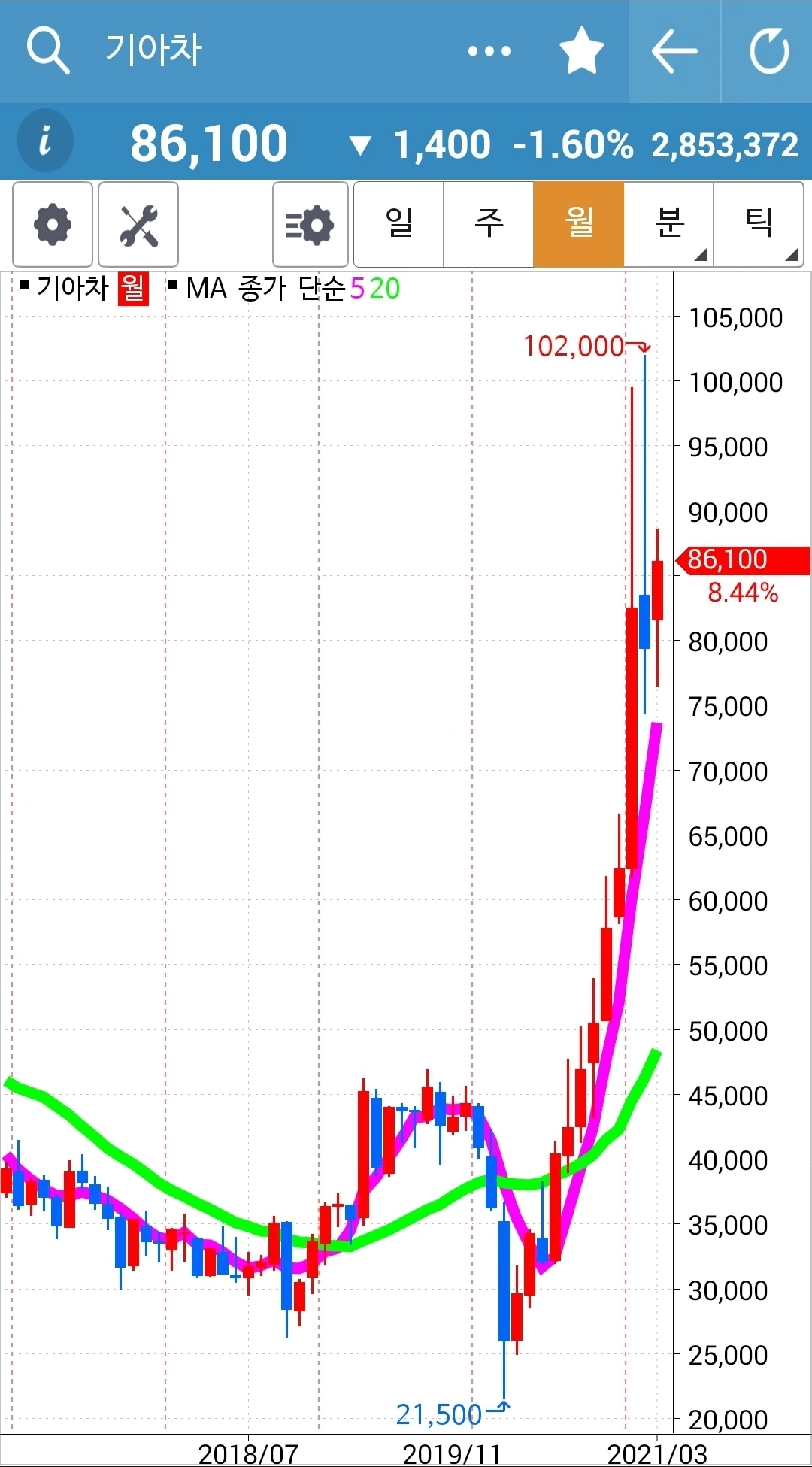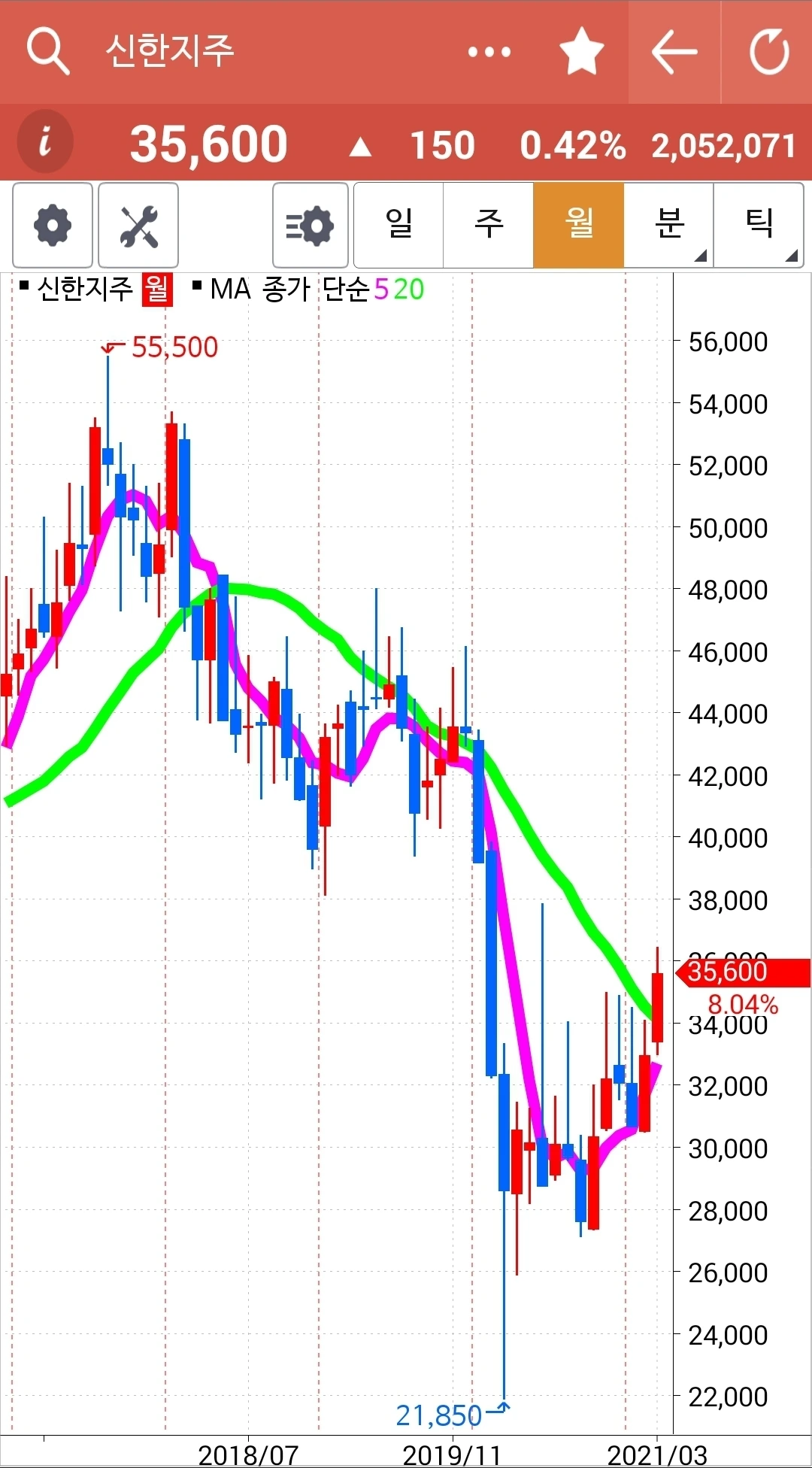 카~ 어떻게 이런 모습이 될까? 빵! 올라갔다고 꼭대기에서 들어간 나는 그야말로 고통 중에 아주 쓴 고통을 맛보는 중이다. 이렇게 힘차게 올라간 차트가 고스란히 그 수익을 반납할 수도 있는 거구나. 하염없이 내려오기만 한 하락의 힘이 아직 그치지 않은 걸까. 아, 쳐닝 현상인가? 바닥이고 꼭지고 가까웠을 때 주가가 오르락내리락 그야말로 요동치며 춤추는 것. 어떻게 진행되는가 잘 지켜보자. 파이팅!