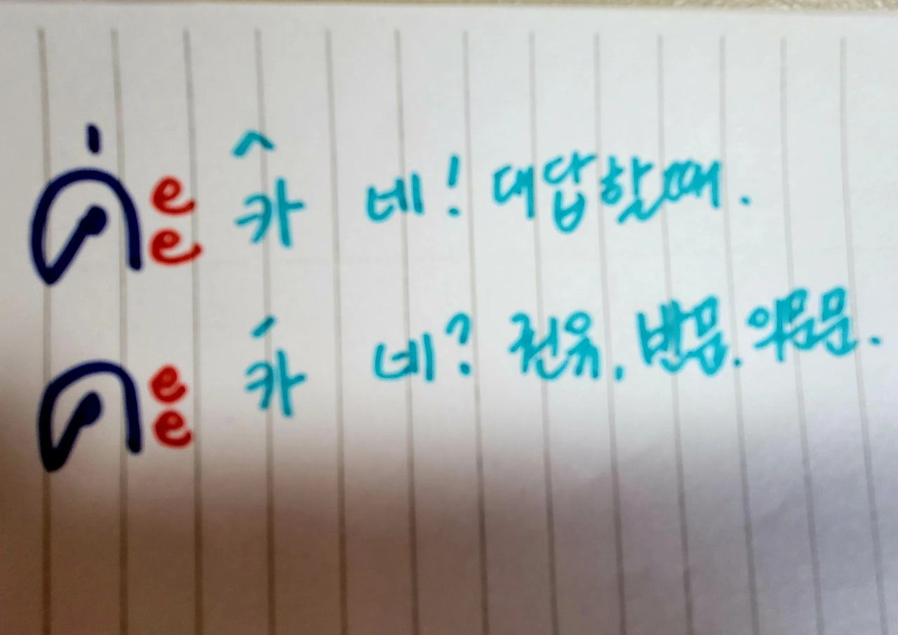 그 옛날 학창 시절이 생각나는 단어들이다. 말을 공손하고 정중하게 할 때 남자는 크랍을 여자는 카를 문장 끝에 붙여준다. 대답을 할 때는 예라는 의미를 가지며 이때는 문장의 앞에 위치한다.