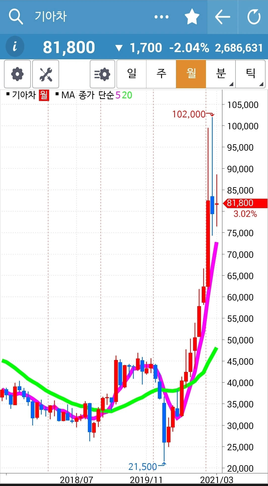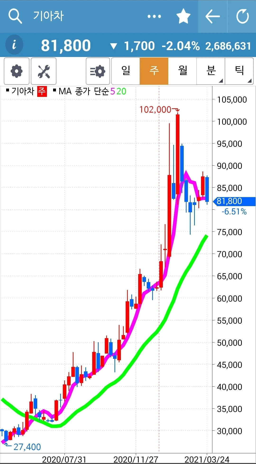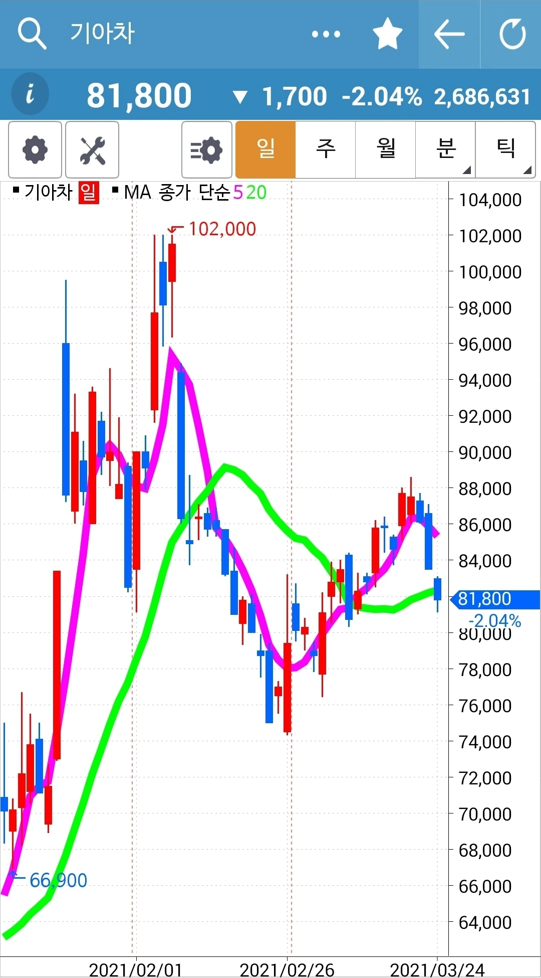 그야말로 기아차 또 뚝!이다. 뚝뚝! 떨어졌다. 하 미치겠다. 주가가 20일선 아래로까지 내려갔다. 물론 5일선은 아직 20일선 위에 있기에 탈락하지 않았지만 위태위태하다. 좀 쉴 줄 알아야 하는데 너무 꽉꽉 채우고 있는 건 아닐까 싶다. 조만간 탈락자가 많이 생길 것 같다.