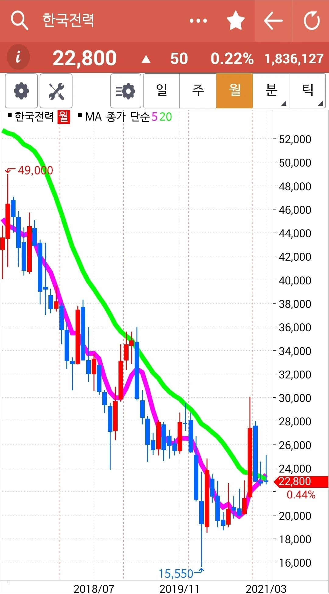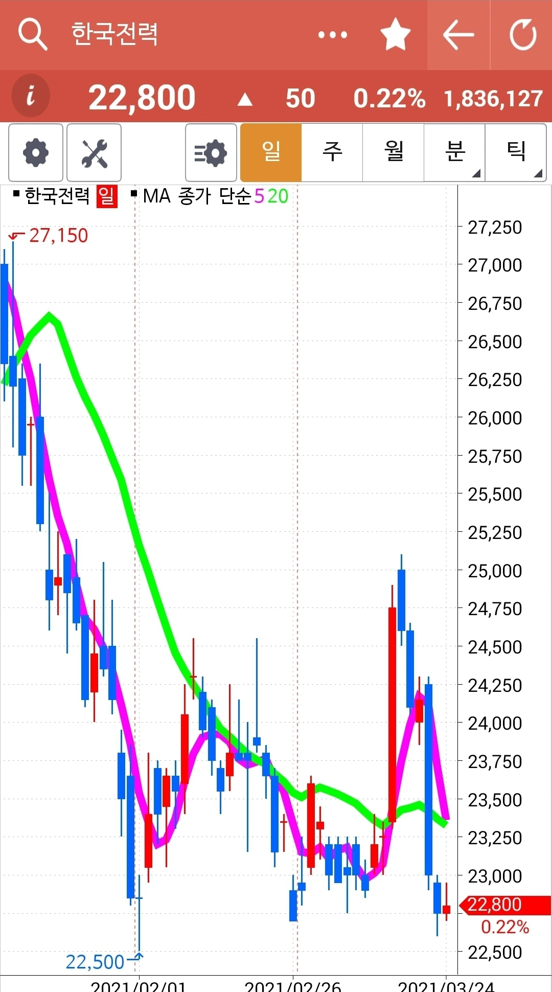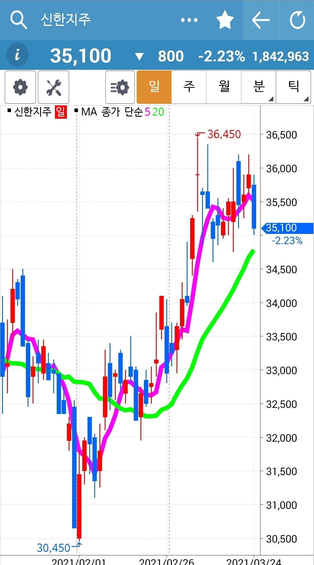 그 긴 음봉에 코딱지만 한 양봉이라. 내일이면 5일선이 20일선을 뚫고 내려오겠다. 아무리 왔다 갔다 하다 올라갈 것처럼 보여도 난 일단 5일선이 20일선을 건드리면 나오는 원칙이므로 손실이 커도 나오고야 말겠다.