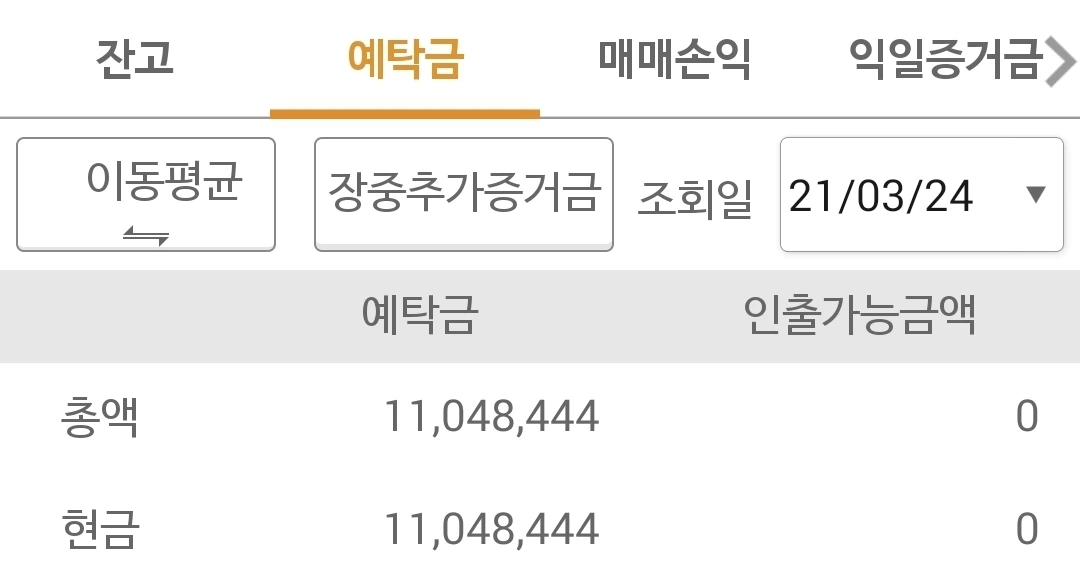 사진 3. 선물 주식 예탁금. 1,100 만원대로 추락했다. 음. 큰일 났다.