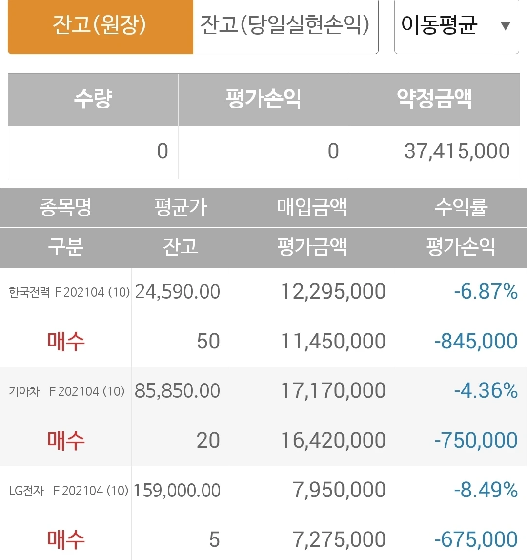 사진 2. 선물 주식. 몽땅 시퍼렇다. 이럴 땐 쉬어주어야 하는데. 에구.