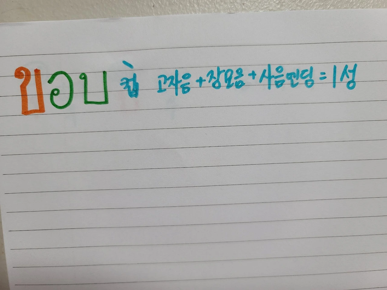 컵이 완성되었다. 키읔의 커카이 모음 어를 어앙으로 그리고 비읍 받침 버바이마이. 성조는 어찌 될까? 컵에서 커카이가 고자음. 어앙의 어는 장모음 그리고 버바이마이 비읍 받침의 이것은 발음할 때 목이 칵 막혀버리는 사음. 그러니까 공식 중자음 + 장모음 + 사음엔딩= 1성 low tone이다. 낮은음에서 더욱 내려가며 팍 깔아주는 바리톤급으로 컵 이렇게 발음해야 한다.