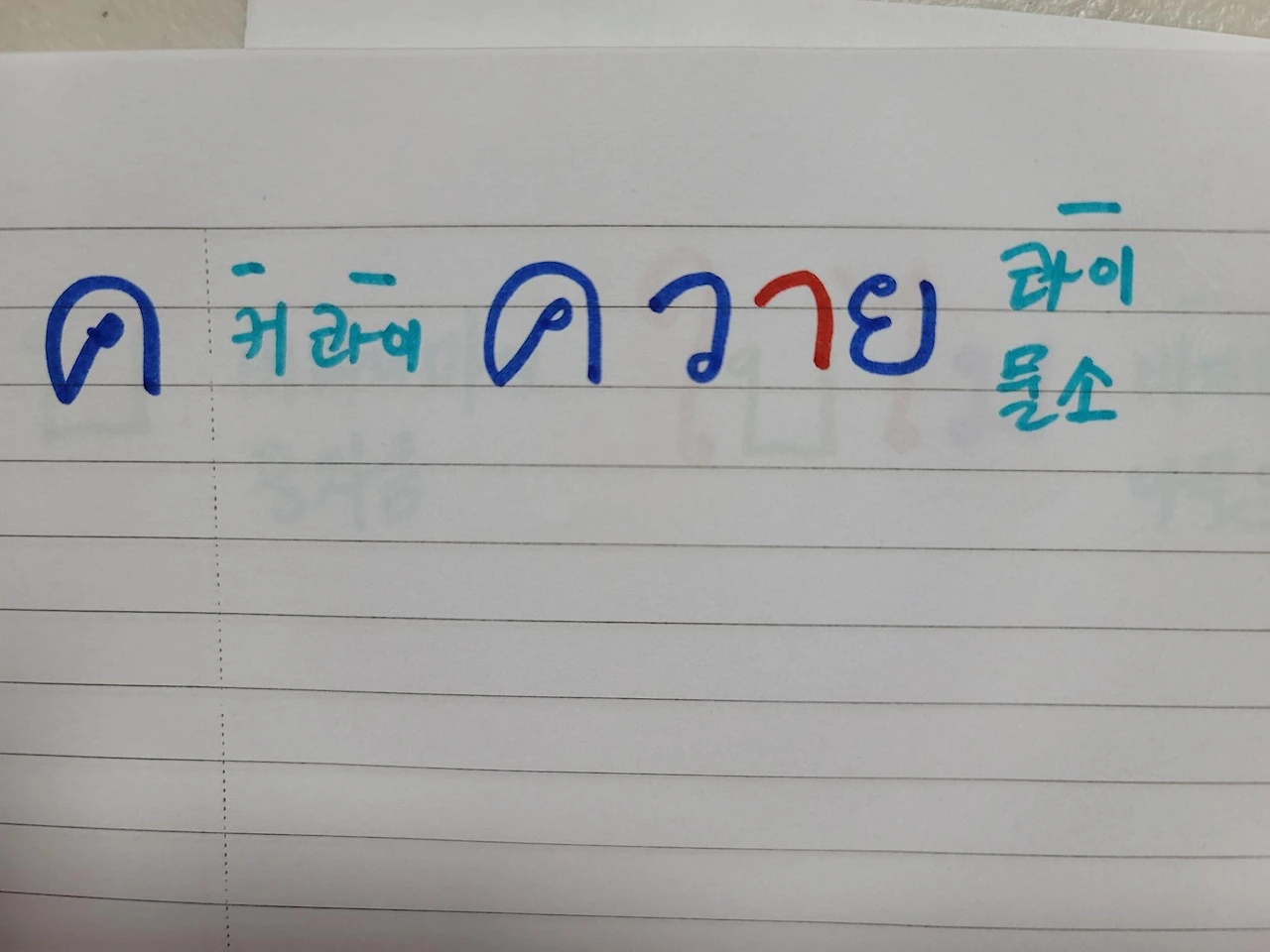 컵쿤에서 맨 앞 키읔을 했고 그다음 모음 어다. 요건 어앙으로 중자음이다. 어앙의 앙은 대야다. 요 거이 모음으로 쓰일 때 어가 되는 것이다. 그럼 컵쿤에서 키읔 했고 모음 어 했고 그다음!