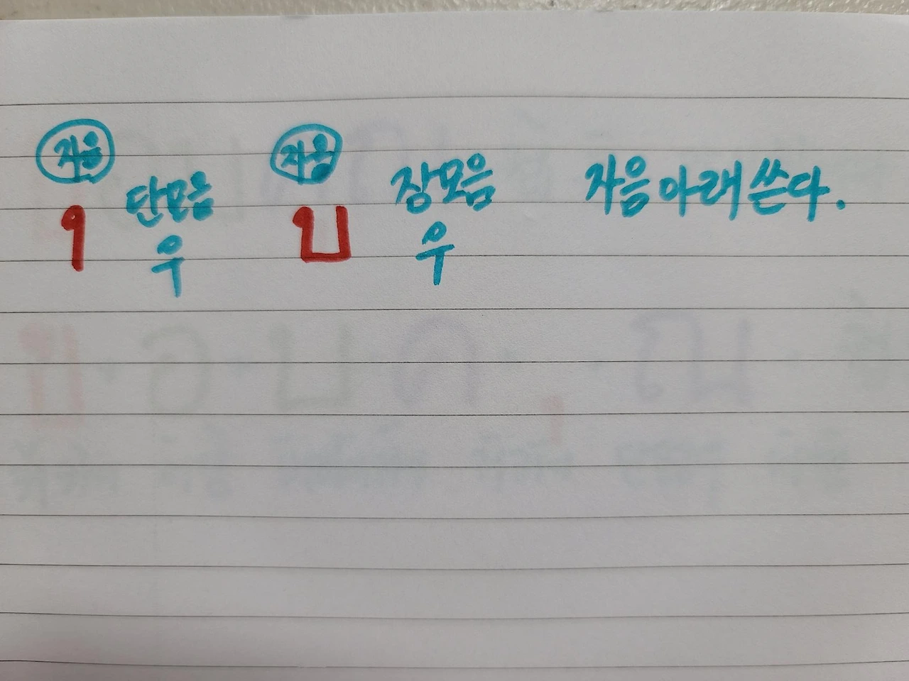 컵쿤에서 컵하고 키읔까지 했다. 쿤에서 키읔 다음엔 단모음 우다. 옆에 있는 것은 장모음 우다. 이 모음 우는 자음의 밑에다 쓴다.