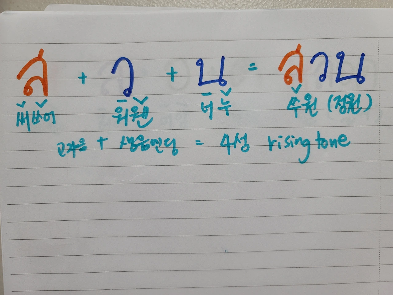 장모음 우어는 뒤에 종자음이 오면 다르게 쓰인다. 즉 워웬 하나만을 초자음과 종자음 사이에 넣는다. 쑤원이라는 단어를 보자. garden이라는 뜻이다. 써쓰어 + 워웬으로 쓰이는 모음 우어 + 너누 = 쑤원 garden 정원 즉 간략히 보자면 써쓰어 + 모음 우어 (워웬) + 너누 = 쑤원 (정원)rising tone 즉 4성이다. 와이? 고자음 초자음 + 생음 엔딩= 4성이기 때문이다.