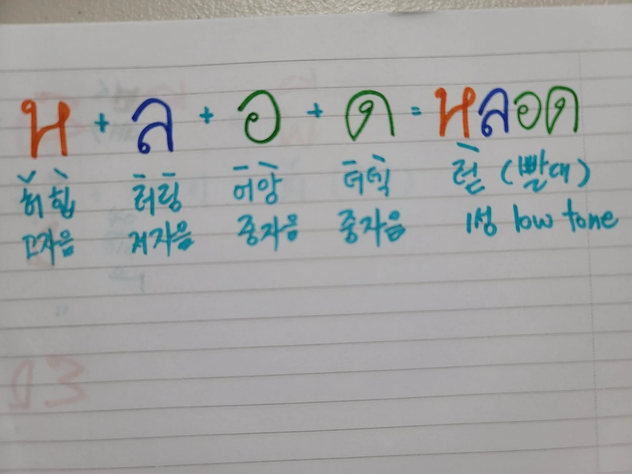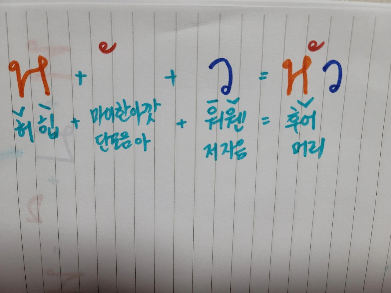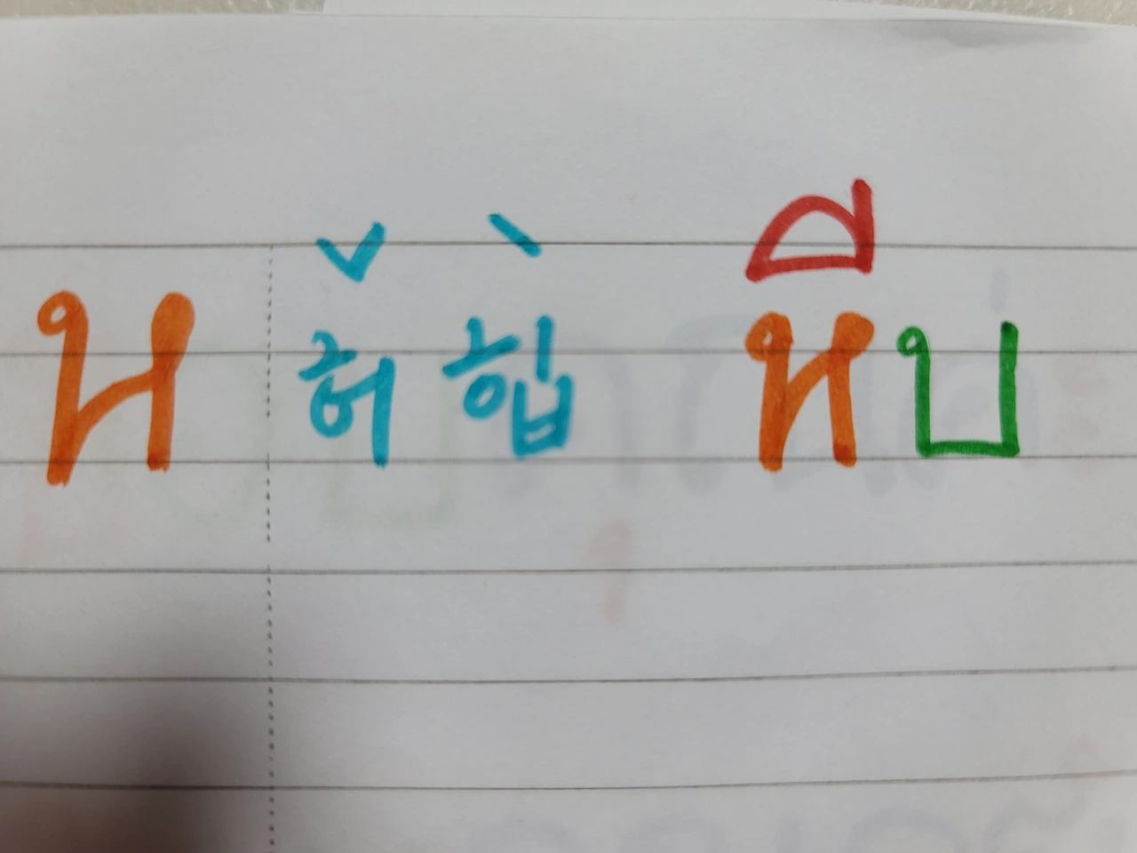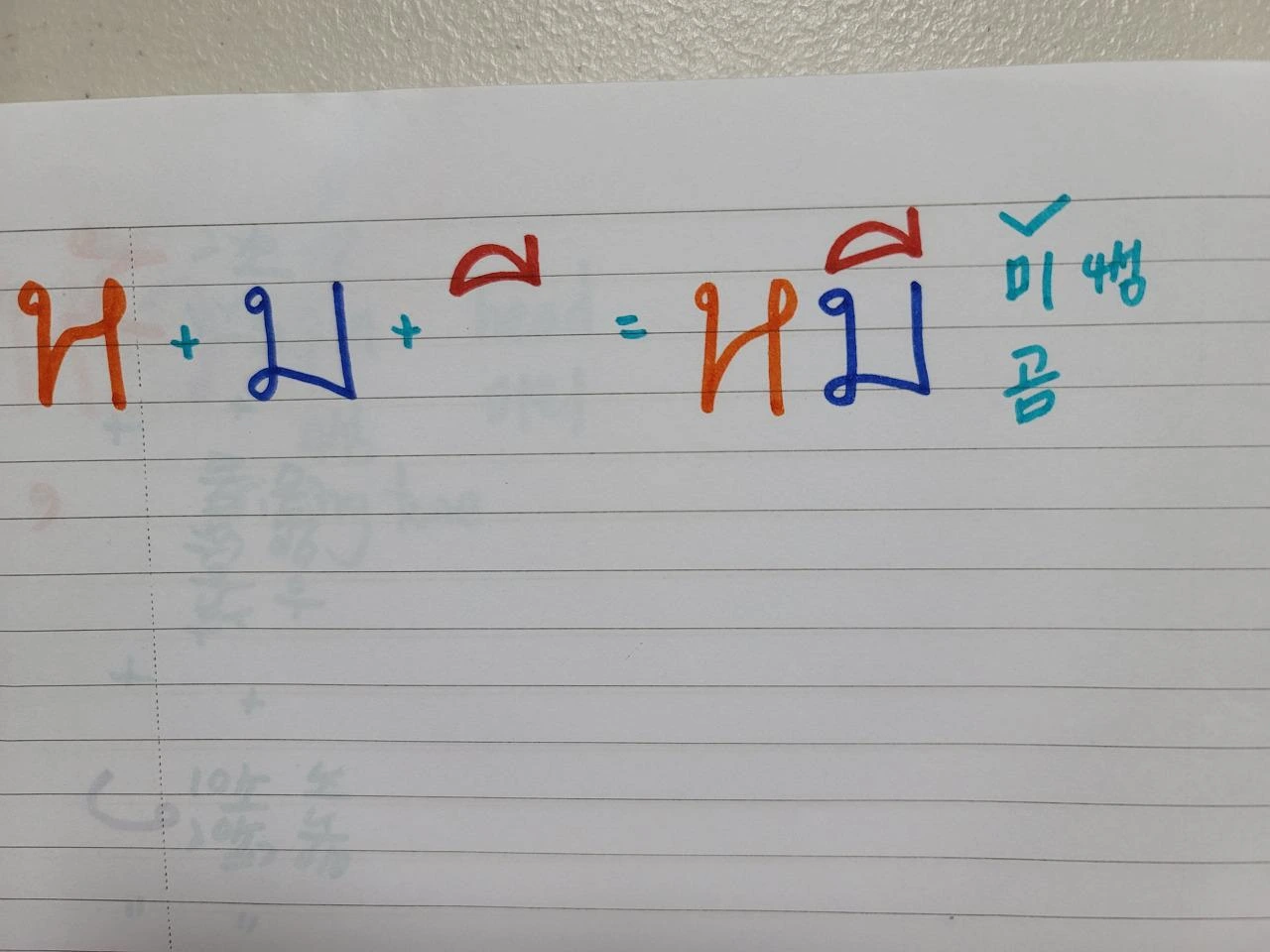 자, 이제 허힙을 써볼까? 헤드로 시작하고 밑으로 내려갔다 다시 올라가 동그라미를 그리고 내려온다. 허힙. 정말 H 같이 생긴 게 소리도 히읗으로 나고 쓰기도 외우기도 쉽다. 허힙!!! 헤헤 요 거이 그리 중요하다고라. 저자음을 고자음으로 만들어주는 마법의 글자라니 잘 외우 잣. 허힙!