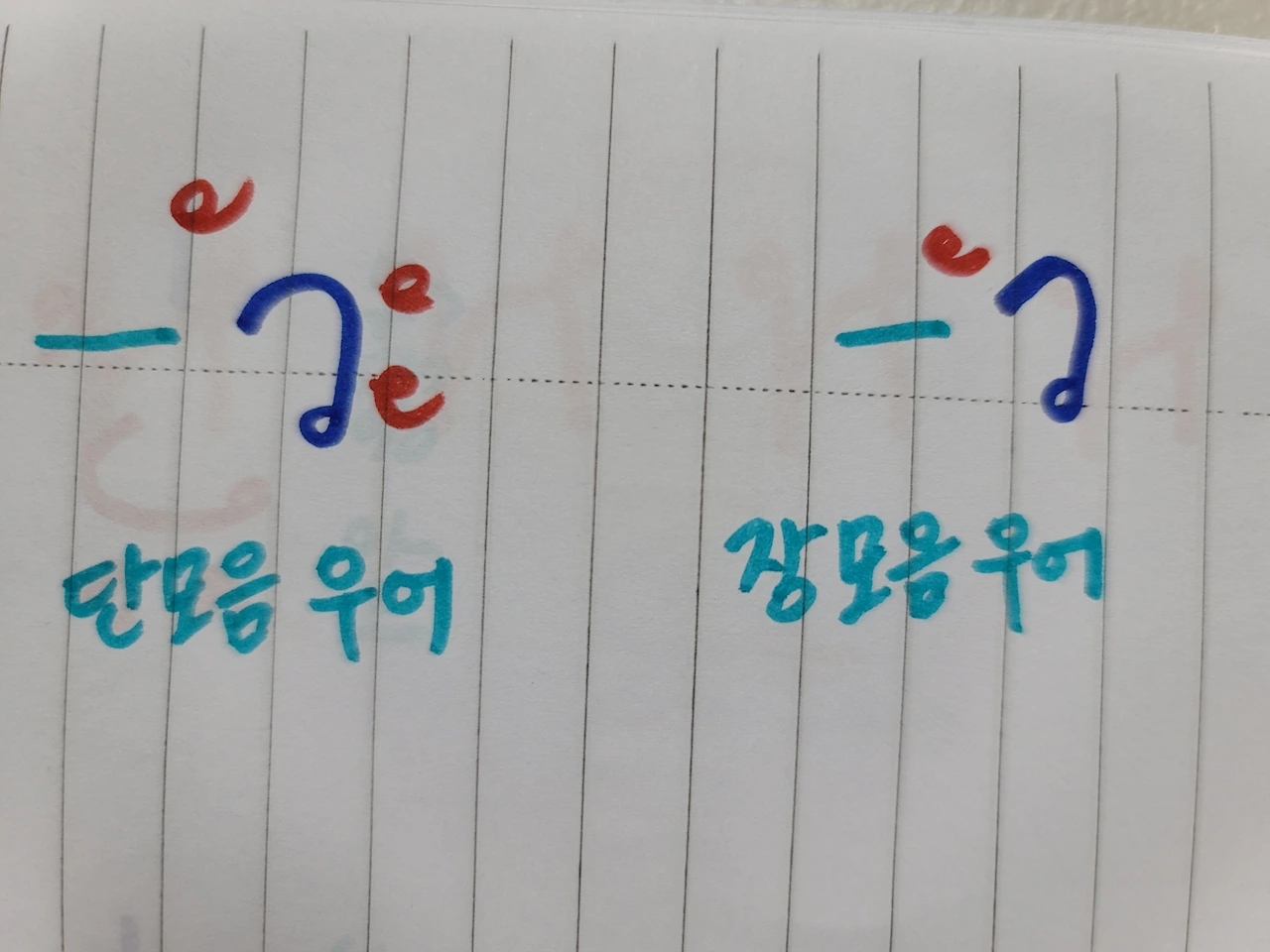 이제 오늘의 모음을 보자. 단모음 우어 랑 장모음 우어다. 모음 우 랑 어 가 합쳐진 듯한 우어라는 발음이다. 종자음이 없을 때 모음 우어는 자음 위에 마이한아깟을 써주고 오른쪽에 워웬을 써준다. 여기 워웬 뒤에 단모음 아를 써주면 단모음 우어가 된다. 왼쪽이 단모음 우어 오른쪽이 장모음 우어다.