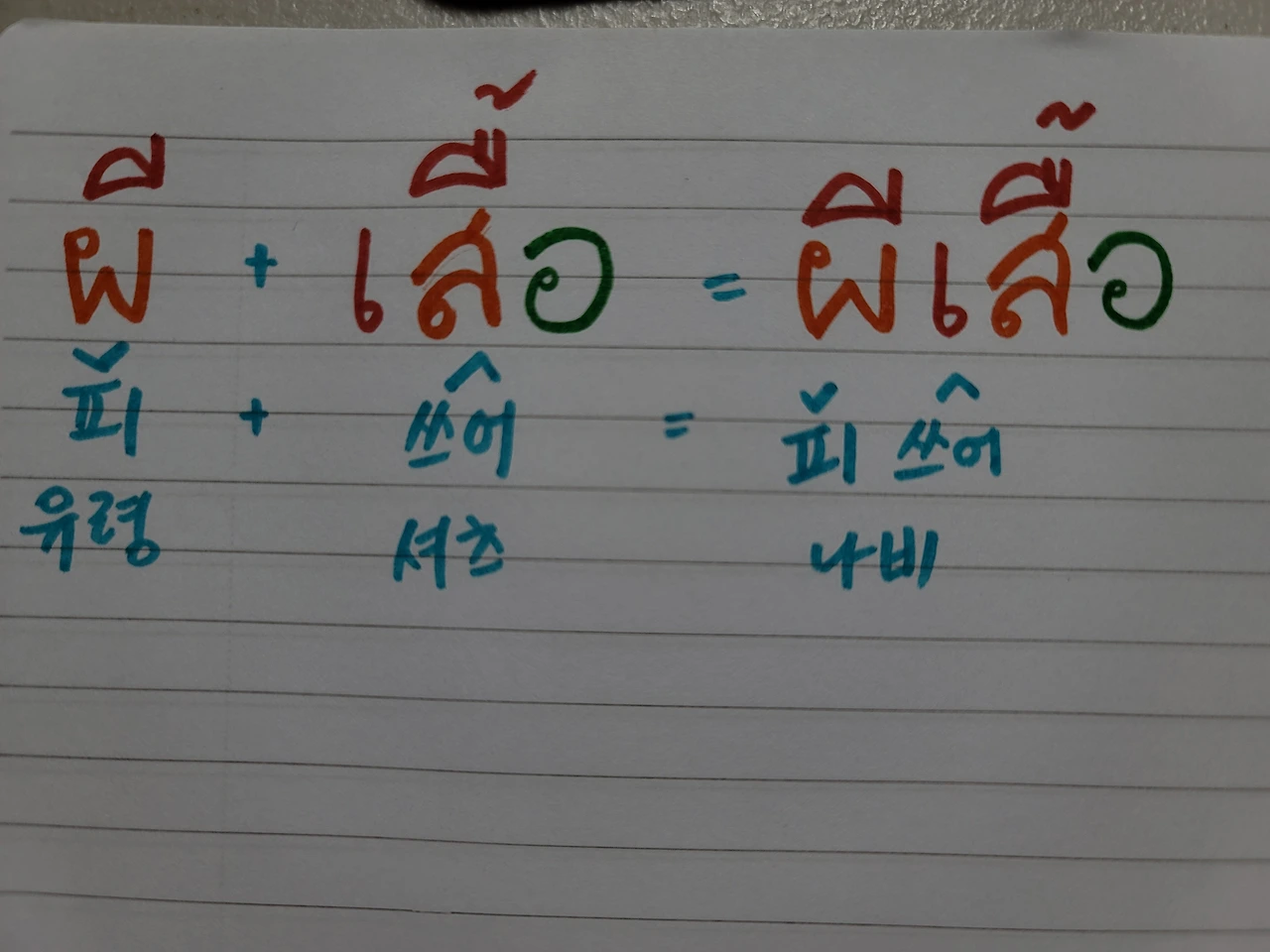 다시 볼까? 유령 피랑 셔츠 쓰어가 합쳐진 복합어 그 뜻은 나비. 하하 어쩜 이렇게 완전히 다른 뜻이 될 수 있을까? 그러므로 모든 단어를 문장에서 안다고 해도 이해가 안 될 수 있다. 반드시 타이 사전을 체크해야만 한다. 그중에는 복합 단어가 꽤 있을 수 있으니까. 문장 속에 띄어쓰기가 전혀 없기 때문에 더욱 어렵다. 그래도 이렇게 하나씩 알아가면 무언가 의사소통을 조금이나마 할 수 있으리라. 자유롭게 현지인과 말을 나누게 될 그날까지 파이팅!!! 하하