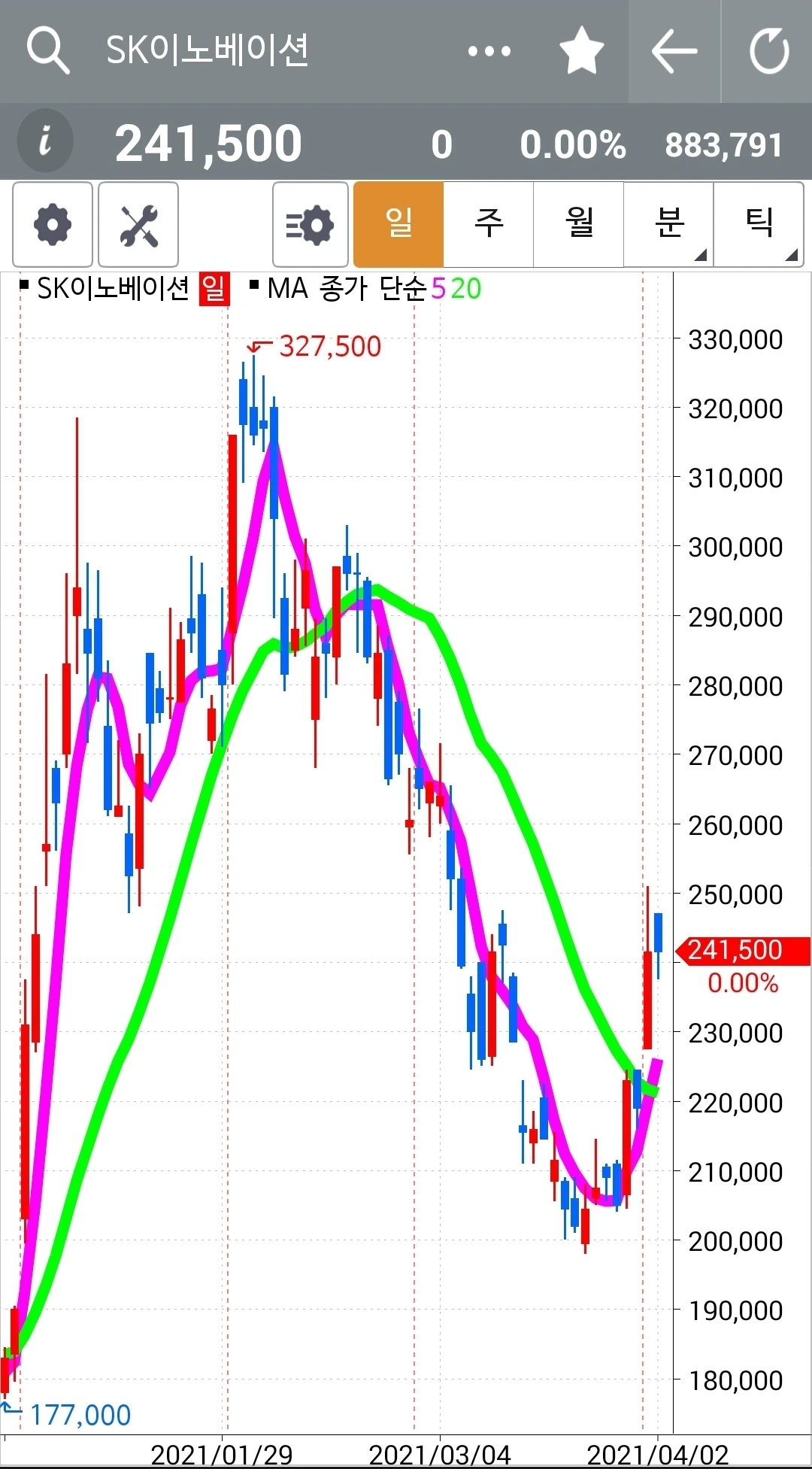 그대로 올라가는 건 허당이다. 적당히 굴곡을 주며 올라가야 길게 간다. 그래 20일선 근처까지 다 내려왔으니 이젠 다시 위로 쭉쭉 빵빵 올라가렴. 파이팅!