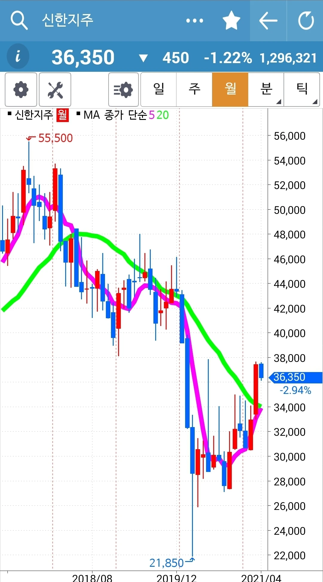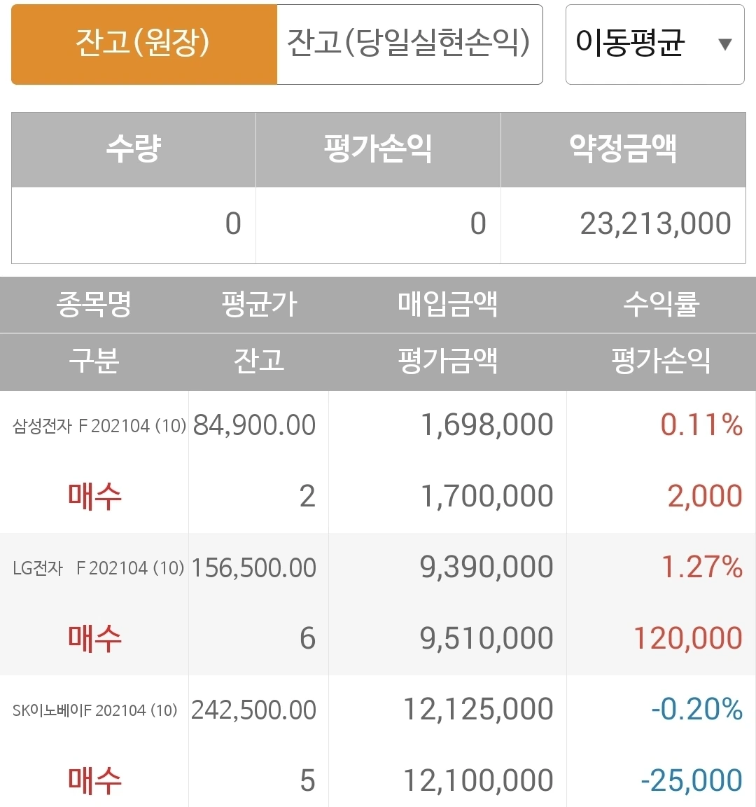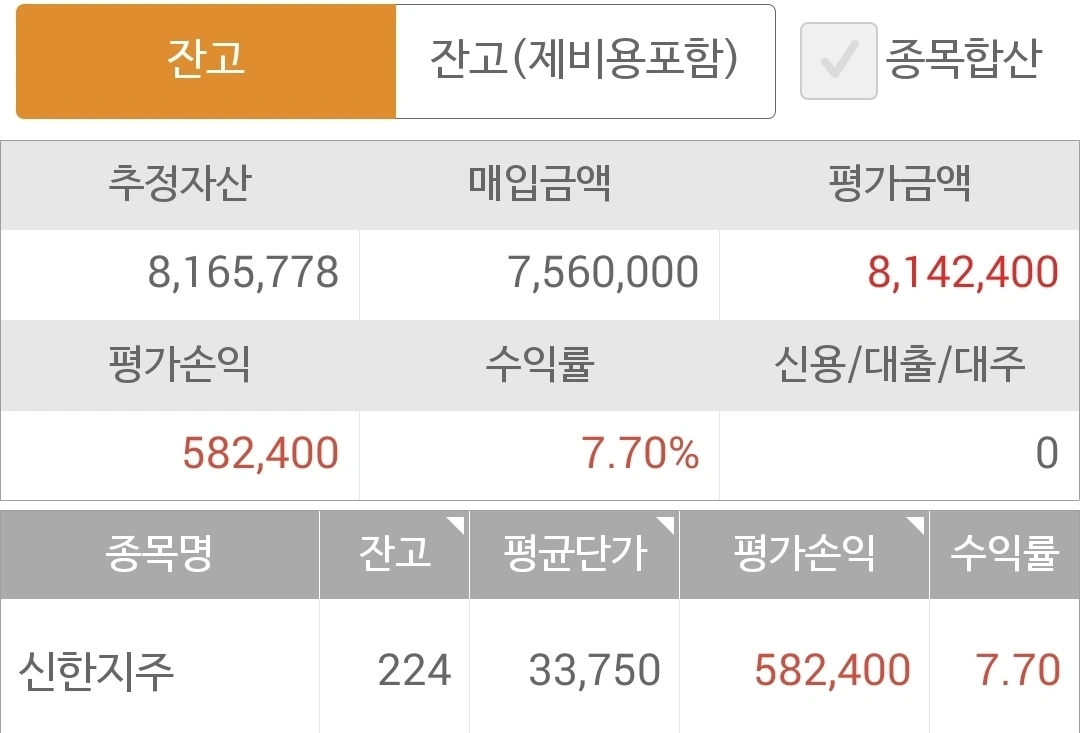 사진 1. 현물 주식. 아직 신한지주 5일선이 20일선을 뚫고 내려간 게 아니므로 그대로 보유하고 있다. 수익이 줄고 있다. 신한지주가 자꾸 내려가서. 그래도 어쩔 수 없다. 난 아무것도 몰라요 5일선이 20일선 아래로 가면 매도할 뿐야요~ 니까.
