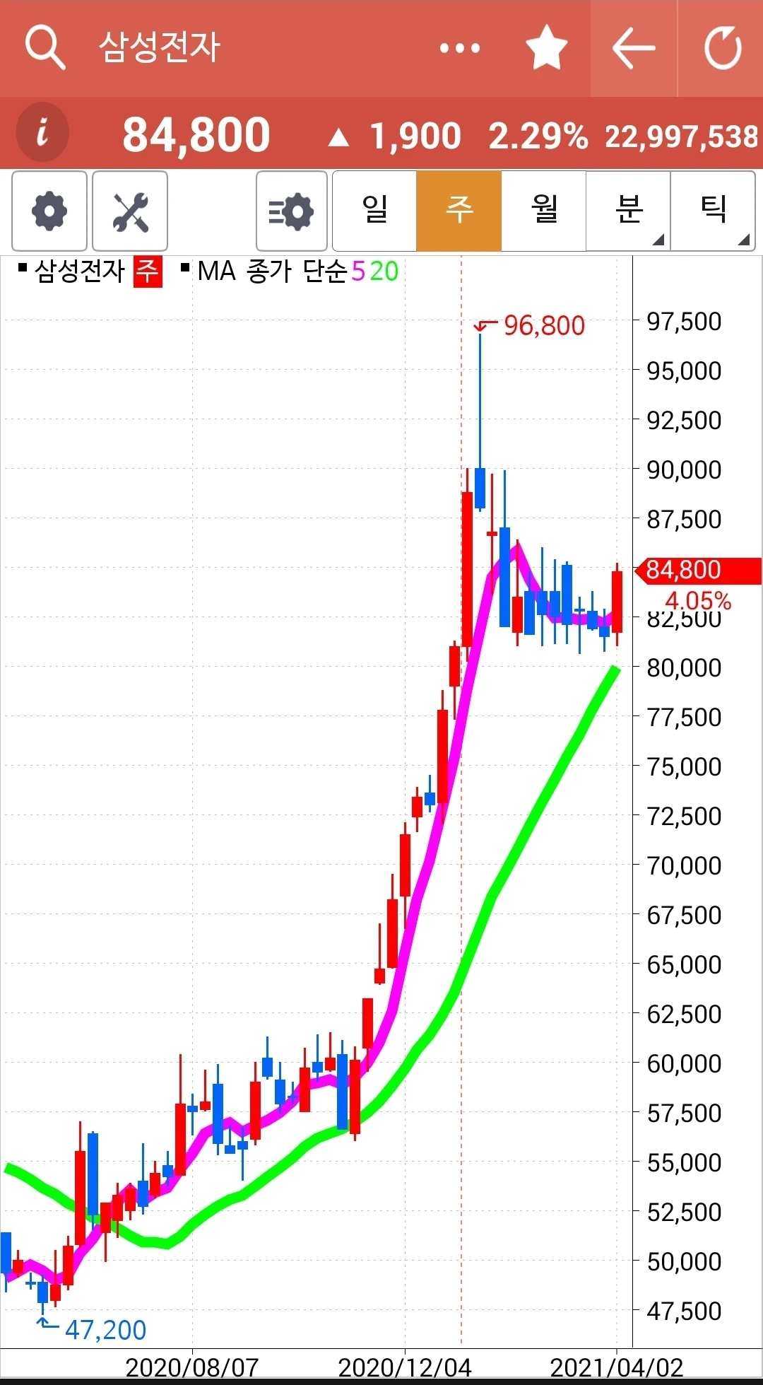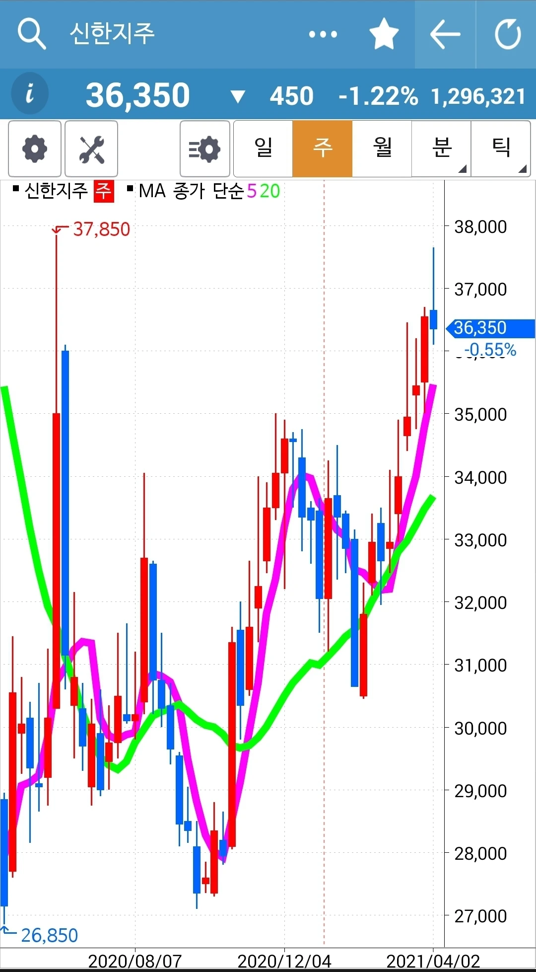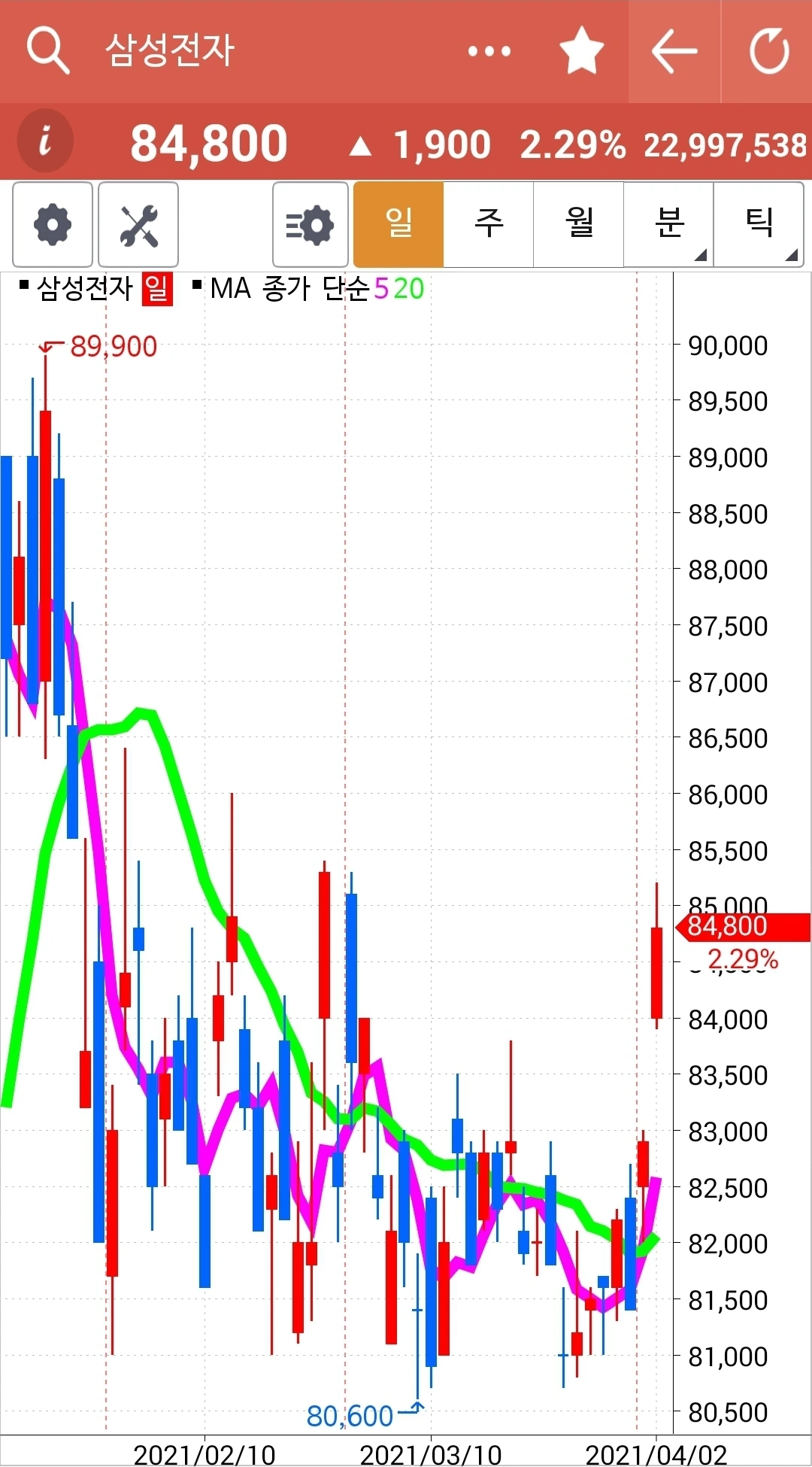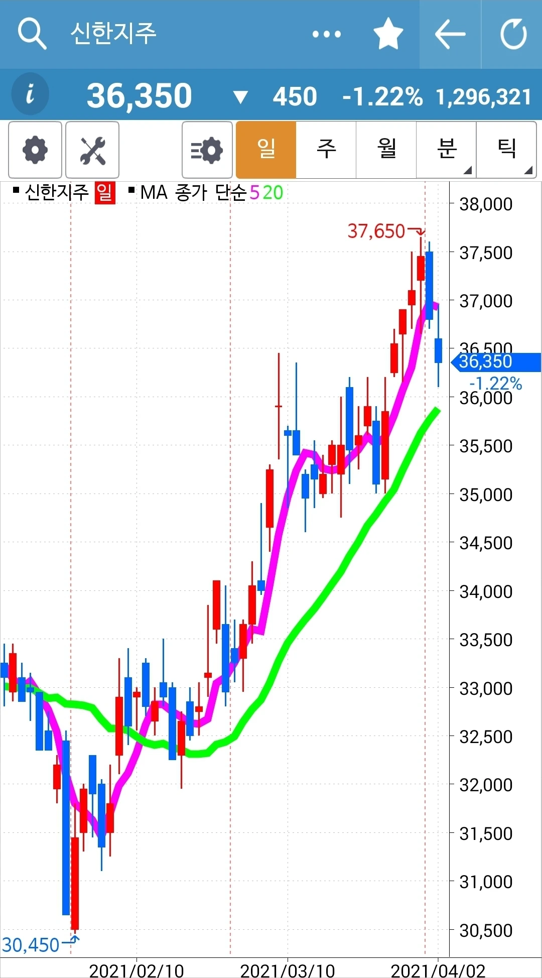 5일선이 20일선 위로 빵 올라온 걸 오늘에야 발견했다. 발견한 즉시 매수! 그런데 제일 마지막에 하게 되어 남은 금액으로만 해서 아주 적은 양이다. 꼴랑 두 개. 푸하하하