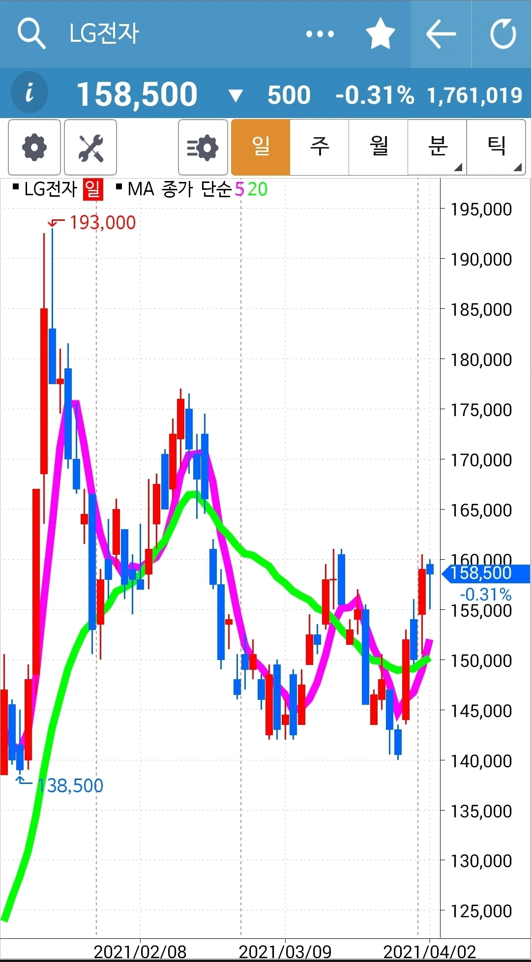 오늘 드디어 나는 선물 주식에 여러 개를 사 넣었다. 5일선이 20일선을 뚫고 올라온 LG전자, 삼성전자, SK이노베이션이 그 주인공들이다. 나의 관심종목에 있다가 5일선이 20일선을 빵! 뚫고 올라오기에 나에게 발탁된 예쁜 놈들이다. 하하 나랑 함께 멋지게 수익내며 가자~ 파이팅! (그런데 여기서 오늘이라 함은 마지막 영업일 즉 지난 금요일 4월 2일을 말한다. 게으른 사람은 이것도 습관이다. 장이 열리기 전까지만~ 하는 생각이 있기에 금요일 밤에는 탱자탱자 놀자~ 숙제를 안 한 것이다. 월요일 9시 장 시작 전까지만 올리면 되니까. 그렇다면 지금은 마감시간보다 아주 일찍 하는 거다. 게으르지 않은 거다. 푸하하하)