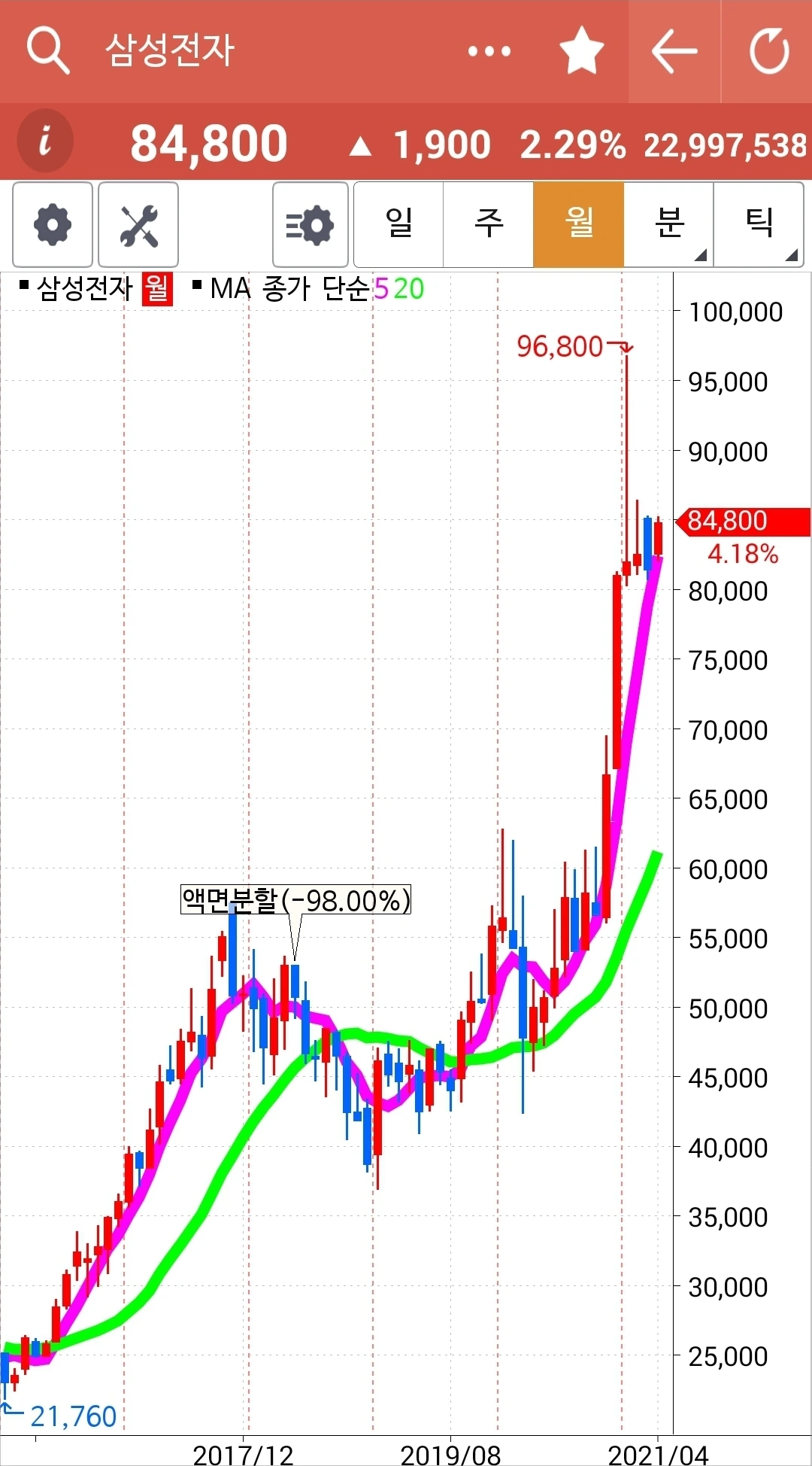 5일선이 20일선 위로 삐죽! 내미는 순간 나의 손가락이 가만히 있을 리 없다. 토톡 매수! 하하