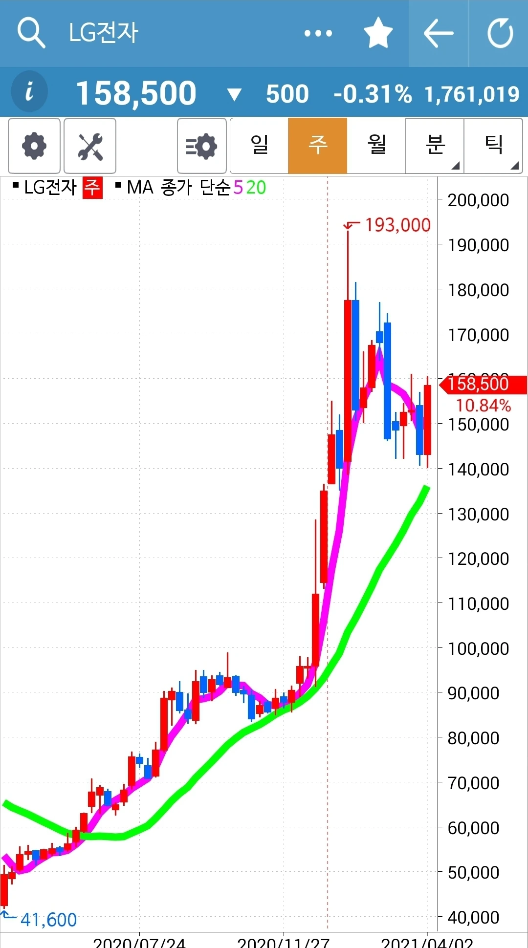 나의 사랑 LG전자. 아무리 나의 사랑이어도 5일선이 20일선을 벗어나는 순간 난 놔랏! 야박하게 떨구었다. 그러나 내내 관심을 갖고 보다 드디어 5일선이 20일선 위로 빵! 올라오는 순간 오케이~ 매수~ 다시 품에 안았다. 이젠 나를 고생시키지 말고 멀리멀리 높이높이 가거라. 알았지? 파이팅!!!