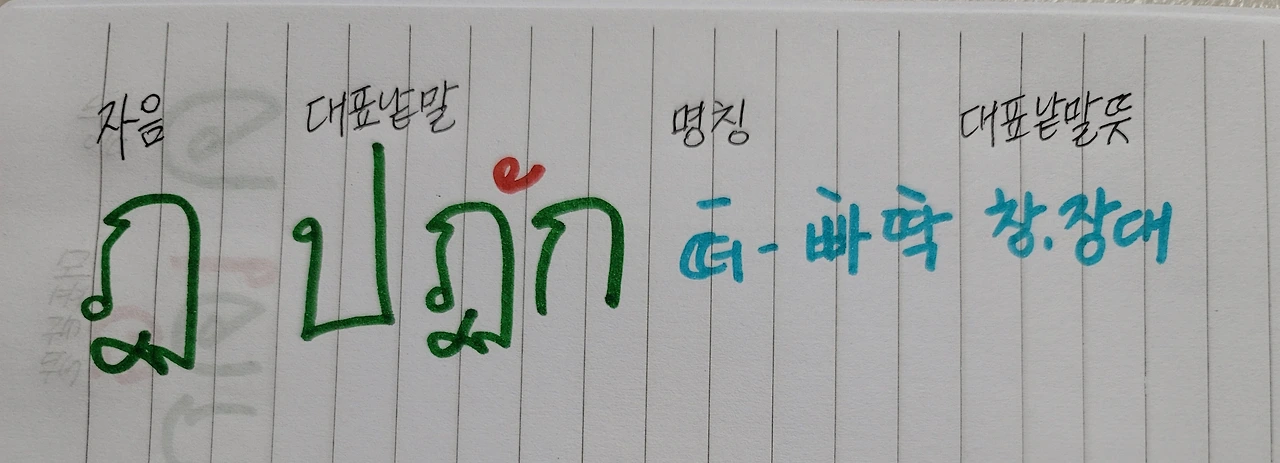 4. 떠빠딱. 이 자음의 이름은 떠빠딱이다. 이 자음이 들어간 대표 낱말은 빠딱. 이 자음의 명칭은 떠빠딱이며 이 대표낱말 빠딱의 뜻은 창, 장대이다.