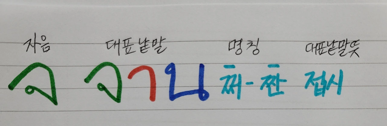 2. 쩌짠. 위에서 보면 알 수 있듯이 자음 쩌짠과 대표낱말 짠. 그리고 이 자음의 명칭인 쩌-짠. 이 대표낱말 짠의 뜻은 접시라는 뜻이다.