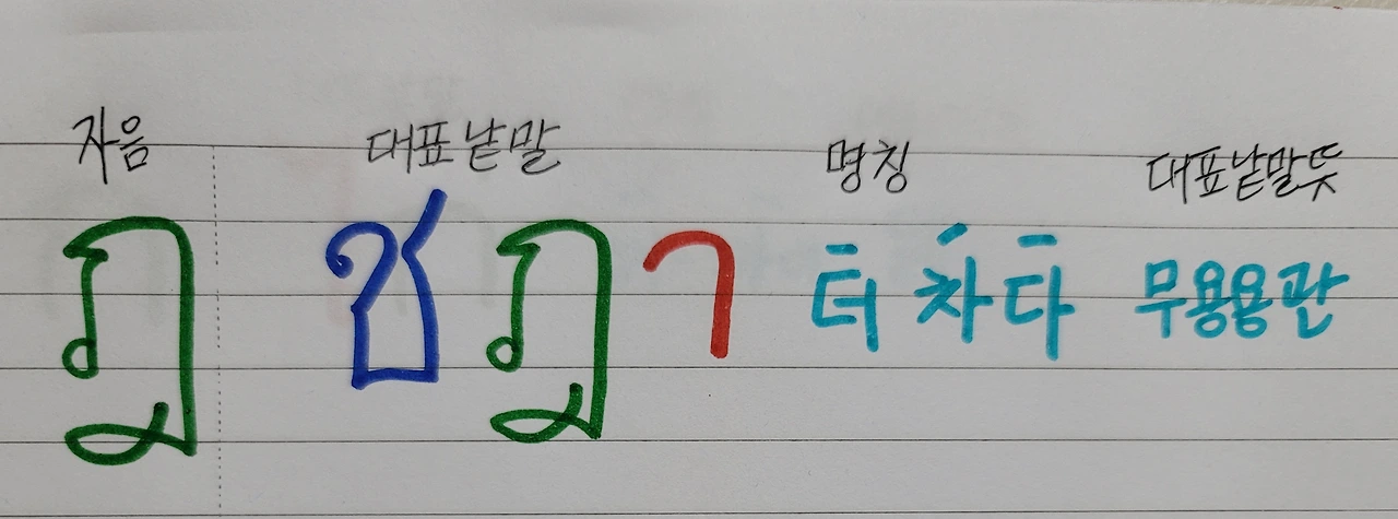 3. 더차다.이 자음의 이름은 더차다. 이 자음이 들어간 대표낱말은 차다. 그래서 이 자음의 명칭은 더차다. 차다라는 대표낱말의 뜻은 무용용 관. 무용할 때 쓰는 왕관 같은 관을 말한다.