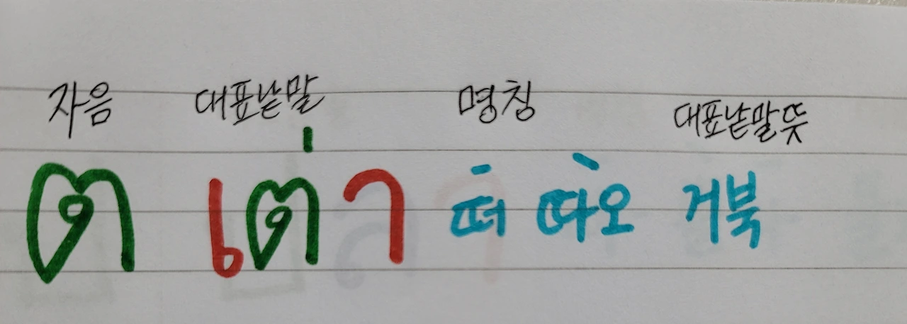 7. 버바이마이. 이 자음의 명칭은 버바이마이 이 자음을 쓴 대표낱말은 바이마이. 뜻은 나뭇잎