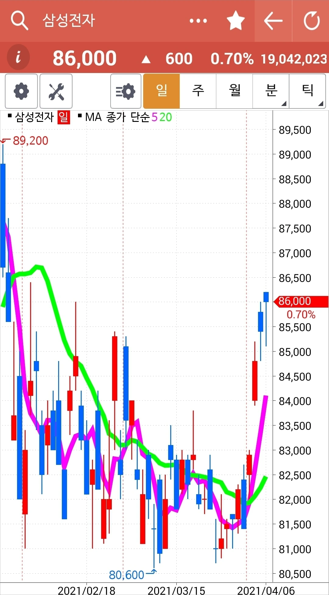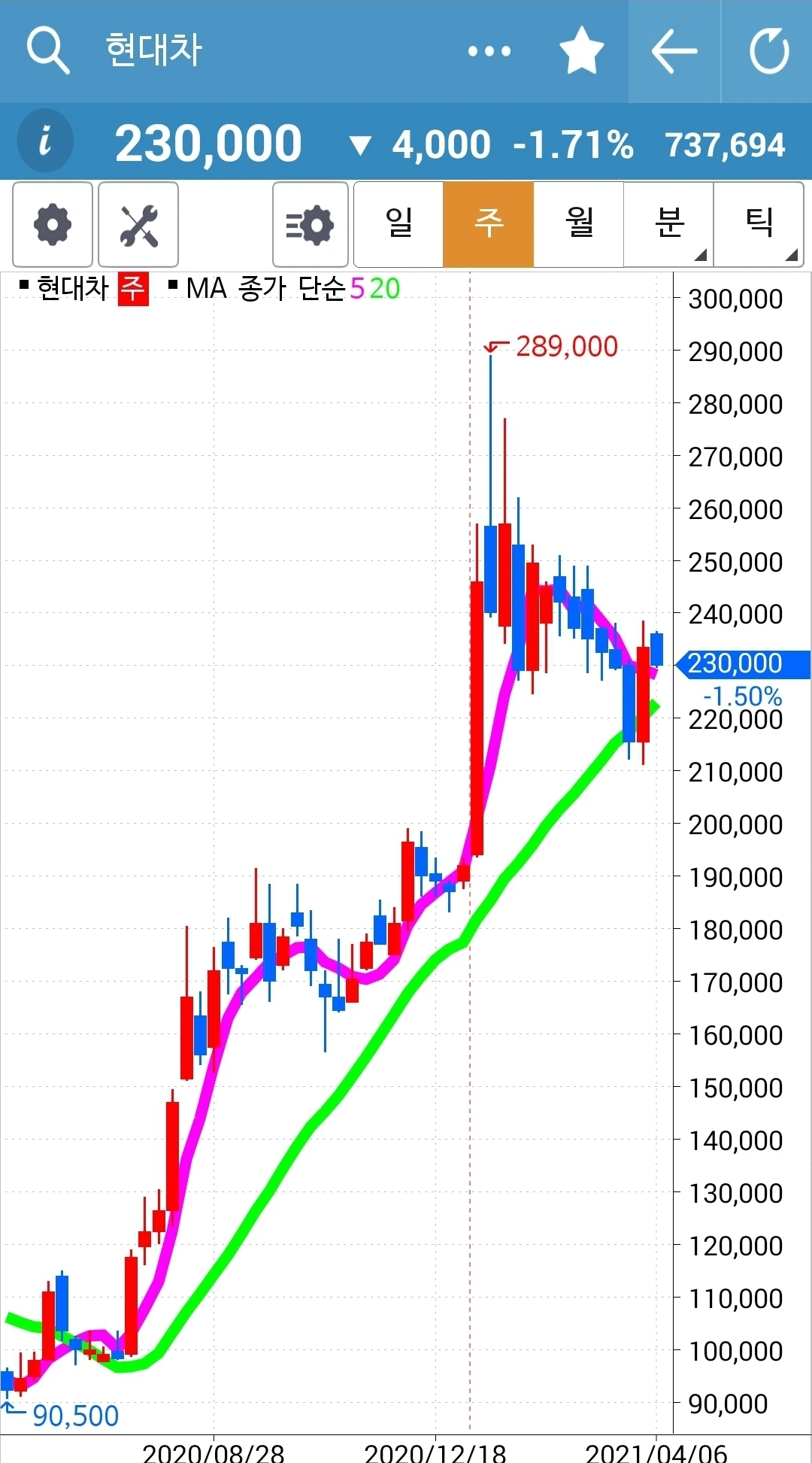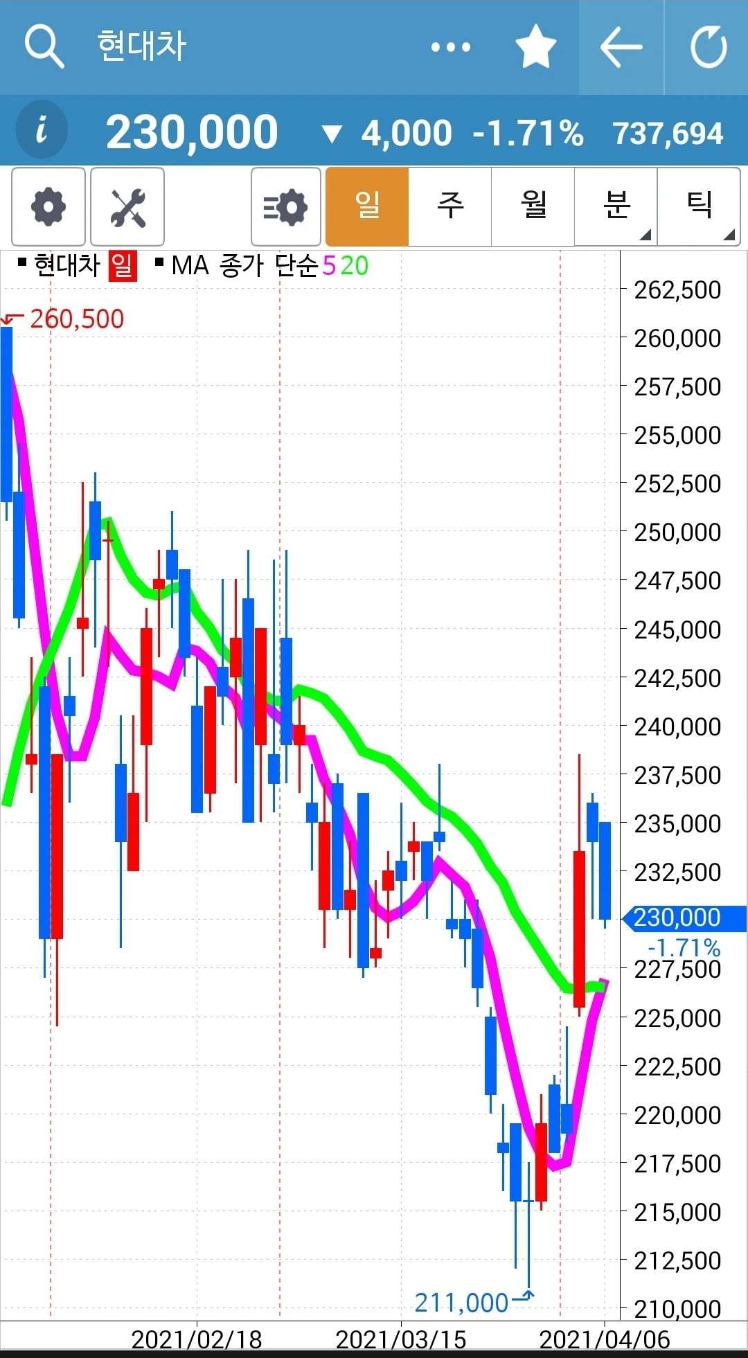 제인 님이 이야기하는 순간 차트를 봤더니 앗 5일선이 20일선을 막 뚫고 올라오는 중. 그래 신한지주는 오래 20일선 위에 있었으니 그 언제고 내려갈 수 있을 테고 요건 떠오르는 샛별 아닐까. 새로 시작해보자. 하여 신한지주를 사자가에 주고 현대차를 팔자가에 샀다. 결정이 힘들지 일단 결정했으면 호가를 아낄 거 아니다. 그냥 당장 체결되는 값으로 사고야 만다. 흐흐. 나의 캐릭터라니.
