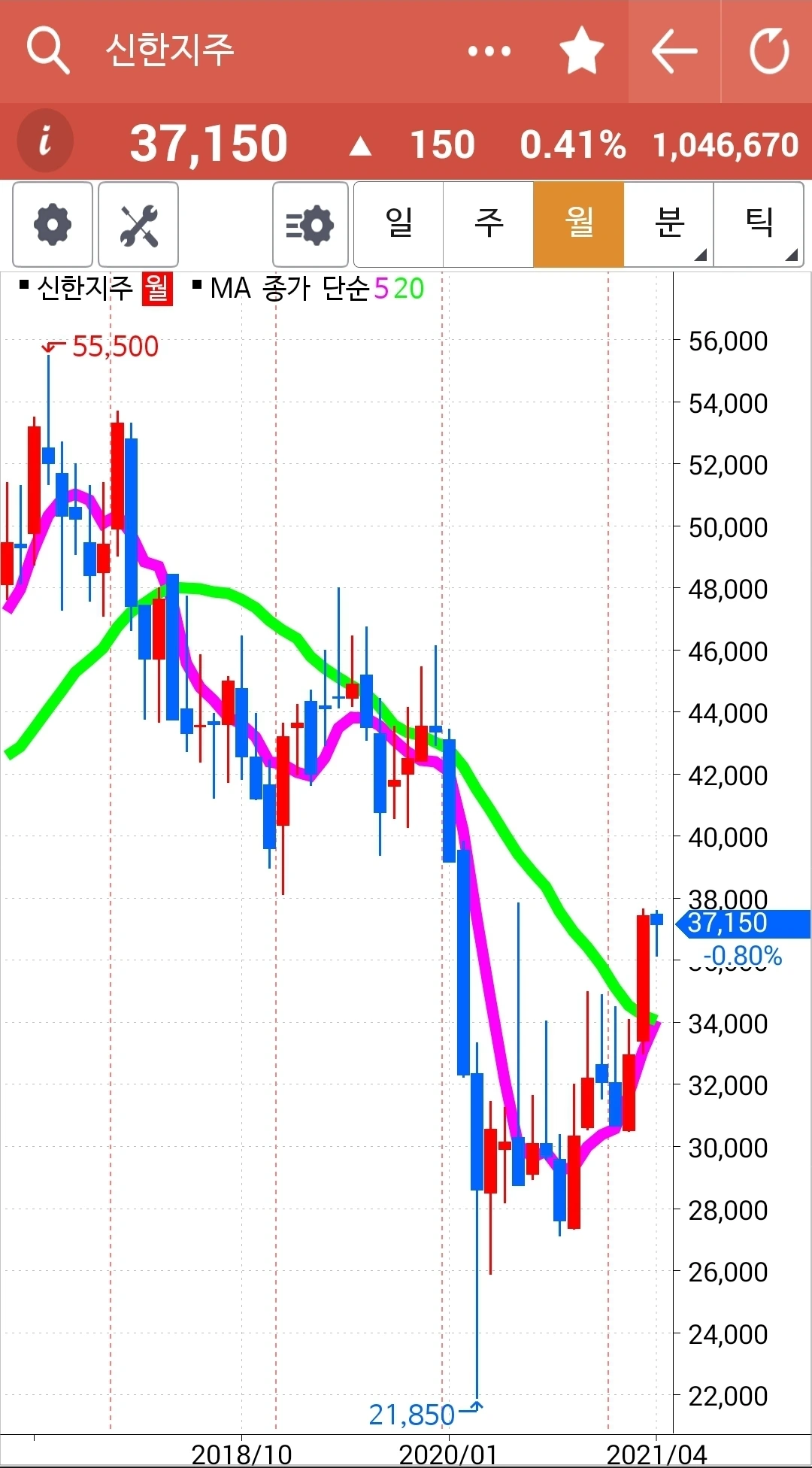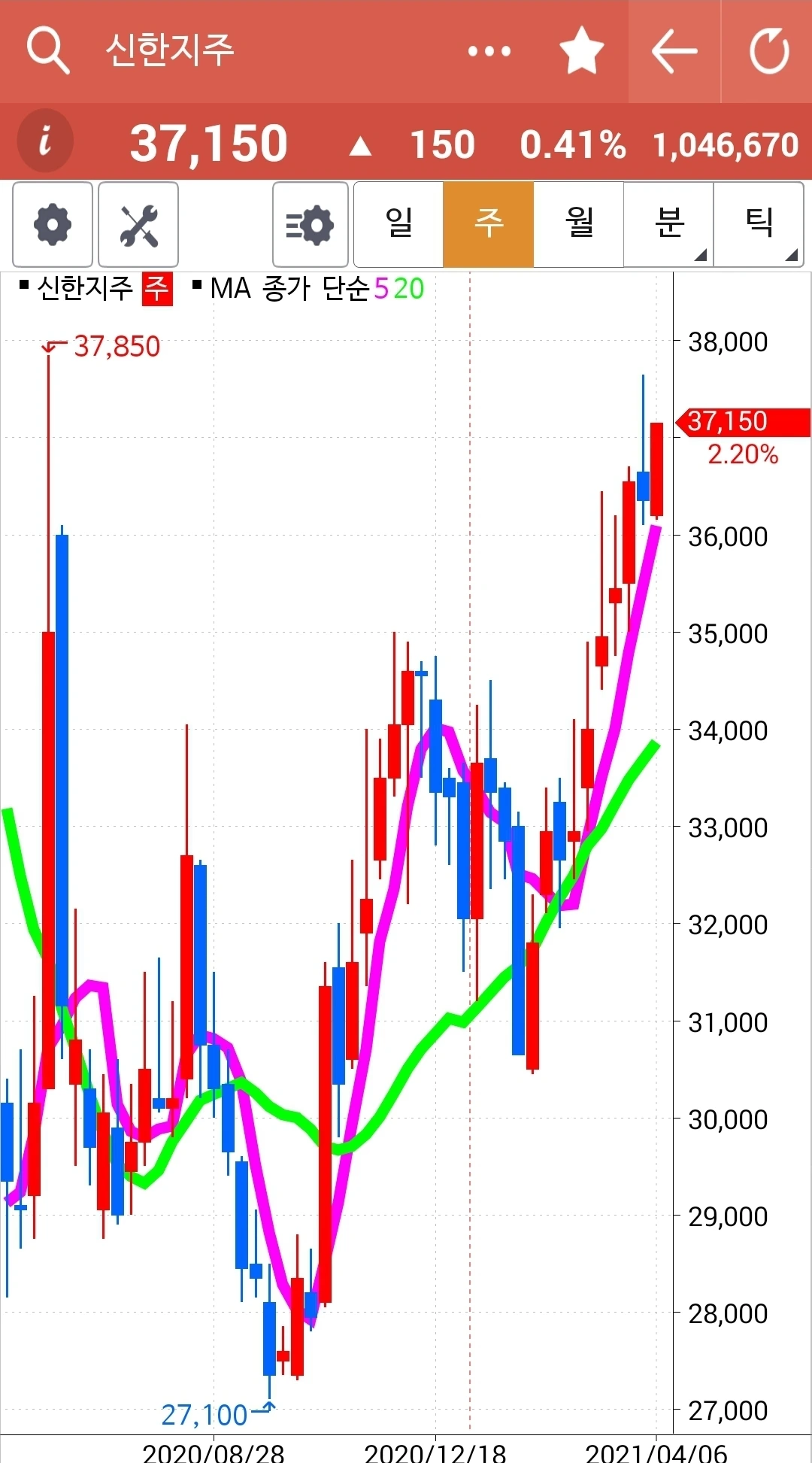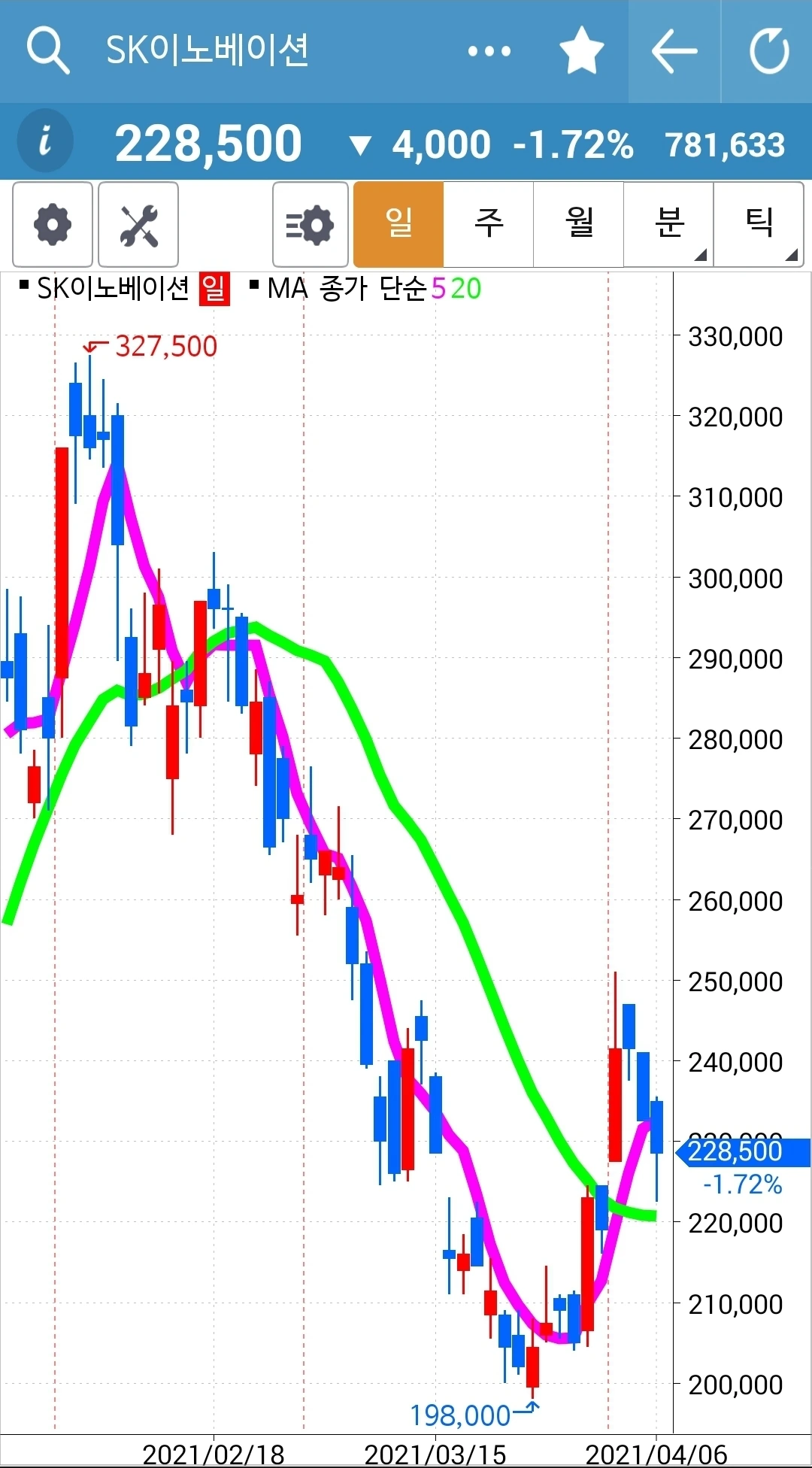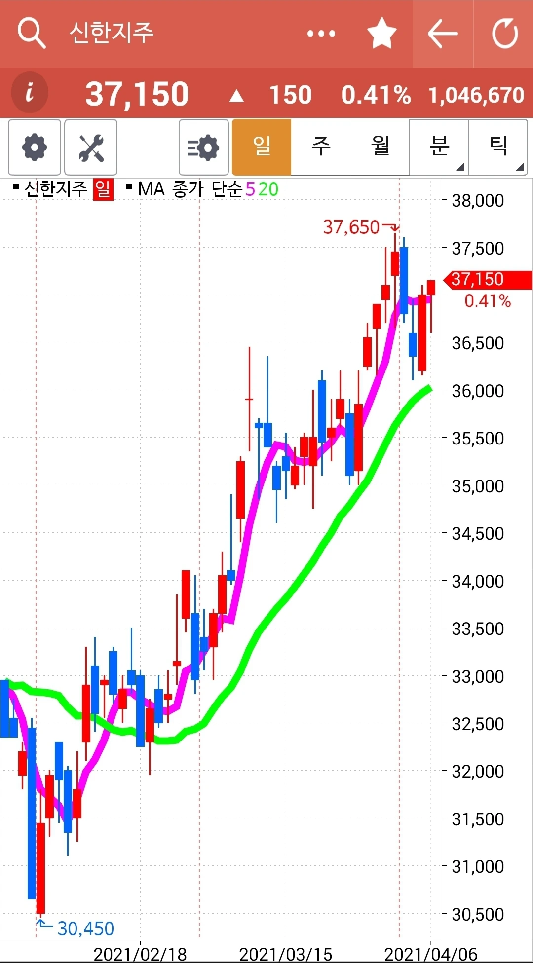 제인 님이 이야기하는 순간 차트를 봤더니 앗 5일선이 20일선을 막 뚫고 올라오는 중. 그래 신한지주는 오래 20일선 위에 있었으니 그 언제고 내려갈 수 있을 테고 요건 떠오르는 샛별 아닐까. 새로 시작해보자. 하여 신한지주를 사자가에 주고 현대차를 팔자가에 샀다. 결정이 힘들지 일단 결정했으면 호가를 아낄 거 아니다. 그냥 당장 체결되는 값으로 사고야 만다. 흐흐. 나의 캐릭터라니.