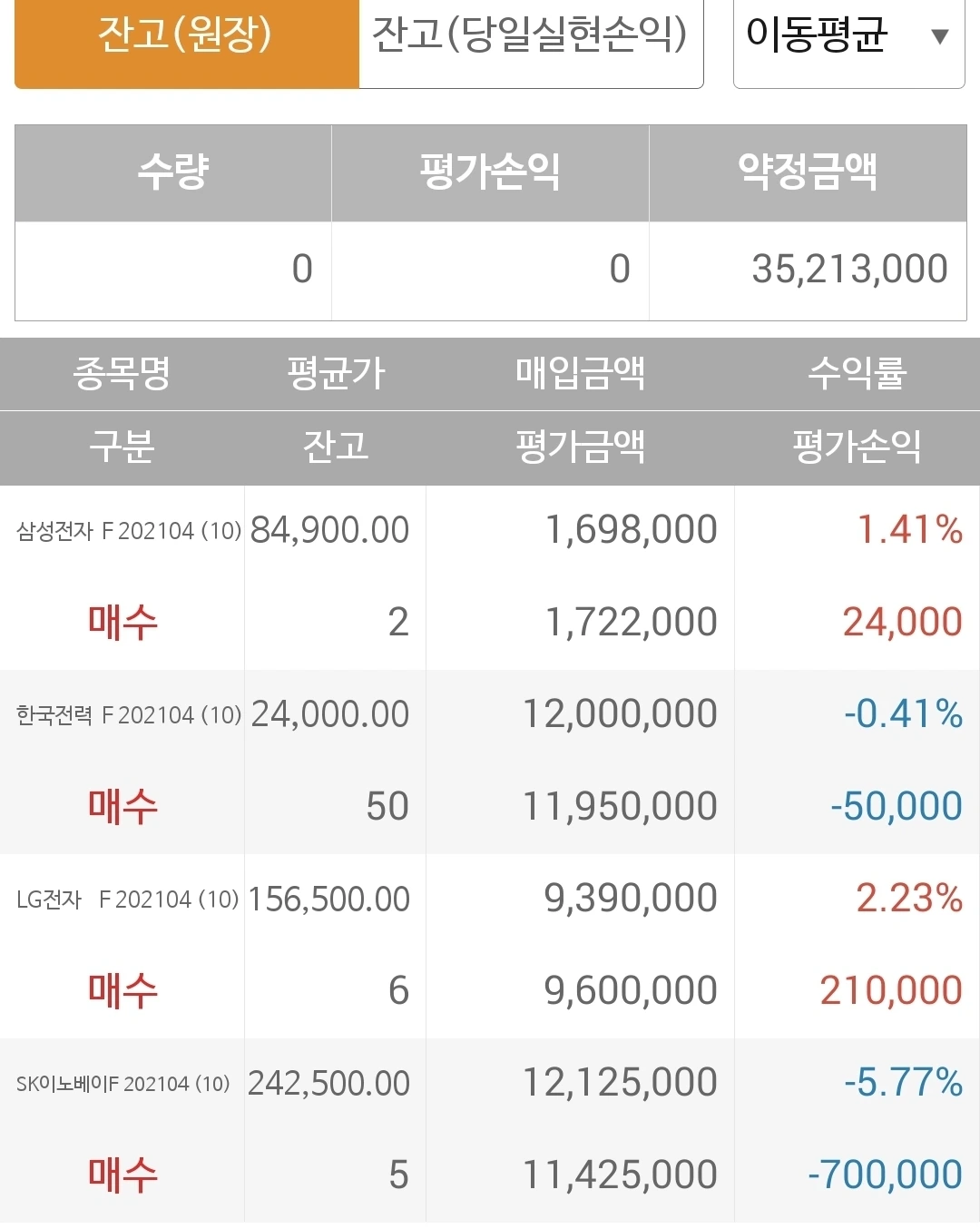 사진 2. 선물 주식. 무려 네 종목이나 샀다. 제일 잘 나가는 삼성전자를 제일 조금 산 게 아쉽다.