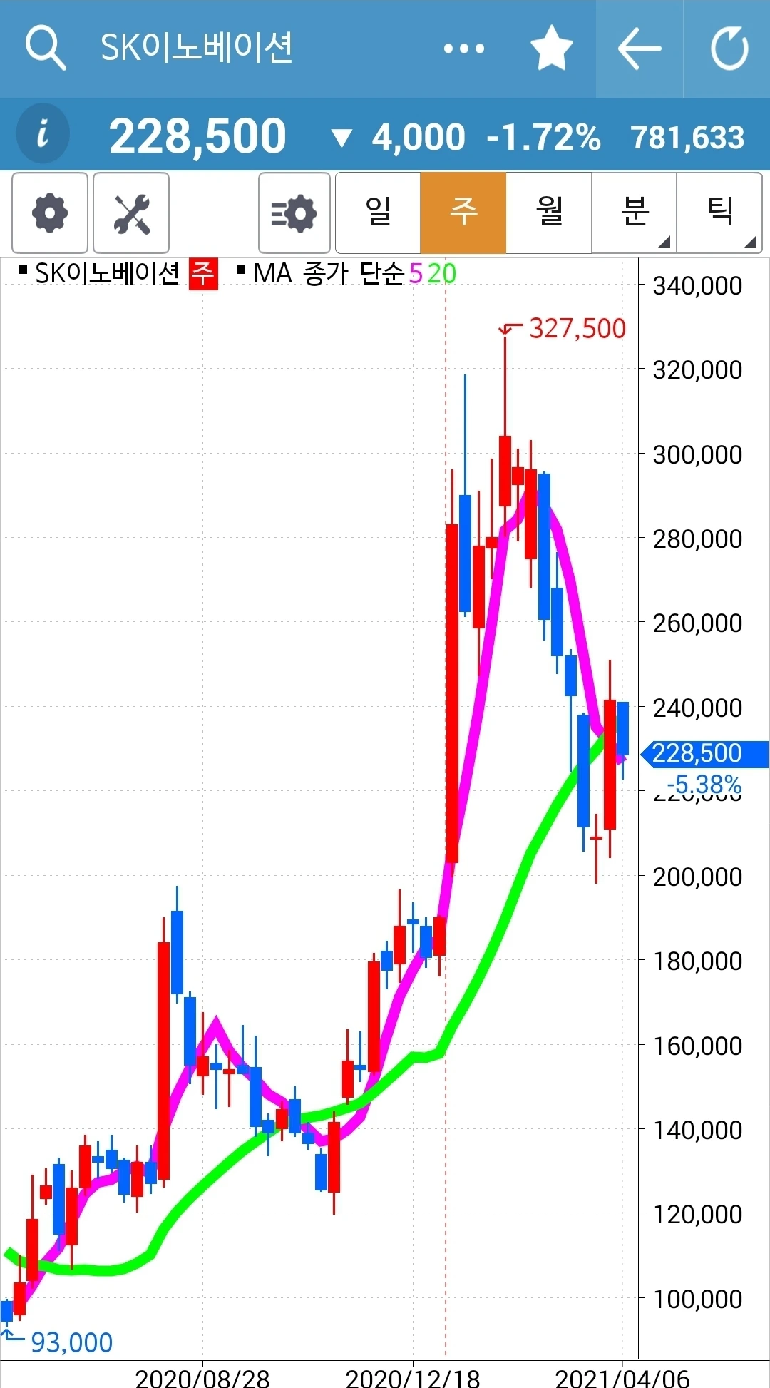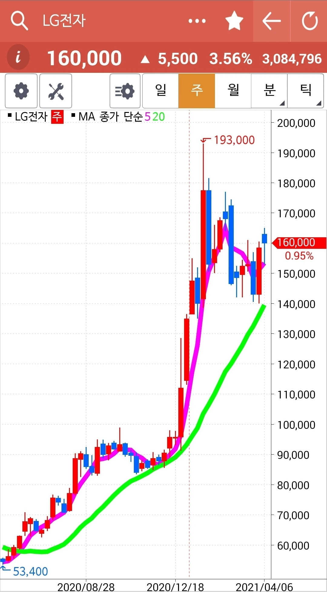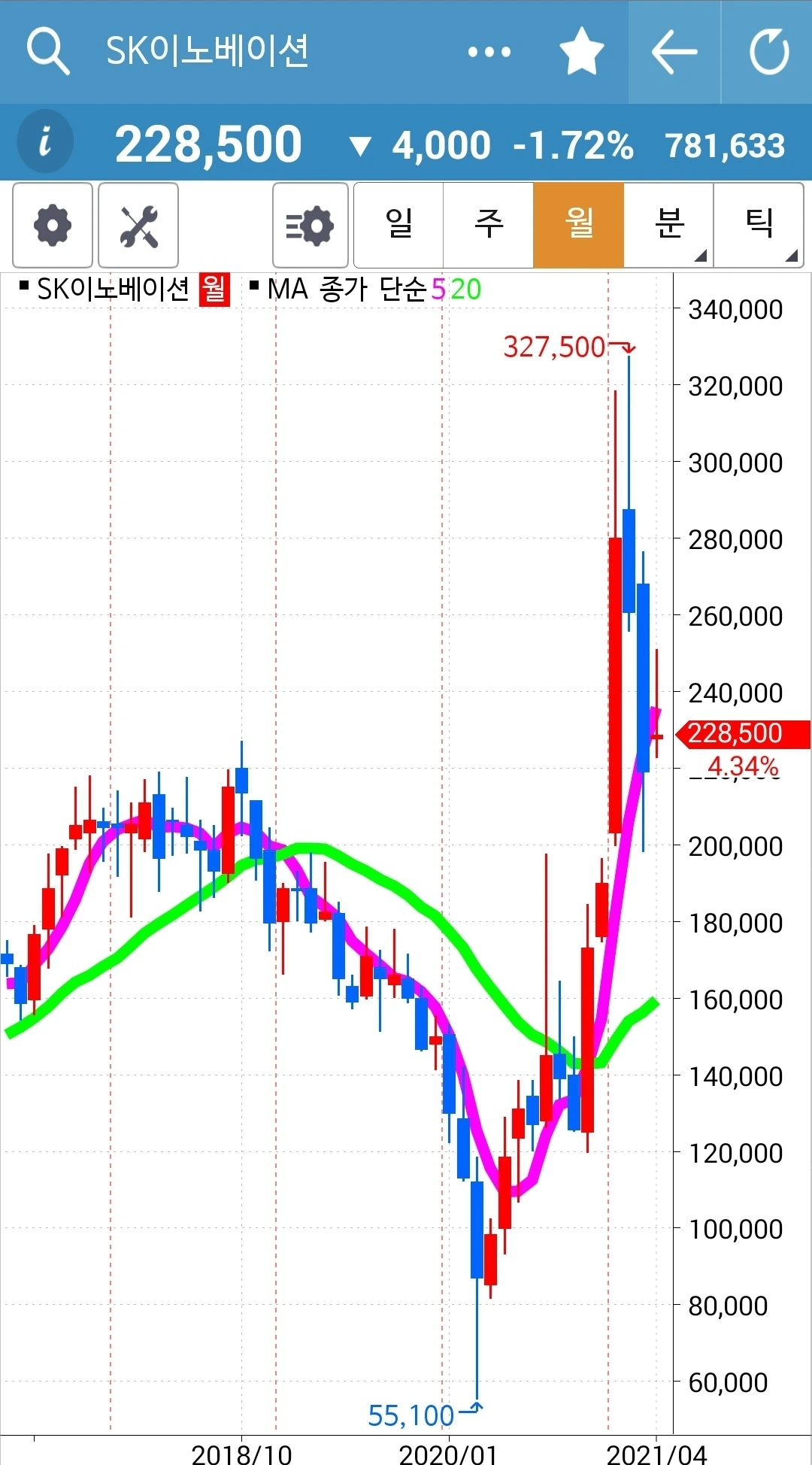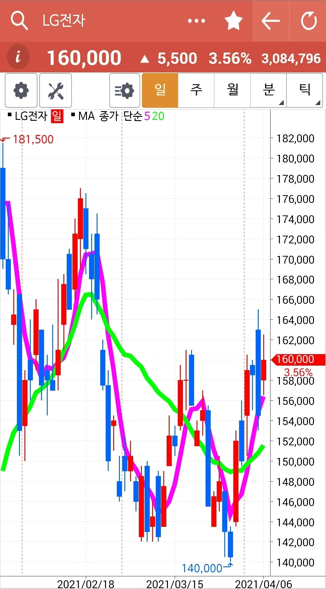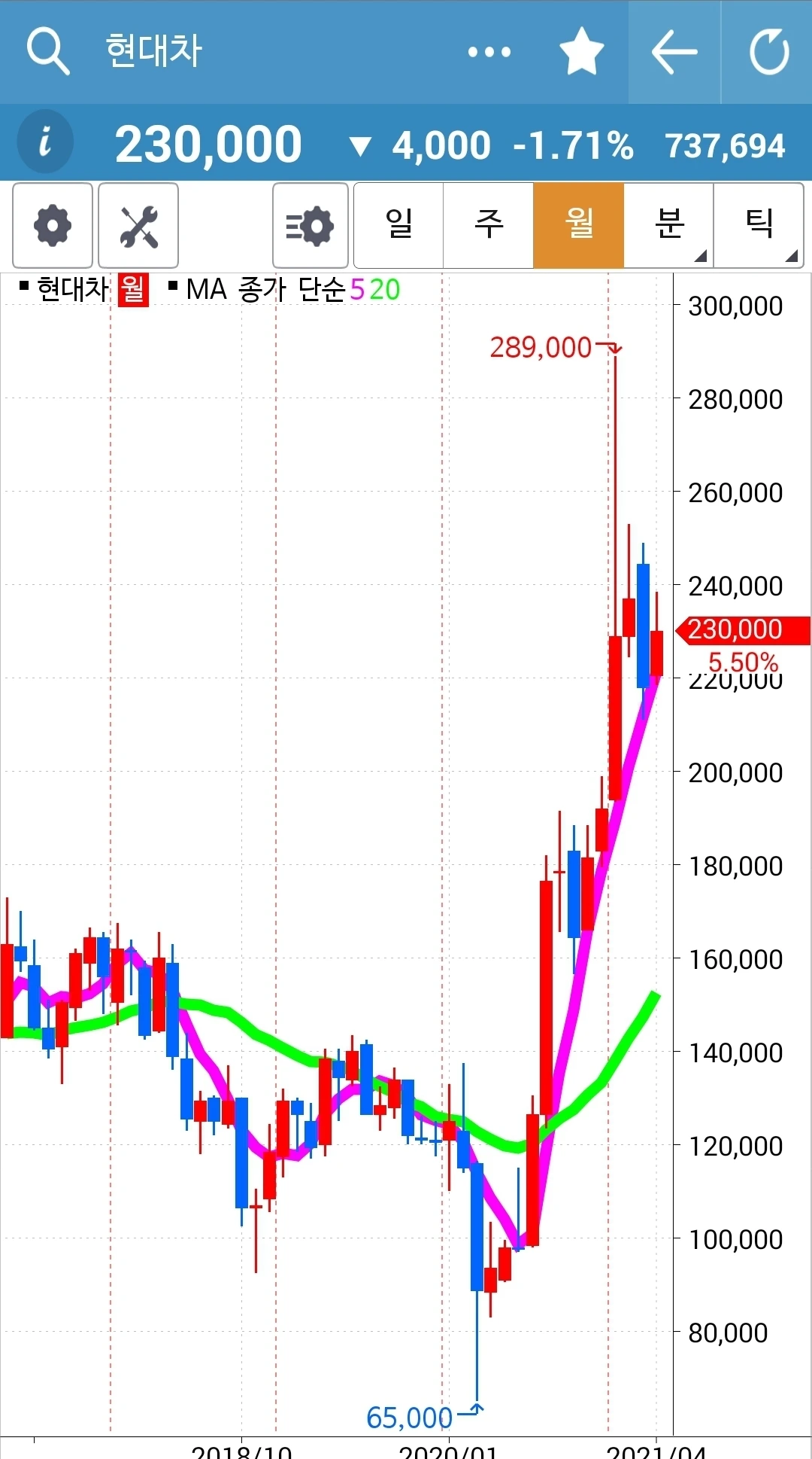 예쁘게 착착 올라가고 있는데 반을 정리했다. 이것저것 다 경험해보고 싶어서. 하하 그러나 사실 월봉을 보면 바로 이 종목이 시작하고 있는 종목이지 현대차는 월봉상으로도 많이 올랐다. 에고 어찌 될까? 잘 지켜보자. 어쨌든 5일선이 20일선 위에 있는 한 안심이다. 난 그것만 할 줄 알면 된다.