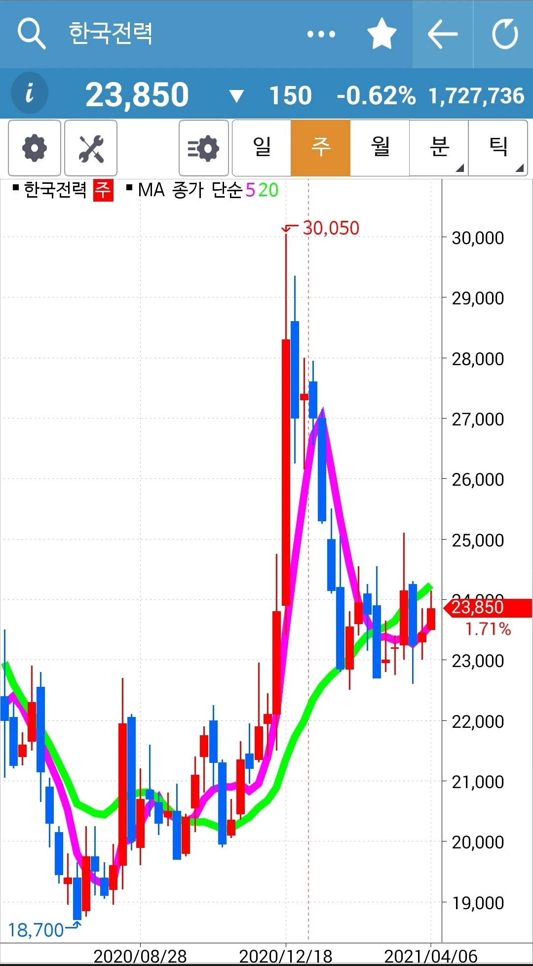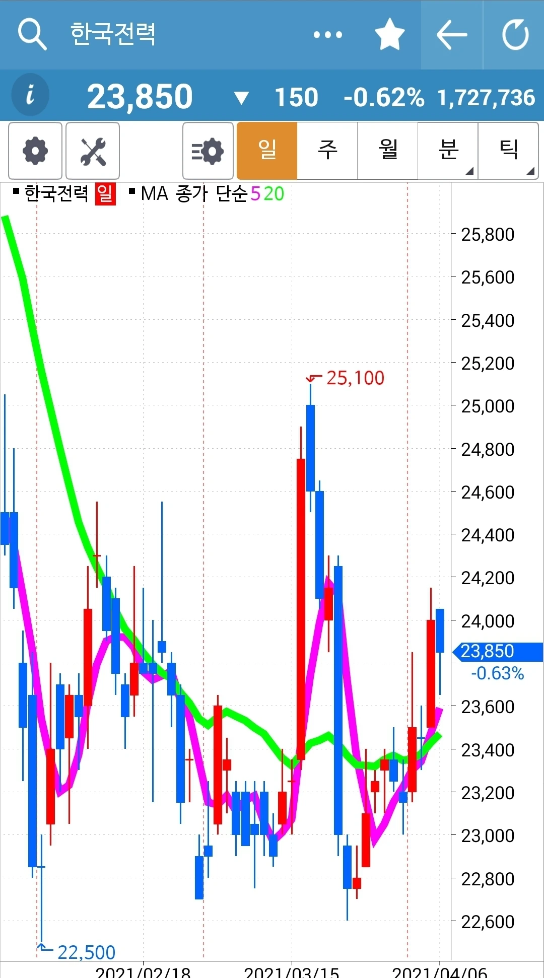 캬~ 이렇게 나의 사랑을 배신할 수가. 5일선이 20일선을 빵! 뚫고 올라오는 멋진 모습에 반해 무조건 품에 안았건만 그날부터 주르륵 3일째 음봉을 기록하며 나의 속을 썩인다. 에잇. 5일선이 20일선 밑으로만 내려가 봐! 그대로 탈락이야. 파이팅! 알아서 잘 올라가셔~
