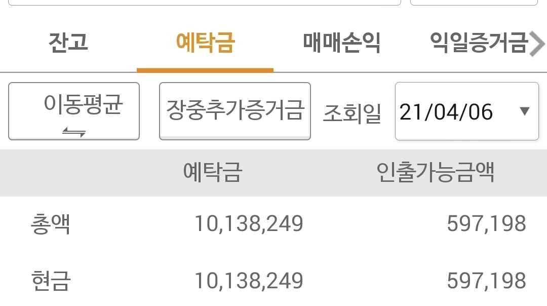 사진 3. 선물 주식 예탁금. 겨우 1000만 원대를 유지하고 있다. 1600만 원을 향하여 파이팅!