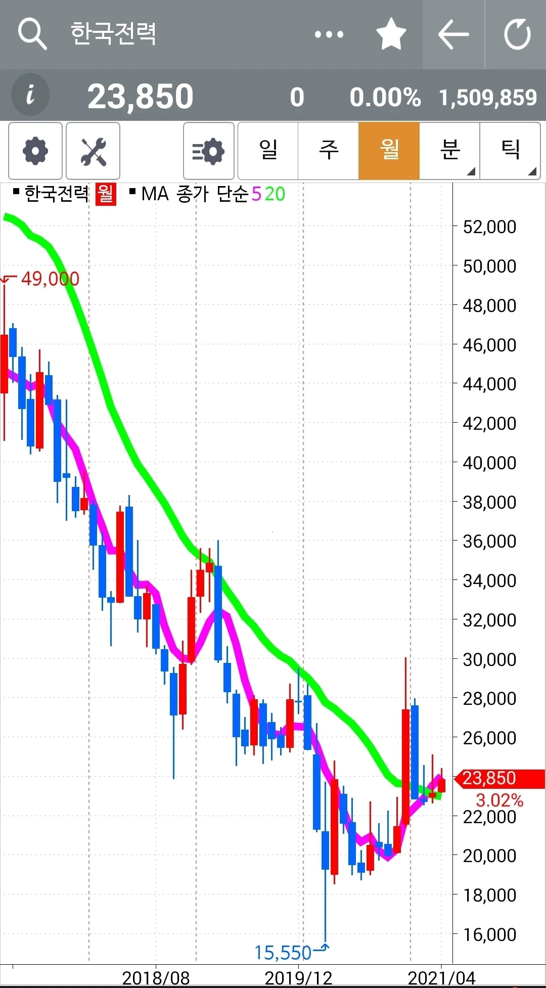 난 이 차트의 월봉이 그렇게 매력적일 수가 없다. 그야말로 몇 년 만에 처음으로 5개월선이 20개월선을 위로 뚫었기 때문이다. 그러므로 5일선이 20일선 위에 있는 한 난 자꾸 이것에 눈독을 들이게 된다.