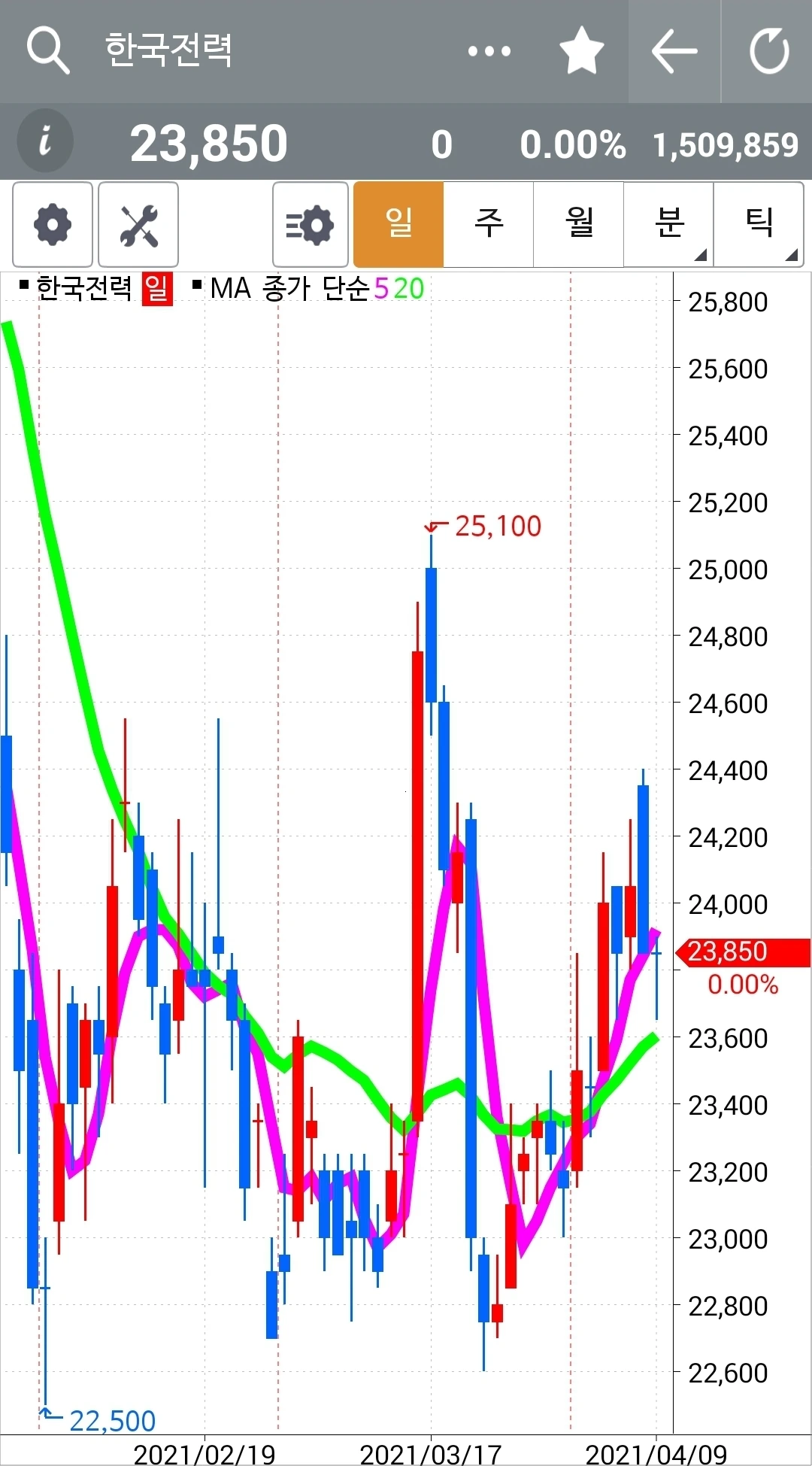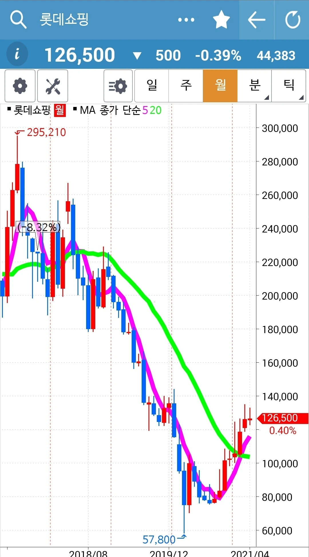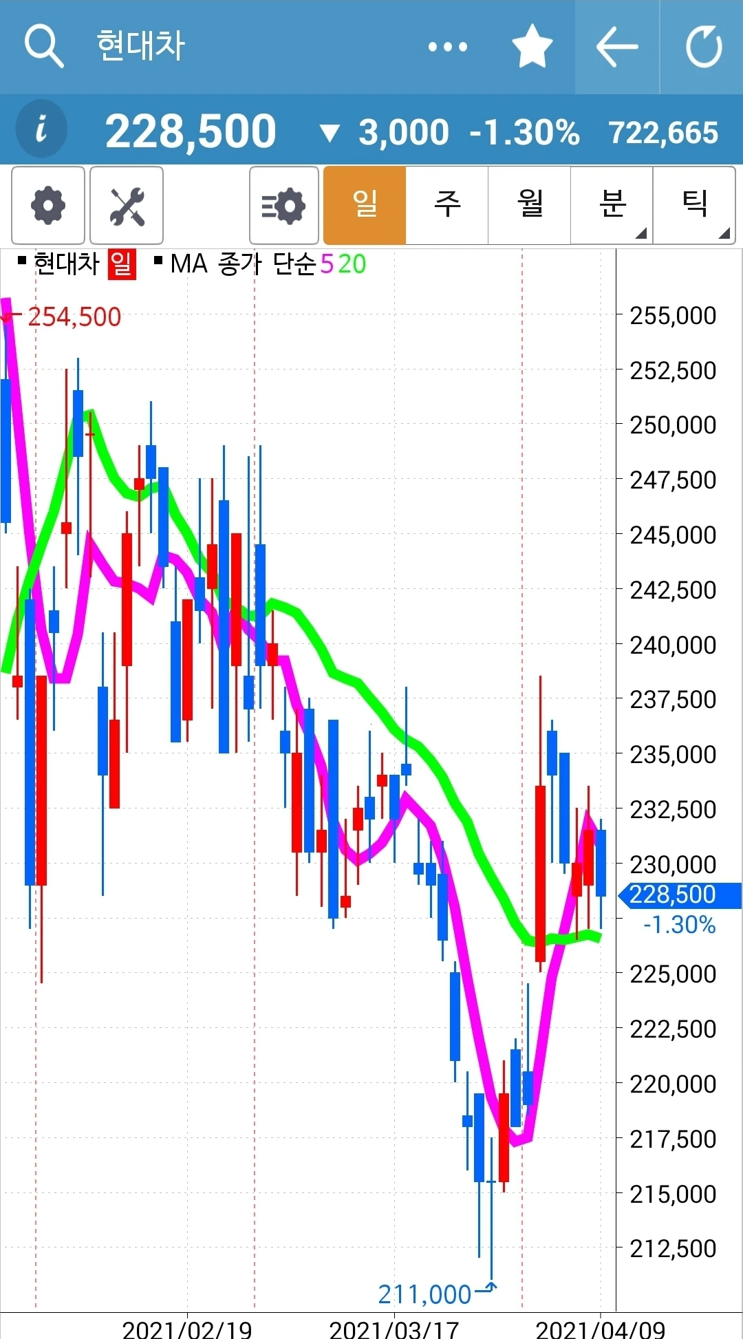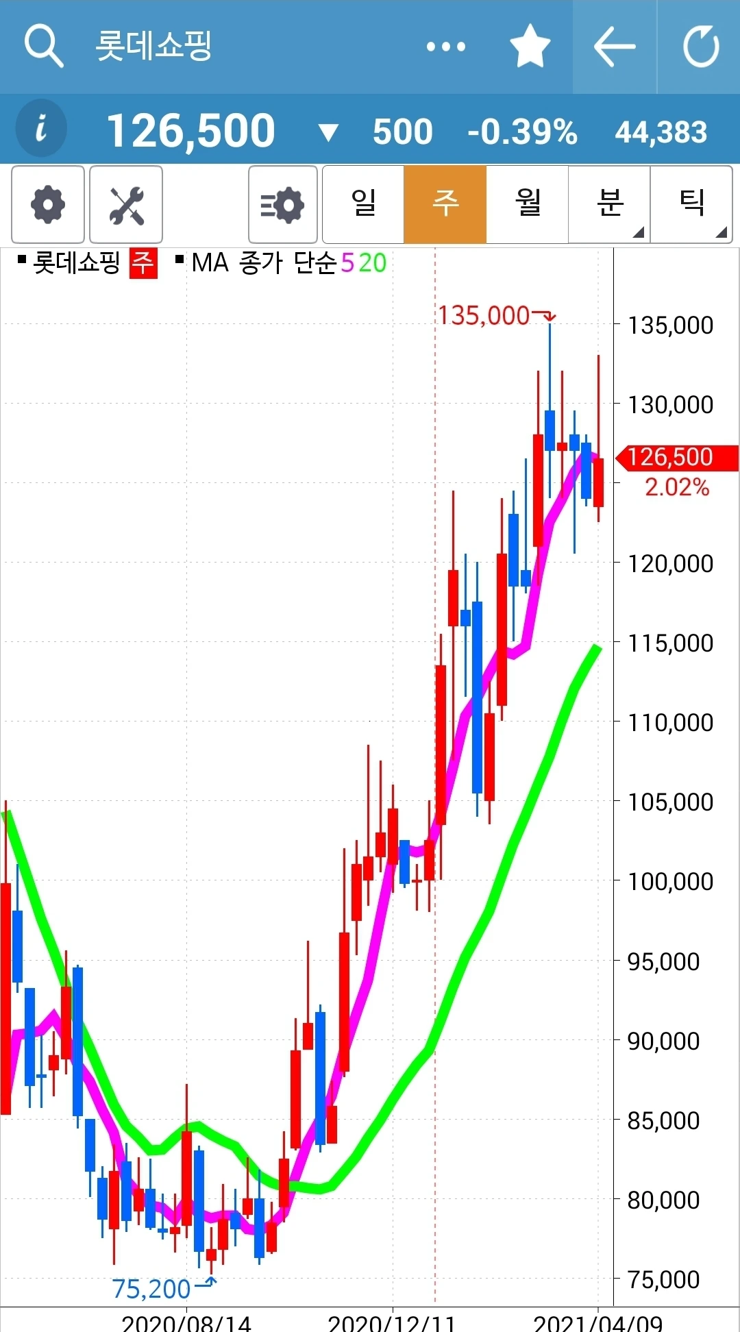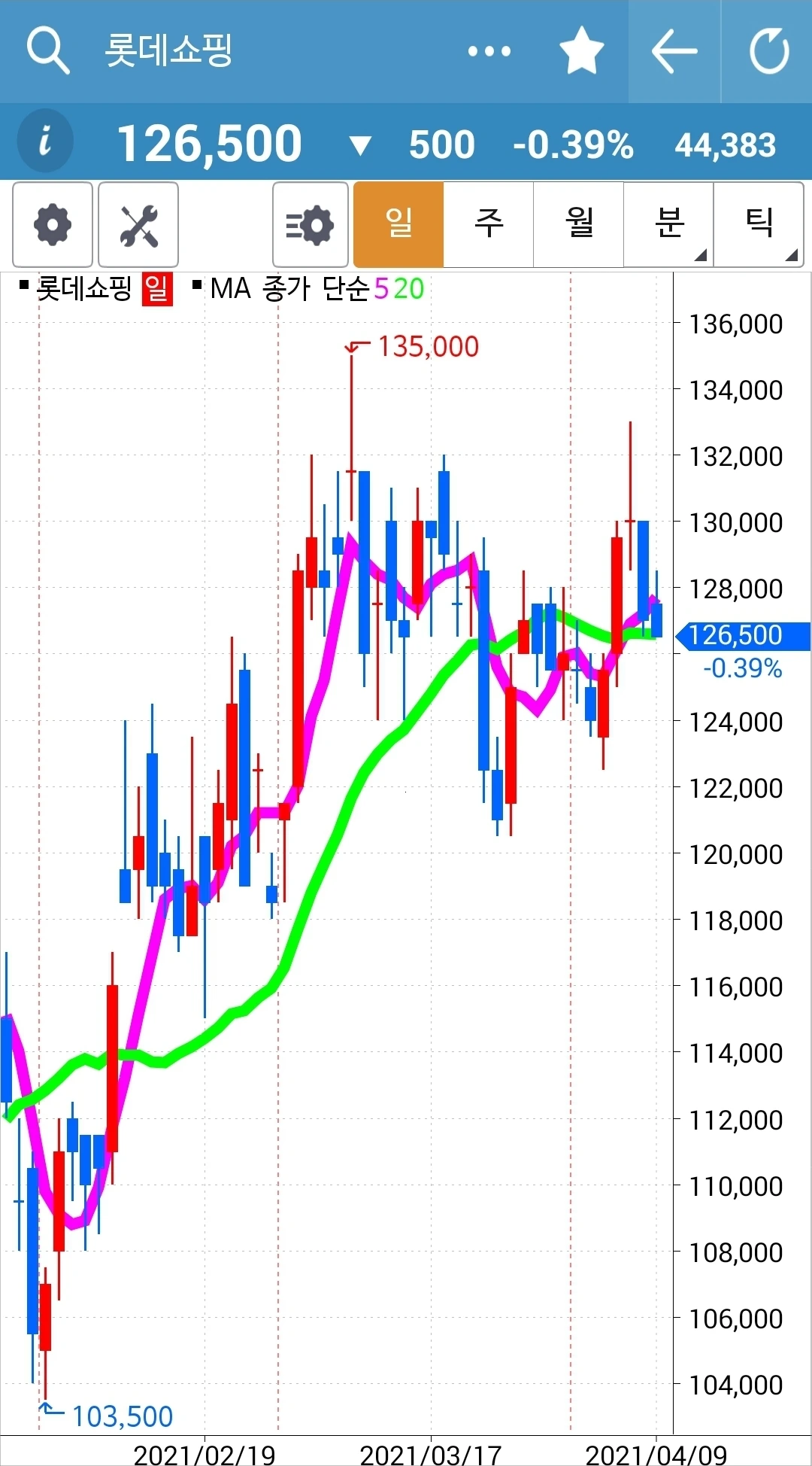 이것 역시 내가 사랑하는 월봉의 모습. 몇 년 만에 5개월선이 20개월선을 빵! 뚫고 위로 뻗어가는 중이고 주봉까지 5 주선이 든든하게 20 주선 위에서 놀고 있다. 그리고 5일선이 20일선 위로 올라온 후 20일선까지 조정 중이니 하하 나의 손가락이 가만히 있을 리 없다. 그래서 파팍! 매수했으나 이날 결과는 손실. 하하 그래도 난 기다려 준다. 빵빵 올라라 멋진 차트의 롯데쇼핑아~ 파이팅!
