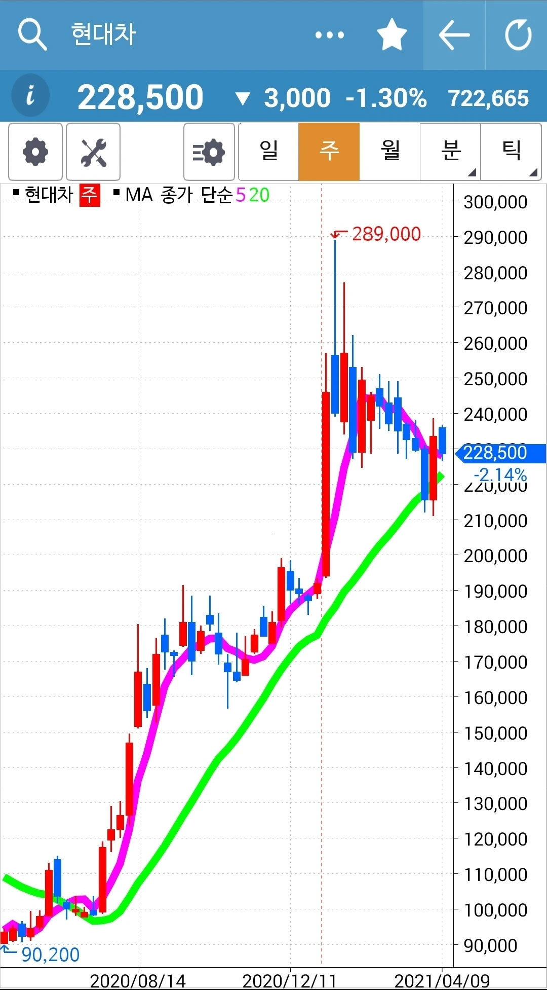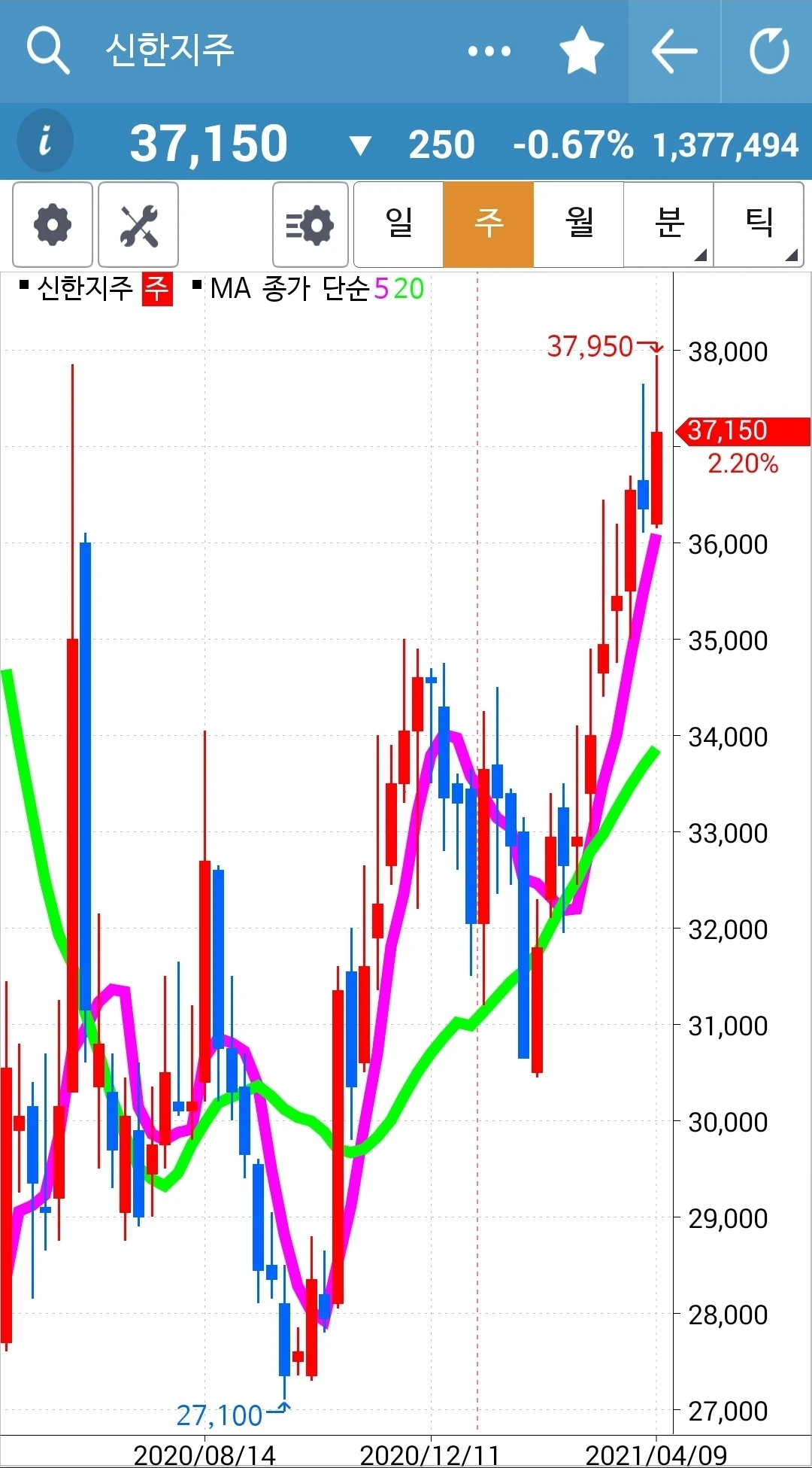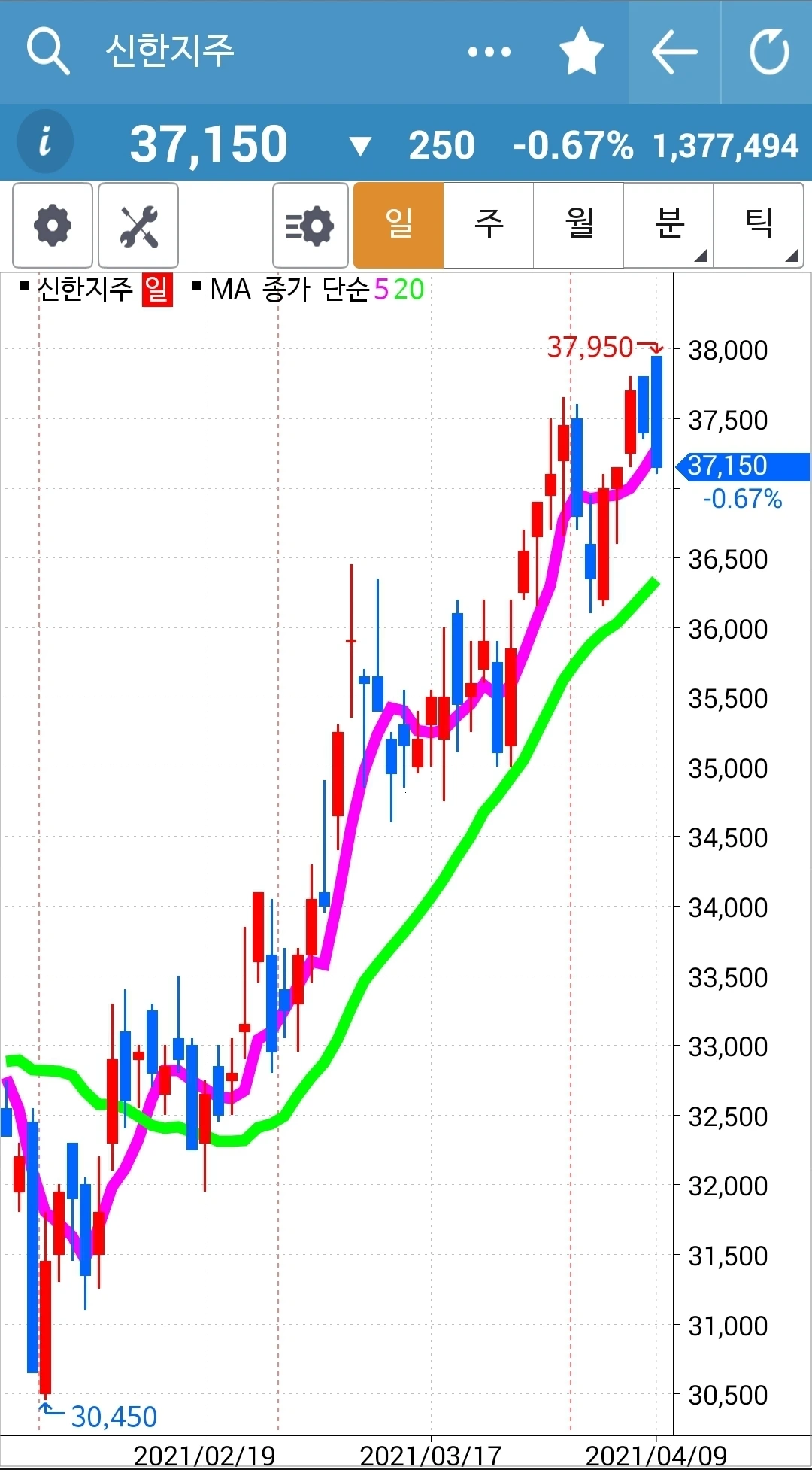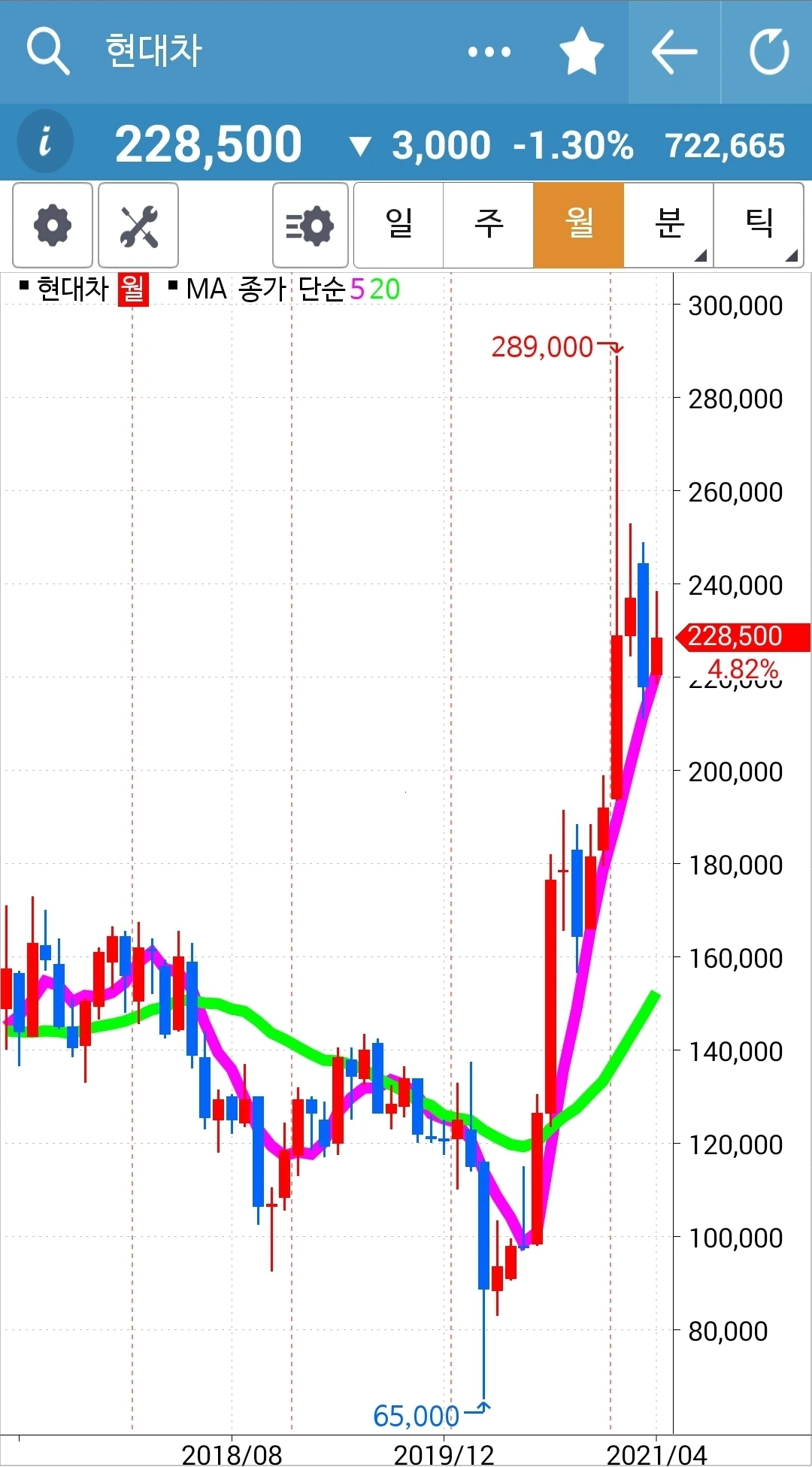 길게 음봉이 나왔으나 아직 5일선이 20일선 위에 있어 안심이다. 주봉도 5 주선이 20 주선 위. 월봉도 5개월선이 20개월 선 위. 아주 힘이 좋다. 파이팅.