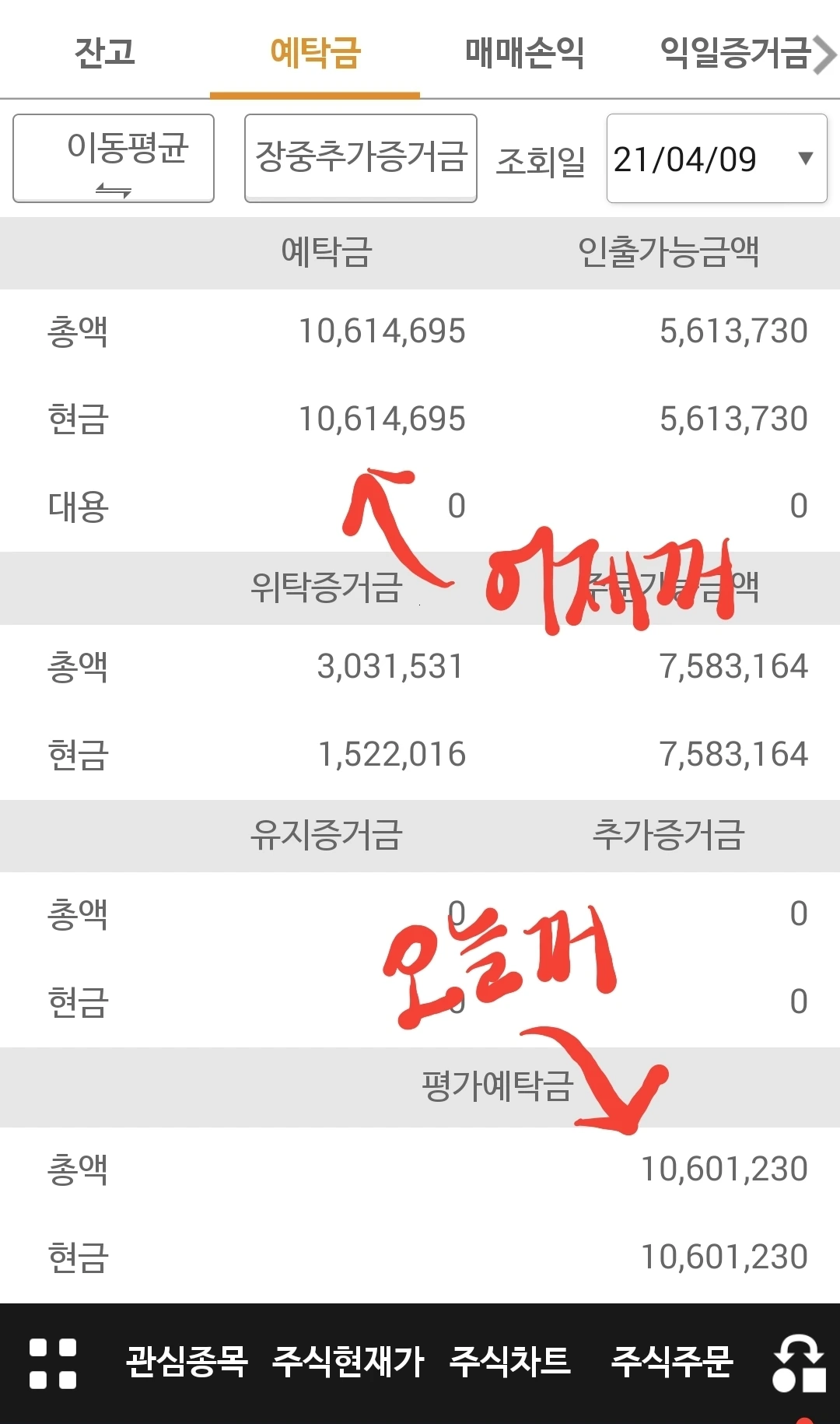 3. 선물주식 예탁금. 장 끝나자마자 금토일 놀기 위해 일단 저장을 해두려니 아직 오늘 꺼가 반영 안 되어 전체를 올린다. 만원 정도의 손실이다. 이걸 1600만 원대로 올려놓자. 파이팅!!!