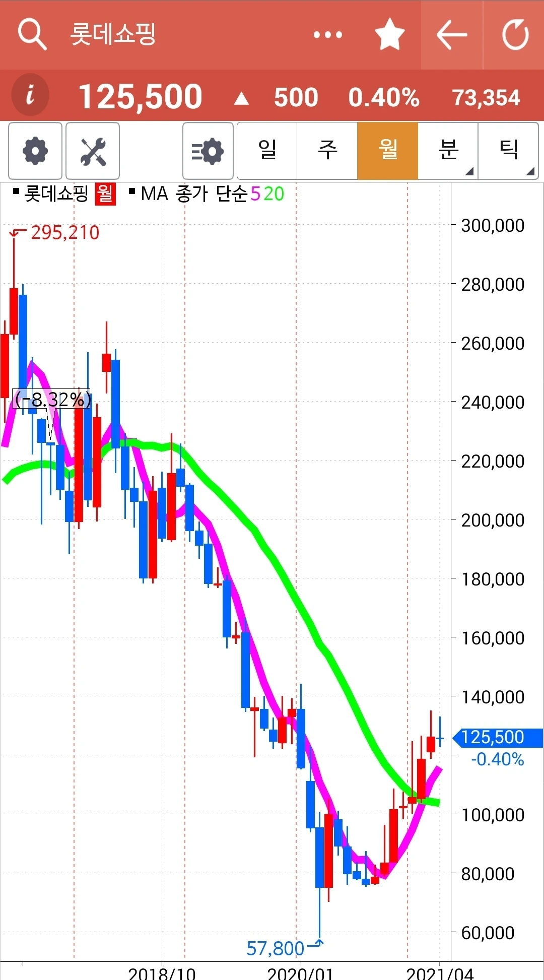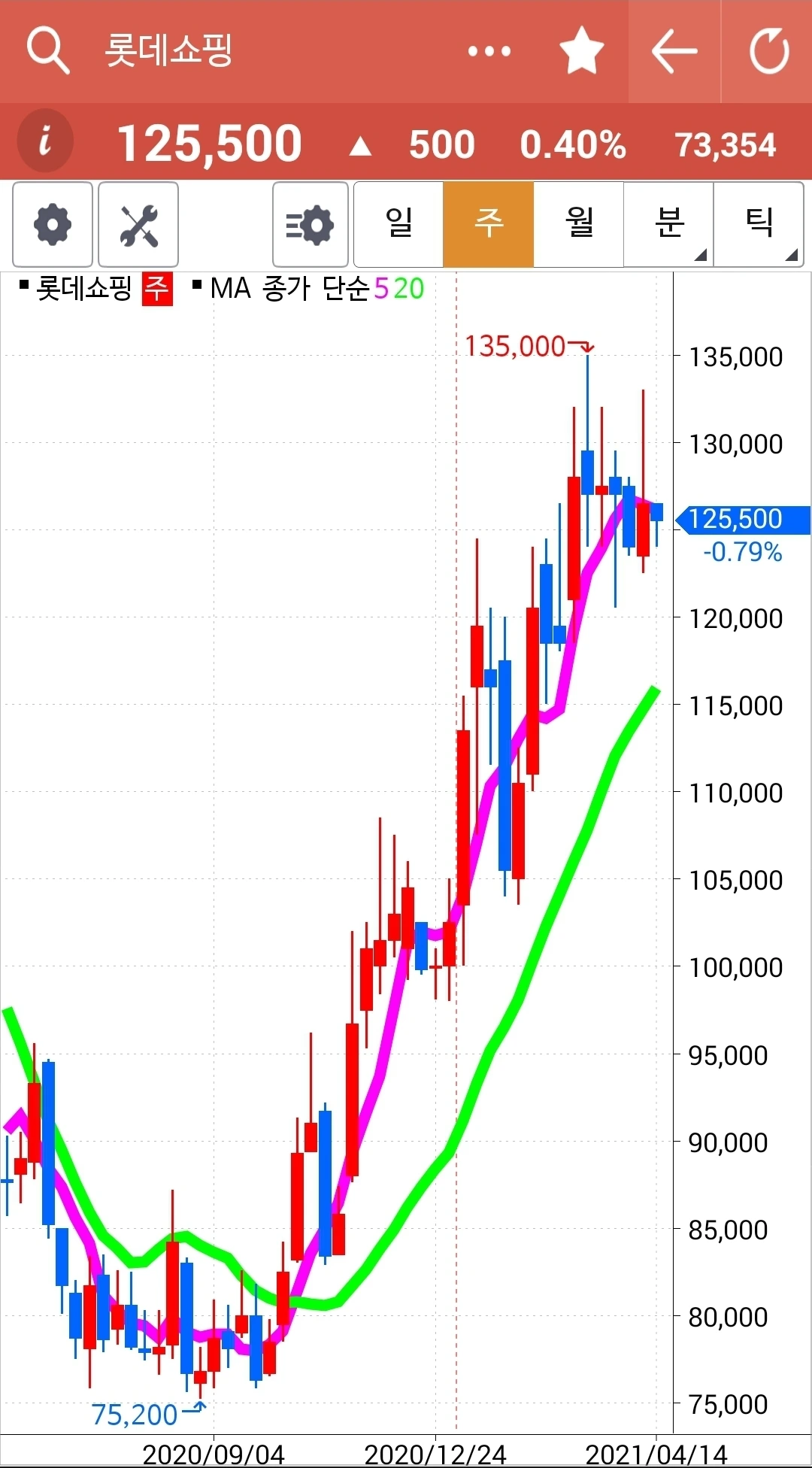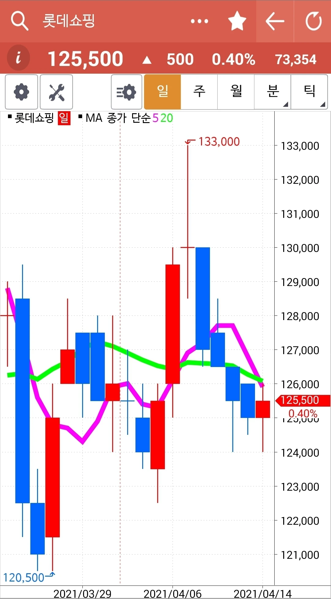 사진 2. 선물 주식. 롯데쇼핑이 탈락했다. 5일선이 20일선 아래로 살짝 내려왔기 때문이다. 살짝 아주 살짝이라 망설였지만 바늘도둑이 소도둑 된다고 변명을 주기 시작하면 안 된다. 나의 원칙은 지켜져야 한다. 에잇 싹둑! 난 생각 없는 기계. 5일선이 20일선 아래로 내려가면 가차 없이 싹둑 잘라내 버리는 기계! 파이팅!