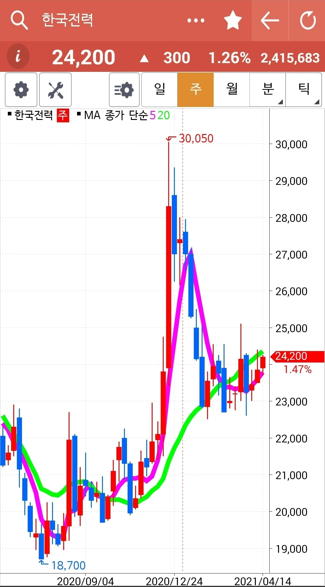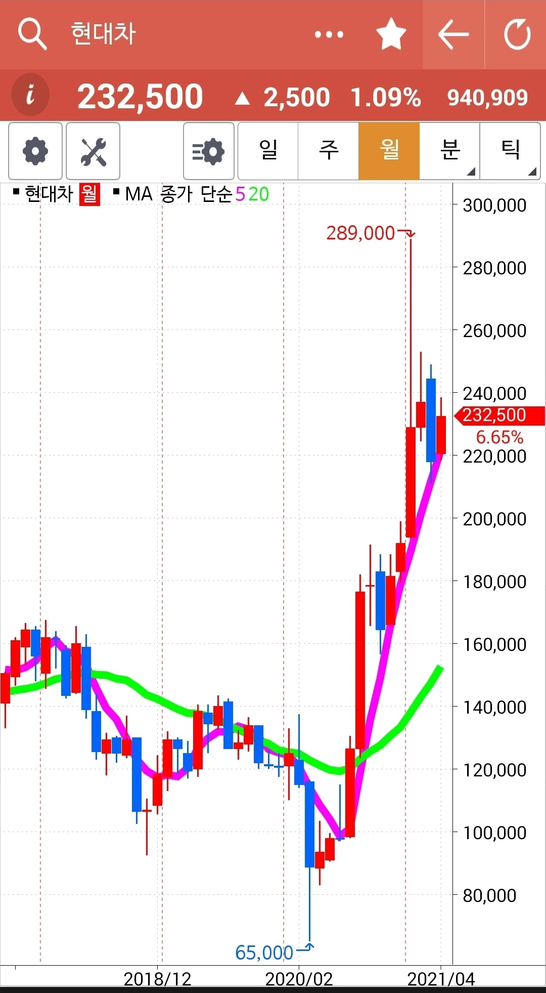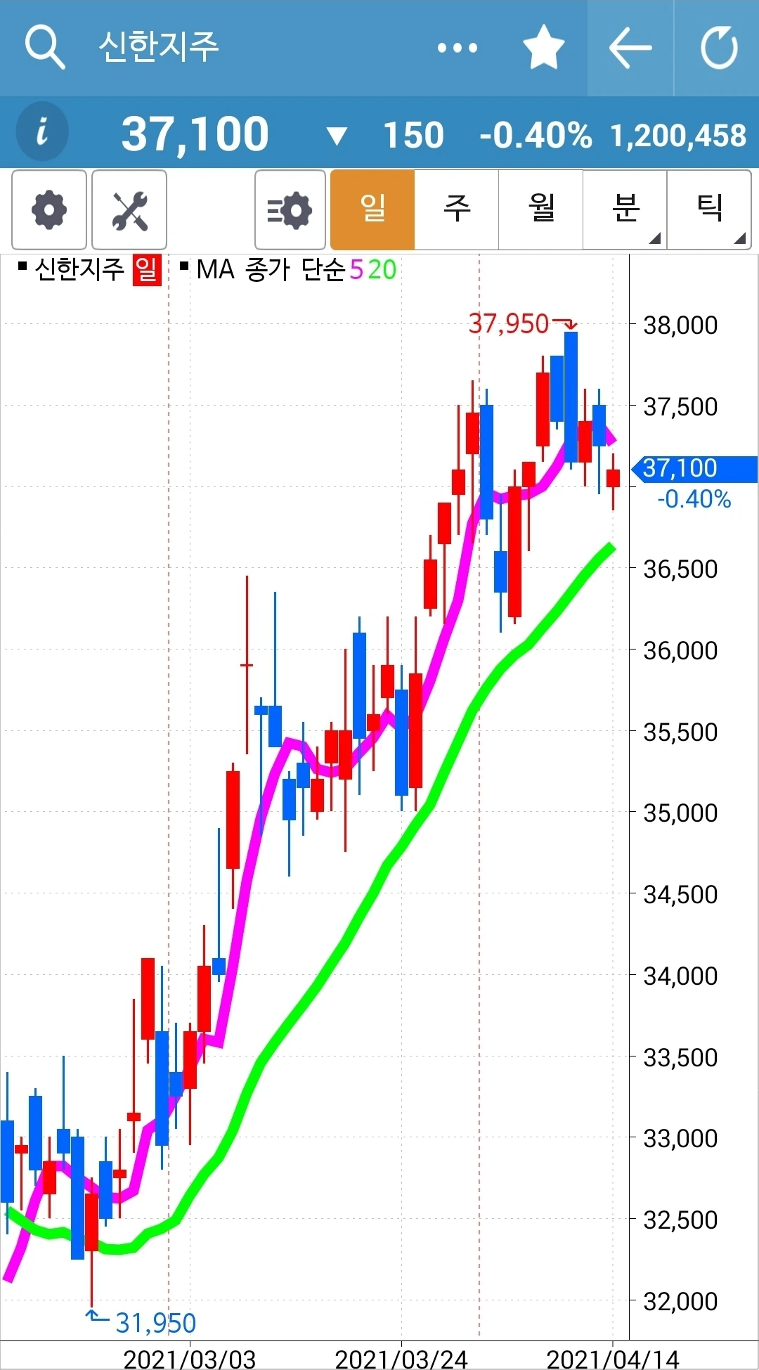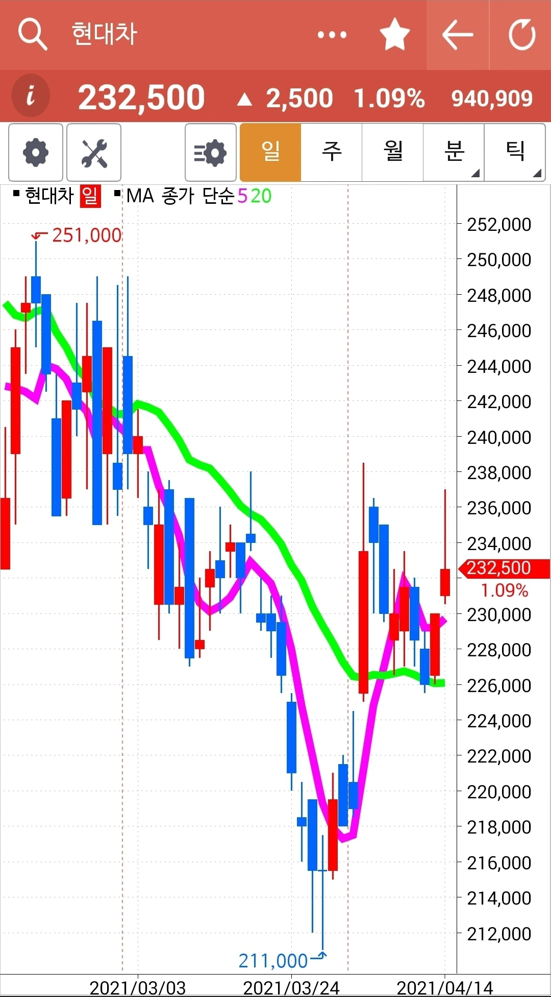 역시 20일선에서 빵 뛰었으나 딱 멈추었다. 어제 가격 고대로. 힘내라 파이팅!