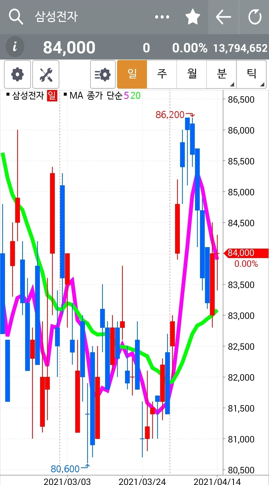 살짝 아주 살짝 정말 코딱지만큼이지만 어쨌든 빨간 5일선이 초록 20일선을 뚫고 내려왔다. 두말할 것 없다. 가차 없이 탈락! 와이? 난 요거밖에 할 줄 모르니까. '난 아무것도 몰라요~ 5일선이 20일선 아래로 내려오면 매도할 뿐야요~'