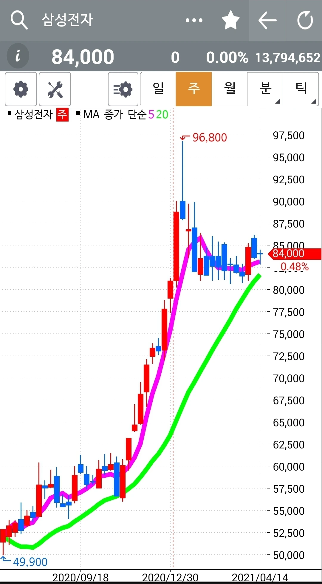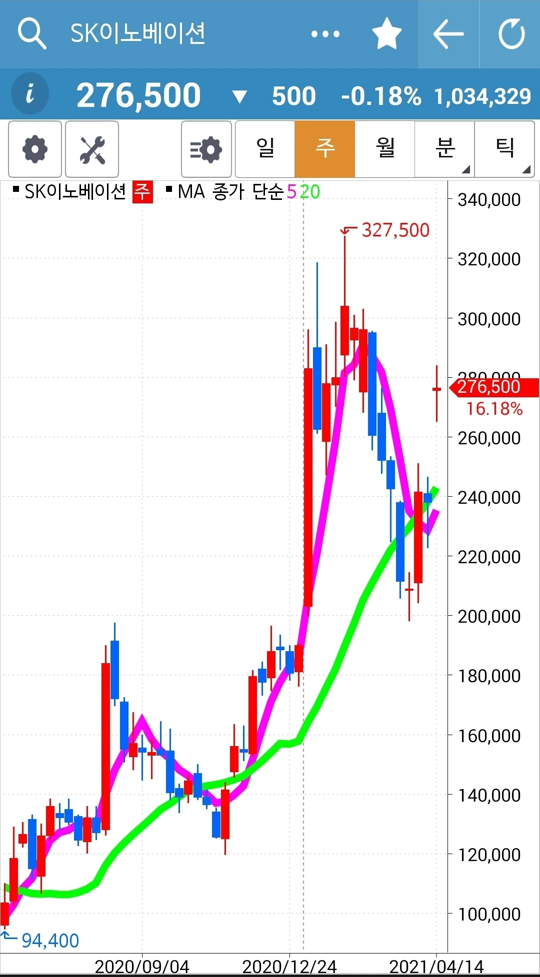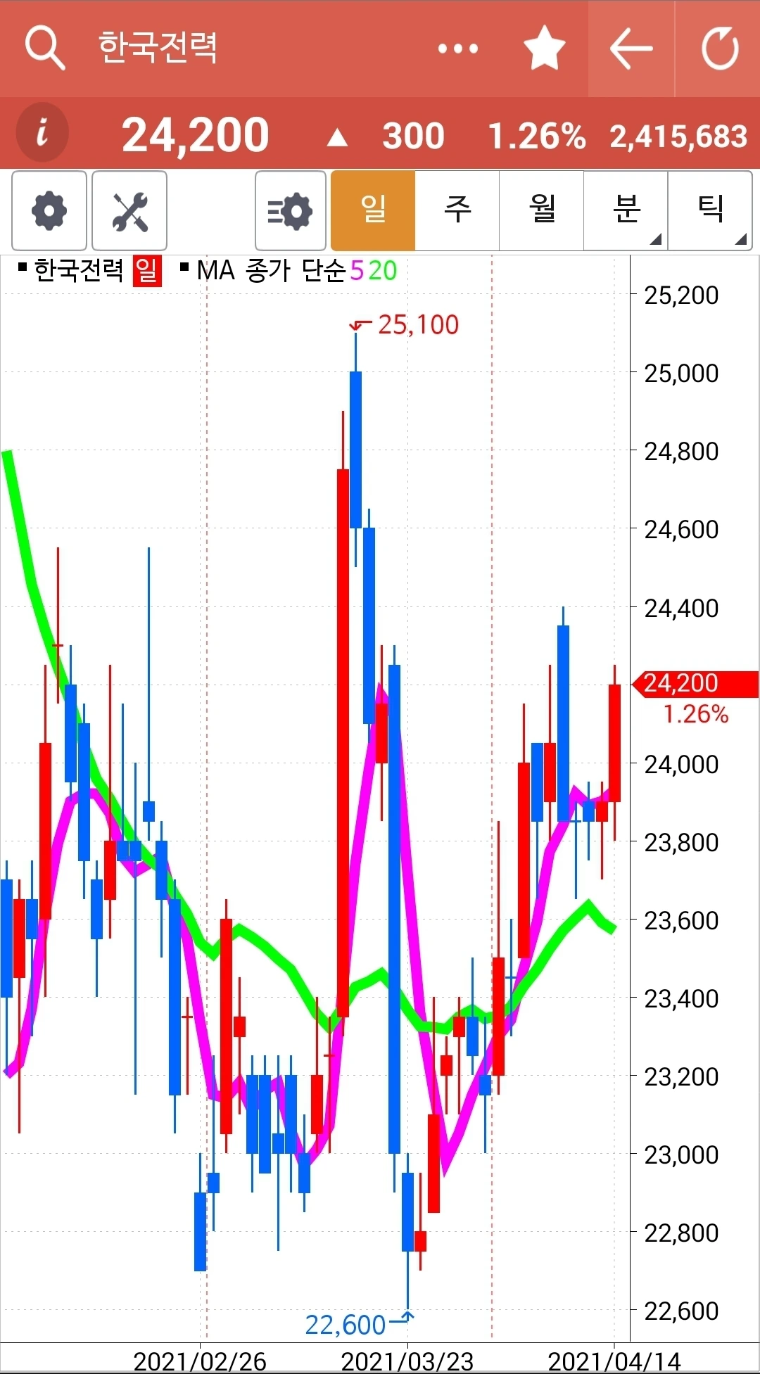 예쁘게 잘 올라가고 있다. 아쉬운 건 전 고점을 넘기거나 밀리지 않고 몸통이 긴 양봉이었으면~ 하는 바람이 남는다는 것이다. 오늘 어떻게 될까? 20일선에서 반등에 성공한 건 맞는데 제발 전 고점을 가볍게 누르고 위로 쭉쭉 뻗어나가 레이~
