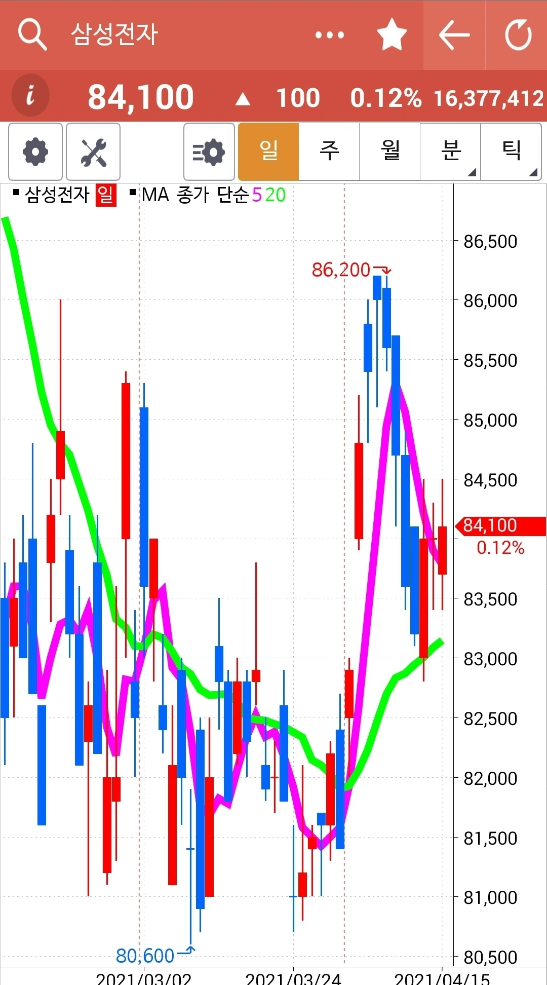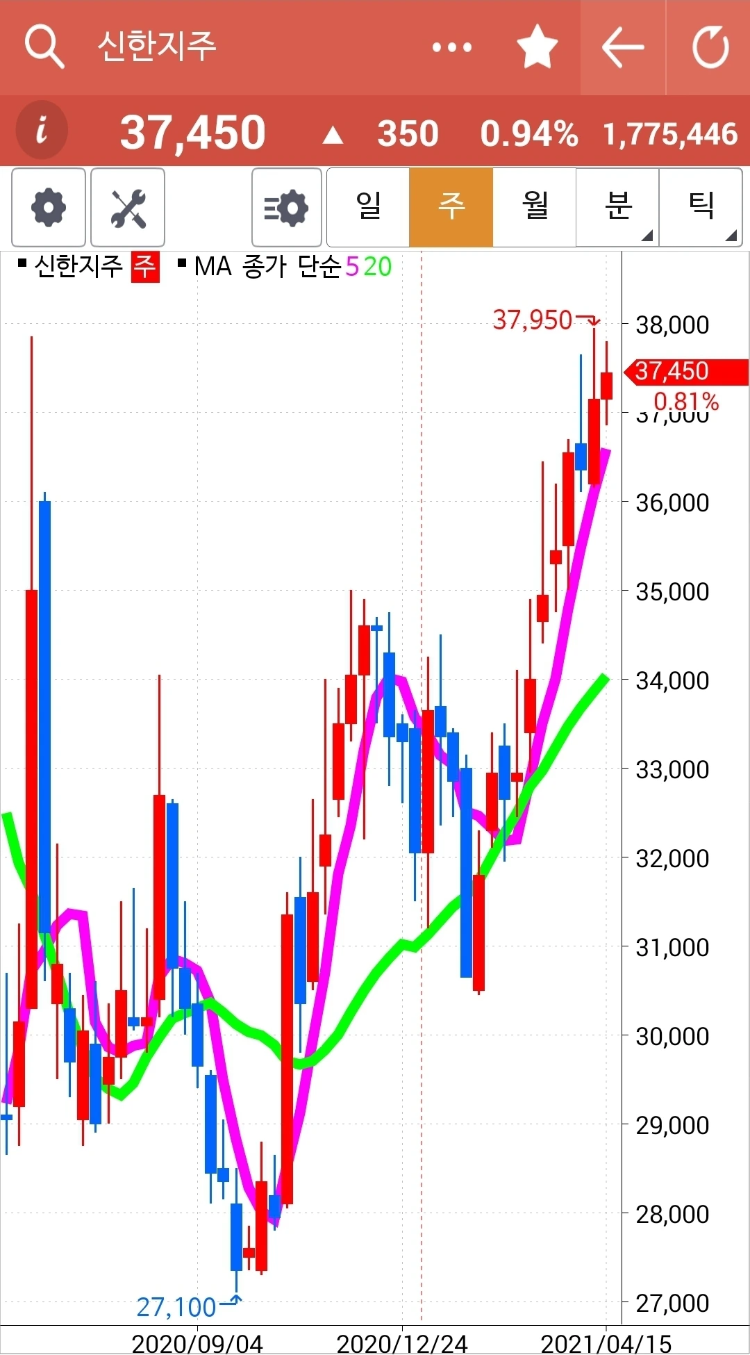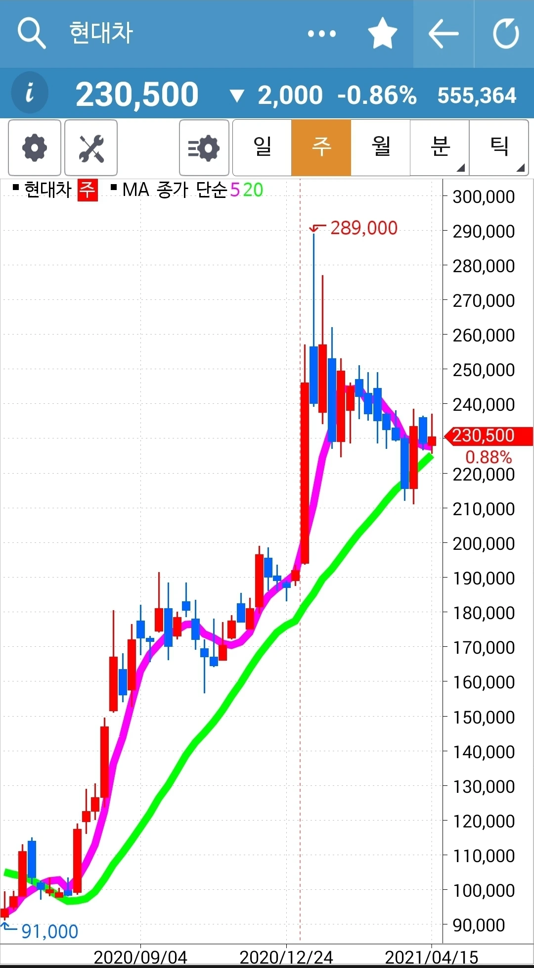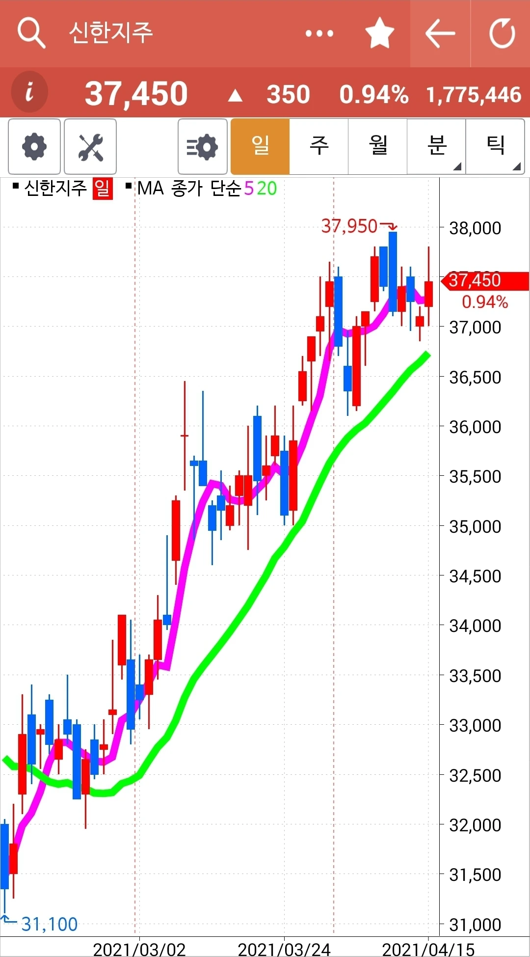 전고점을 뚫고 나서 조정받을 일이지 벌써? 음 살짝 걱정이 된다. 다시 힘을 얻을 수 있을까? 그러나 주봉은 정말 맘에 드는 모습이다. 하하 거기 희망을 갖고 기다려보자. 어차피 기다릴 수밖에 없다. 와이? 내가 할 수 있는 거라곤 딱 하나니까. 바로 요거. '난 아무것도 몰라요 5일선이 20일선 아래로 내려가면 매도할 뿐야요~'
