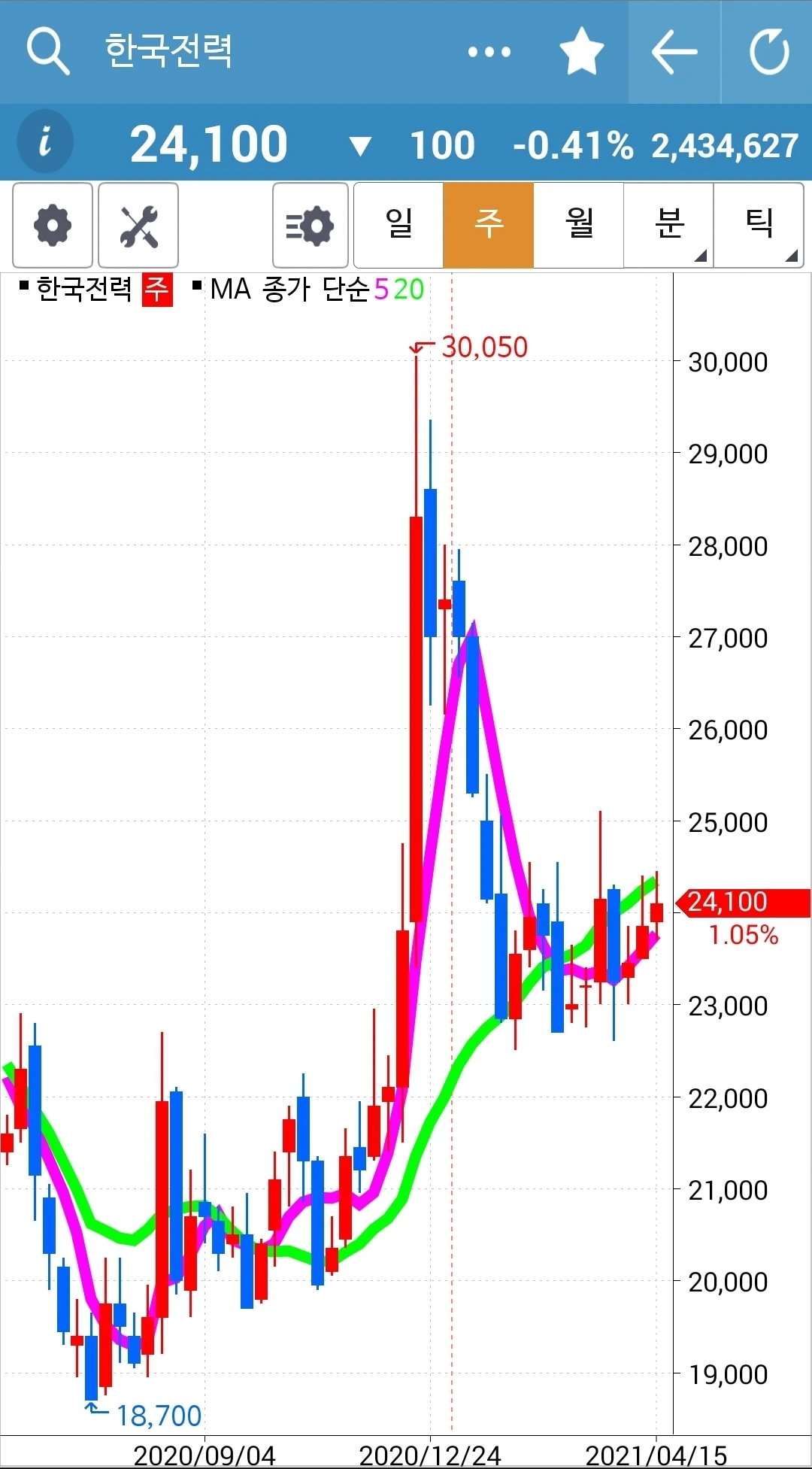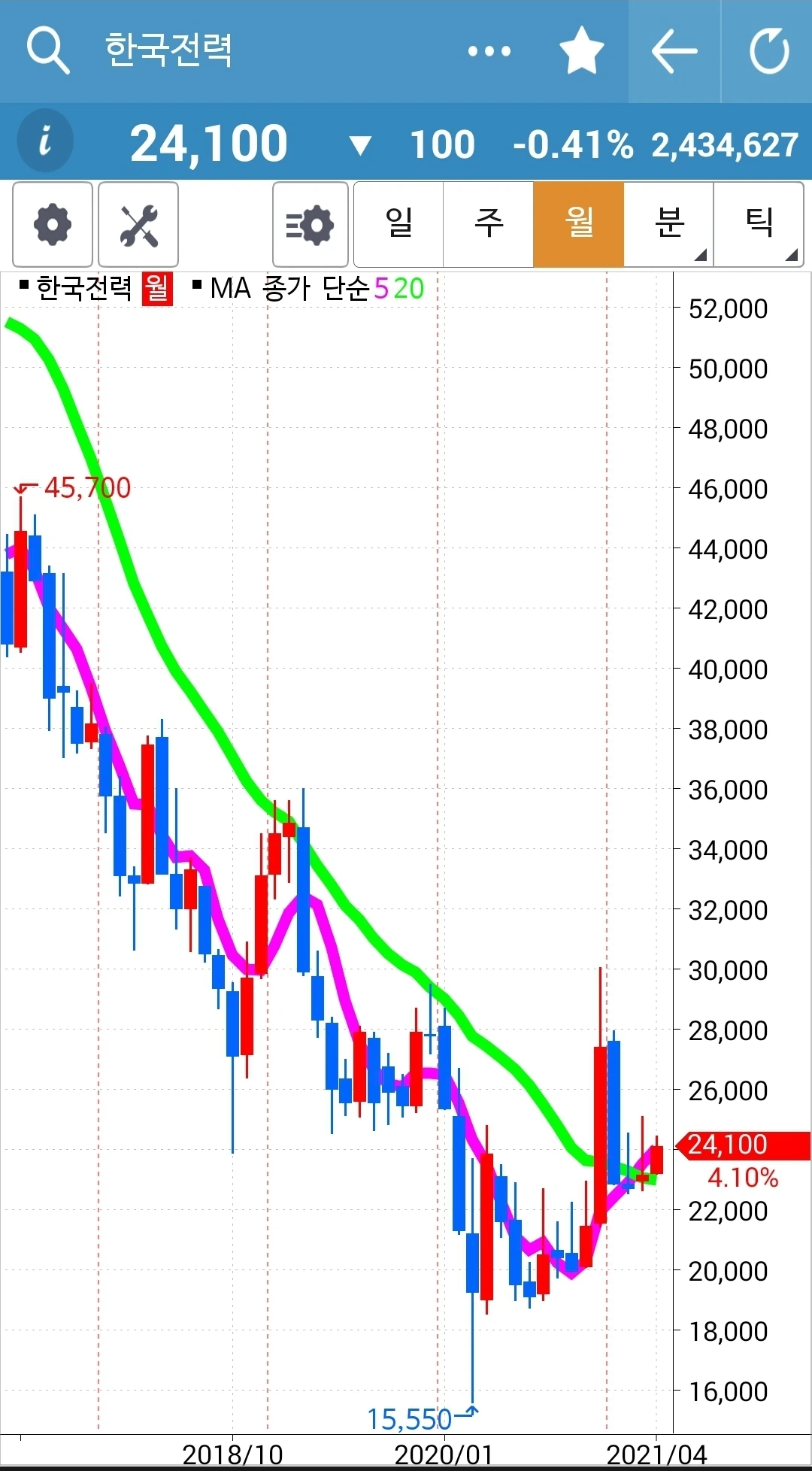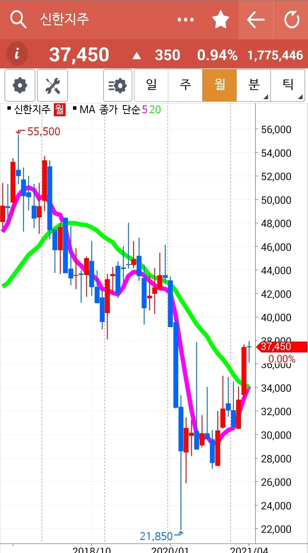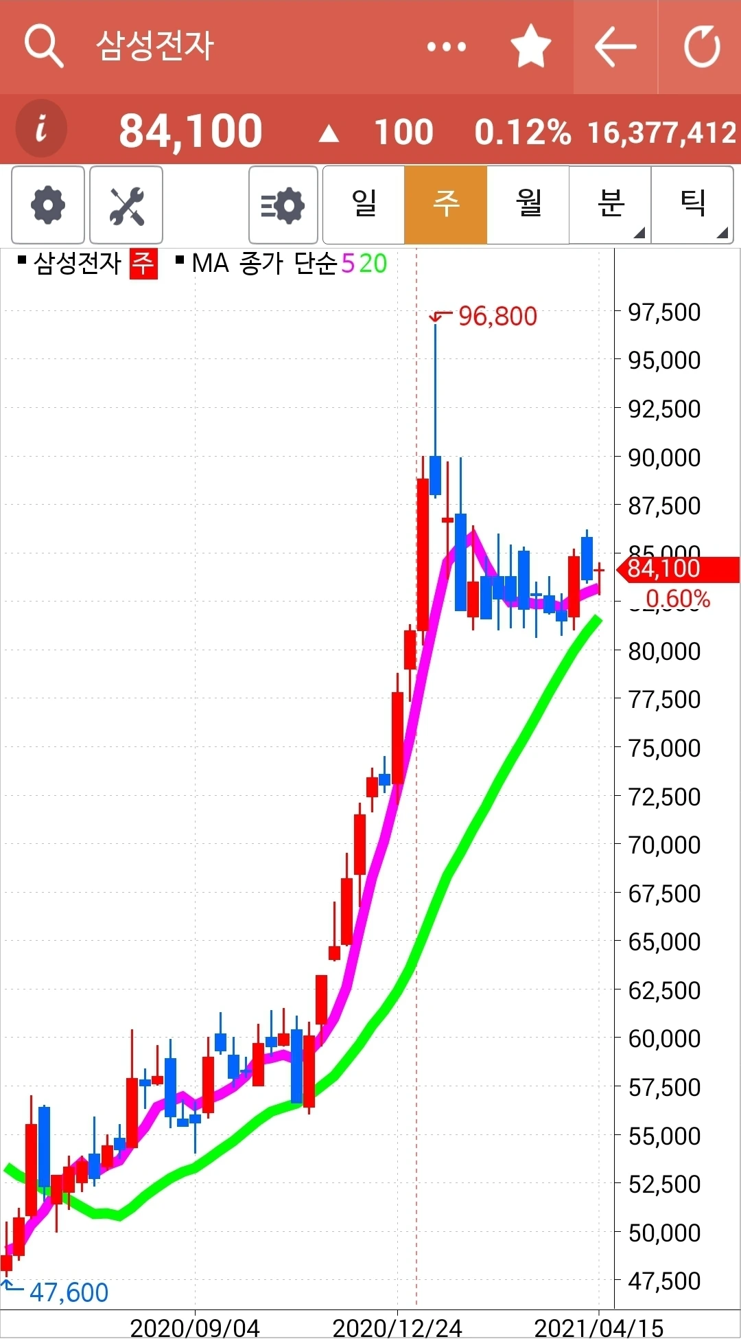 전고점을 뚫고 나서 조정받을 일이지 벌써? 음 살짝 걱정이 된다. 다시 힘을 얻을 수 있을까? 그러나 주봉은 정말 맘에 드는 모습이다. 하하 거기 희망을 갖고 기다려보자. 어차피 기다릴 수밖에 없다. 와이? 내가 할 수 있는 거라곤 딱 하나니까. 바로 요거. '난 아무것도 몰라요 5일선이 20일선 아래로 내려가면 매도할 뿐야요~'