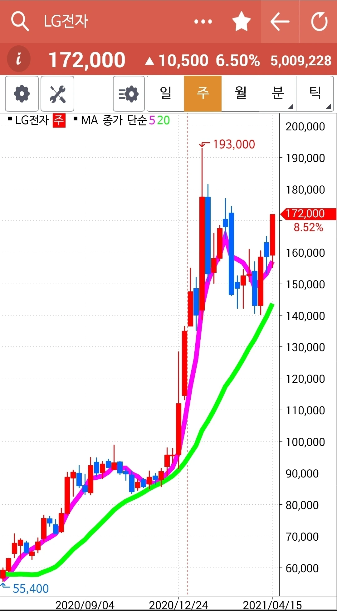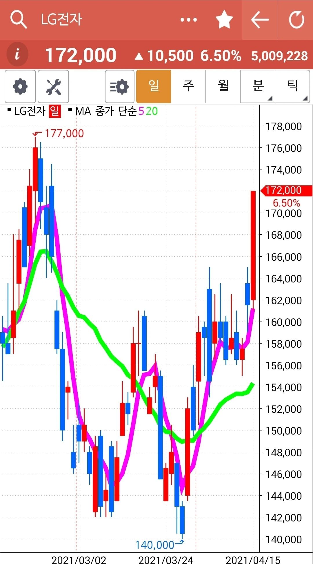 나의 사랑 LG전자. 내가 왜 너를 잊고 있었을까? 문득 보는데 빵! 정신없이 올라가고 있다. 전고점도 훌쩍 뛰어넘고 있다. 이렇게 간다면 이전 고점 177,000원은 반드시 건드리리라. 오케이 매수! 푸하하하 SK이노베이션이고 LG전자고 약간 뒷북인 경향이 있으나 어쩌랴. 이제야 눈에 띈 걸. 마침 롯데쇼핑이 탈락한 현금이 있었고 그걸로 힘차게 올라가는 LG전자를 매수했다. 나의 사랑 LG전자 사랑이 다시 돌아온 것이다. 하하 파이팅!!!
