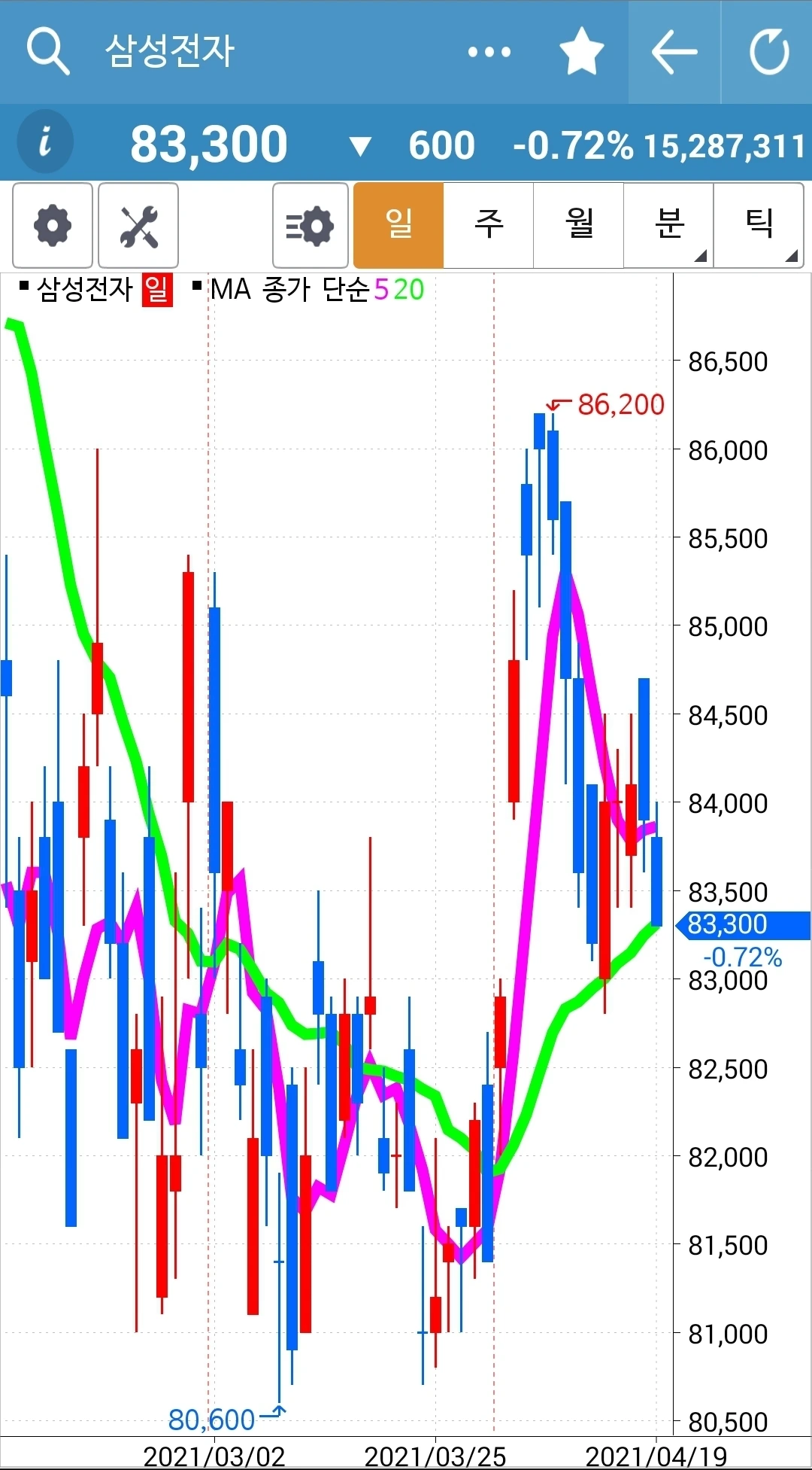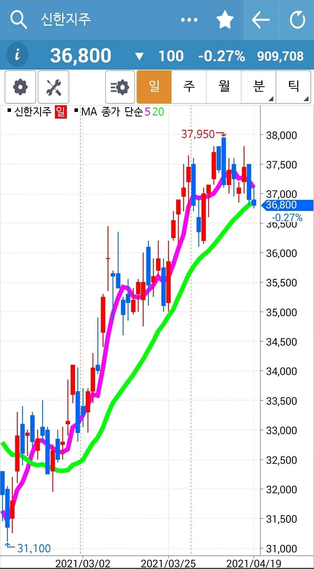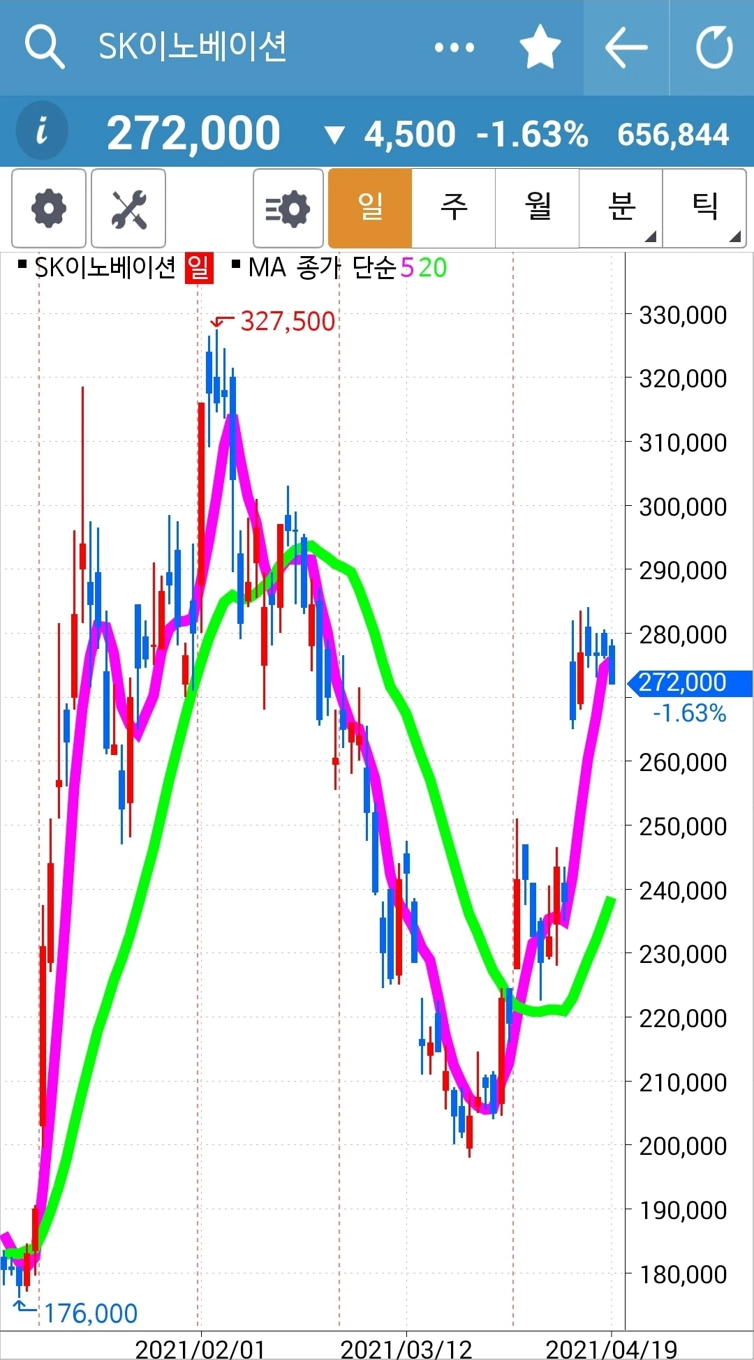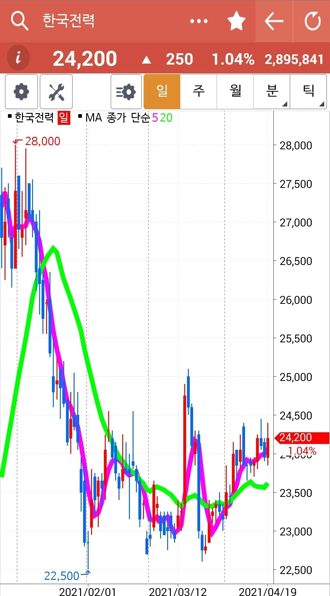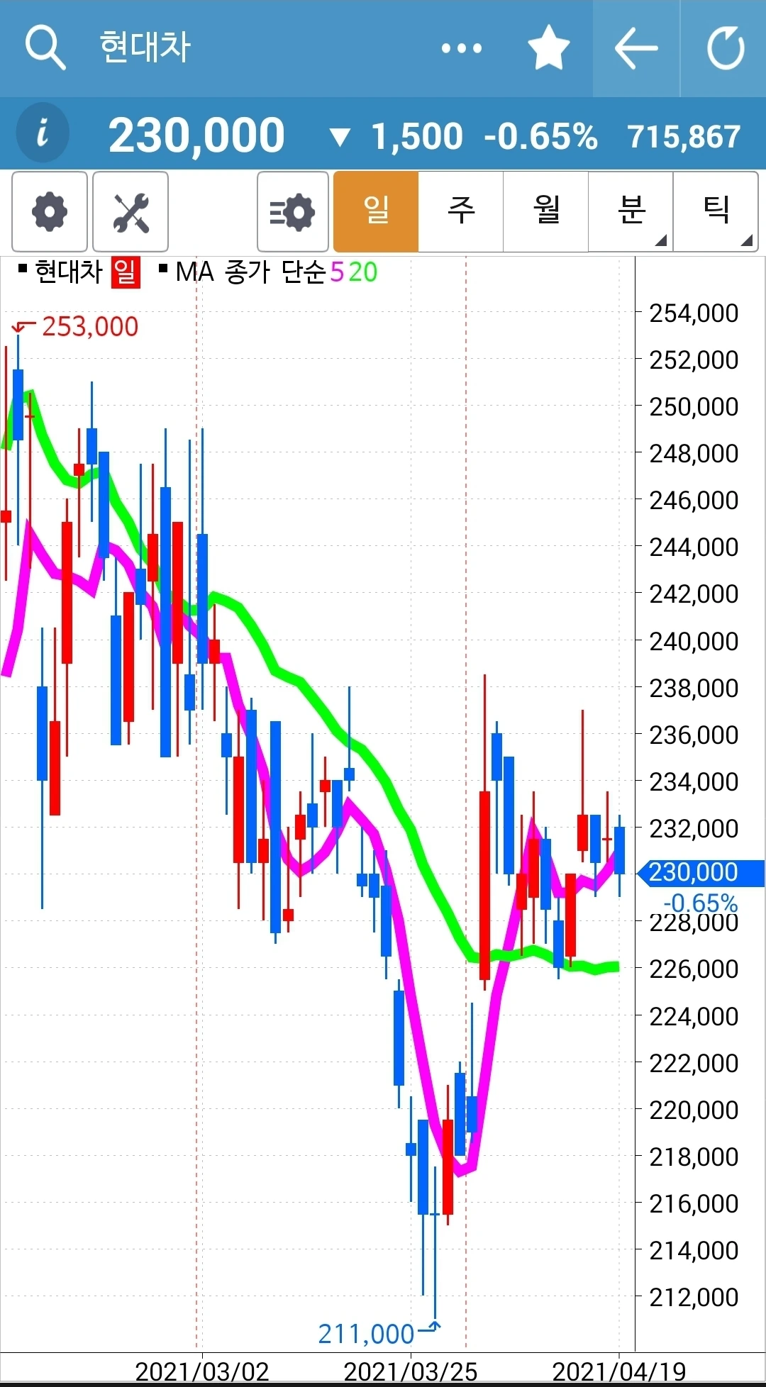 굳이 20일선까지 내려와야만 했을까. 이제 20일 선도 찍었으니 어서 몸을 훽 돌려 위로 빵빵 히 나가거라. 파이팅!
